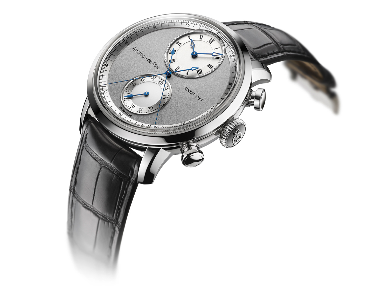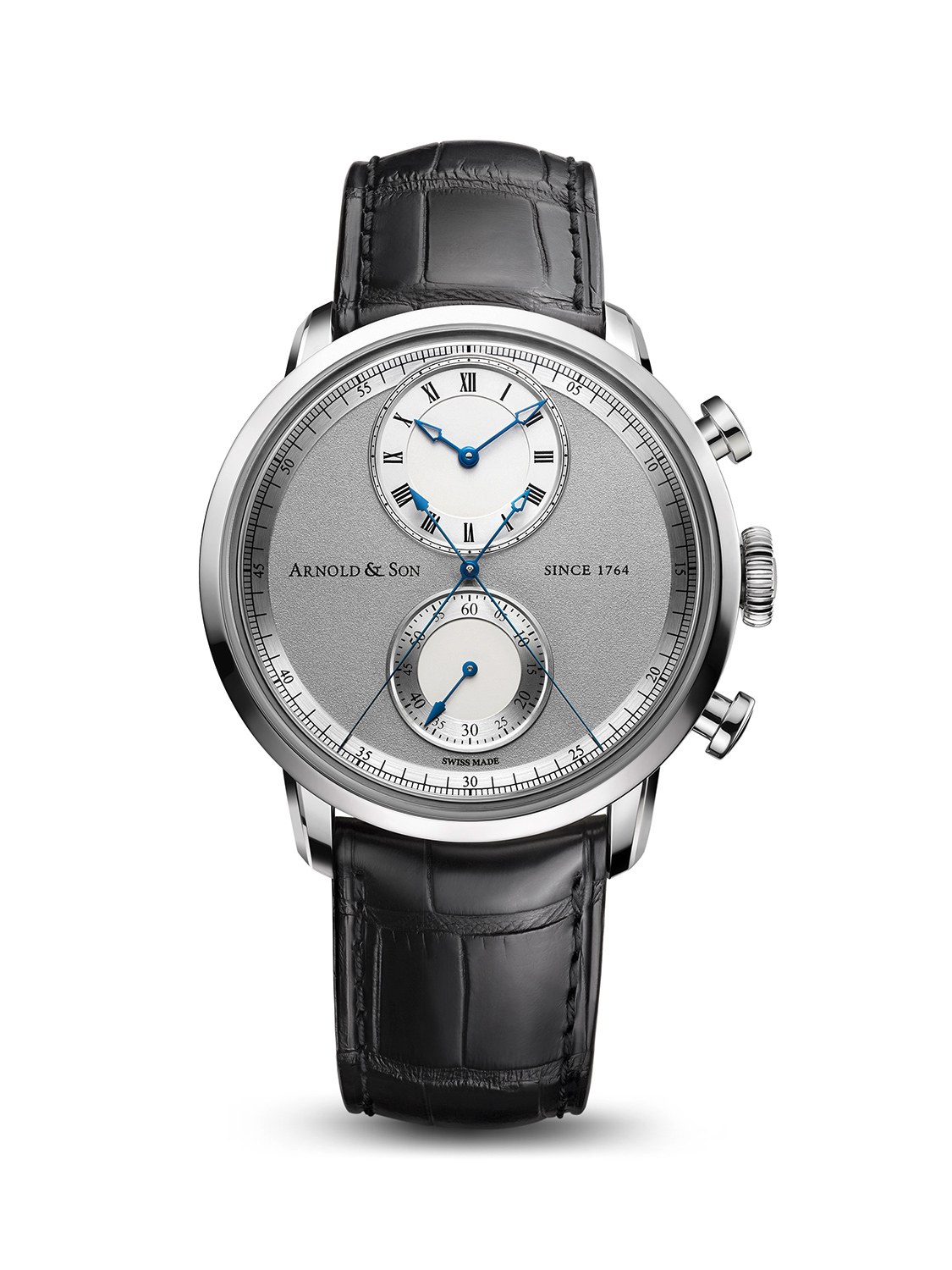 Jeżeli już przy cyferblacie jesteśmy to jest on jasno szary, a okala go srebrny delikatnie błyszczący pierścień z podziałką dla obu sekundników. Główne wskazanie godzin i minut znalazło się na godzinie dwunastej. Skala została oznaczona cyframi rzymskimi. Dla zachowania równowagi, tarcza pojedynczego sześćdziesięciu minutowego totalizatora ulokowana została na godzinie szóstej i w odróżnieniu od wskazania podstawowego, opatrzona jest cyframi arabskimi. Niebieskie, subtelne wskazówki doskonale wpisują się w stylistykę tak zegarka jak i całej kolekcji.