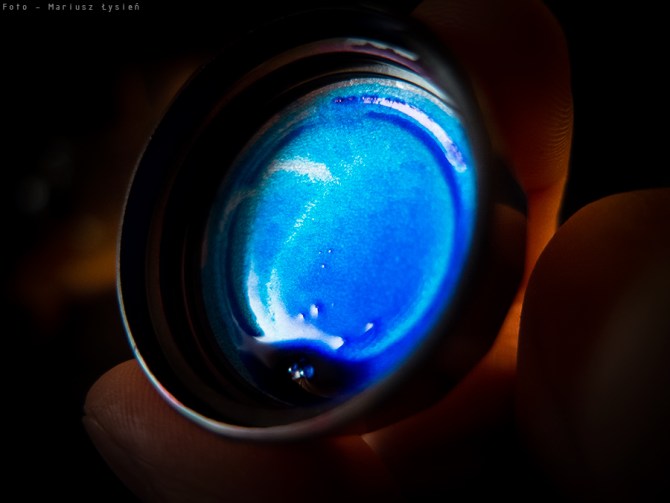 Prze-pięk-na! Tylko tak można o niej owiedzieć. Doskonała prosta forma, wykonana z grubego szkła (z jeszcze grubszym dnem w którego centralnej części wykonano zagłębienie pozwalające wykorzystać atrament do ostatniej kropli. Buteleczka ta bardziej przywodzi na myśl opakowanie perfum, aniżeli atramentu. Na przedniej stronie znajduje się równie prosta etykieta powielająca informacje z opakowania. Całość wieńczy czarna zakrętka, która przewiązana jest srebrnym sznureczkiem. Dbałość o detale jest niesamowita. W końcu mamy do czynienia z produktem przeznaczonym do użytku codziennego. Samo spoglądanie na produkt sprawia przyjemność, jeszcze przed jego docelowym wykorzystaniem tj. przed napełnieniem pióra.