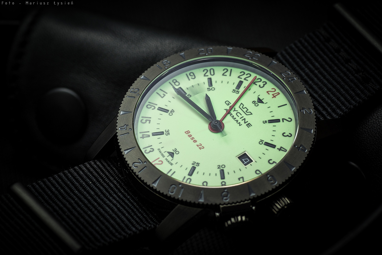 Tarcza została w całości pokryta materiałem luminescencyjnym (Super LumiNowa C3), tak więc w ciemności widzimy wszystkie elementy, które znajdują się na jej powierzchni. Jako, że zegarek ten wyposażony jest w funkcję wskazania drugiej (a nawet trzeciej) strefy czasowej, a która realizowana jest właśnie na tarczy – to jej odczyt również w nocy nie sprawi nam najmniejszego problemu. Trzecią strefę czasową możemy odczytywać za pomocą obrotowego pierścienia lunety, którego obrót możemy zablokować za pomocą koronki umieszczonej na godzinie 4. Tarcza ma stosunkowo prosty design, niemniej pomimo stosunkowo dużego nagromadzenia oznaczeń, jest ona bardzo przejrzysta. Dodatkową funkcją, która z pewnością zostanie doceniona przez wielu nabywców, jest datownik, którego okienko umieszczono na godzinie 3. Wskazówki wypełniono czarną Super LumiNovą, jednak przyznam, że trudno zaobserwować jej jakiekolwiek świecenie – jest to spowodowane dużą jasnością świecenia tarczy i jest to chyba optymalne rozwiązanie. Gdyby oba elementy świeciły równie mocno – zegarek byłby kompletnie nieczytelny w słabym świetle.