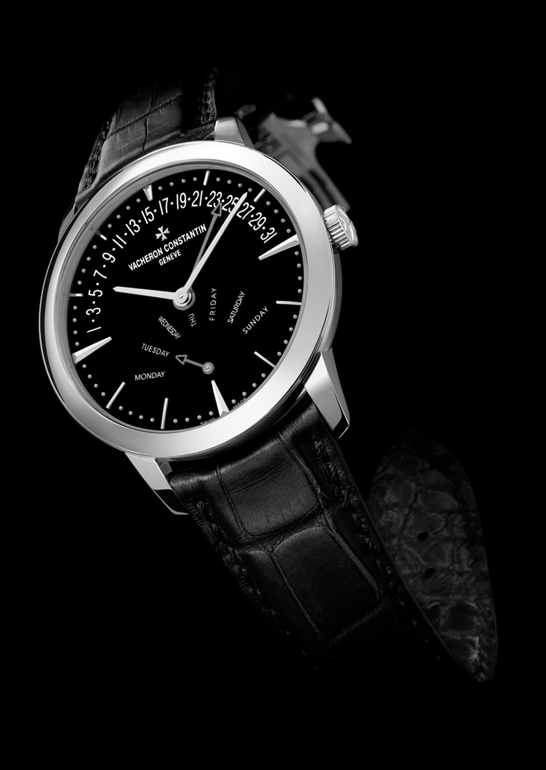 Na czarnym cyferblacie poza wskazaniem godzin i minut odnajdziemy tytułowy „dzień i datę” realizowane jako tzw. „retrograde”, co tłumaczone jest jako „powracająca wskazówka” . Grot wskazówki nie porusza się po okręgu – zamiast tego po dojściu do końca skali powraca ona na pozycję początkową. W tym wypadku pomiędzy godziną 9 i 3 rozciąga się skala datownika, natomiast 8 a 4 znajdziemy wskazanie dnia tygodnia.