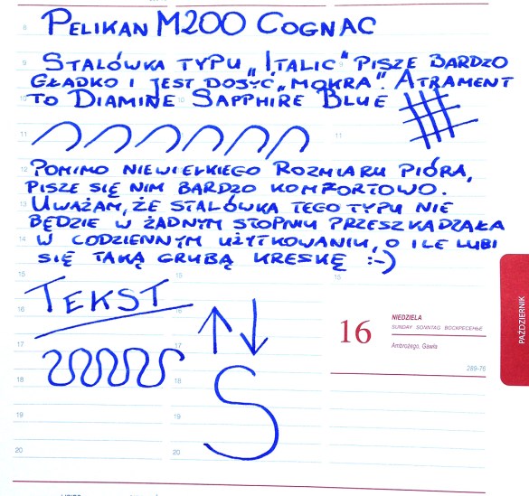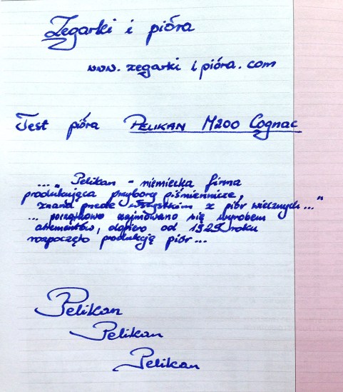 W internecie można znaleźć informacje, że niektóre M200 piszą sucho bądź wręcz skrobią. To dla mnie zaskoczenie bo testowane pióro pisze niezwykle gładko i płynnie, a stalówka na pewno nie należy do suchych. Powiem, że to najlepsza bądź jedna z dwóch najlepszych stalówek wykonanych ze stali, jakimi dane mi było pisać. Właściwie pod każdym kątem – od bardzo stromego ułożenia po stosunkowo płaskie – pisze ona bez przysłowiowego „zająknięcia”. Jednym słowem nie przerywa. Co prawda nie należy ona do elastycznych, ale tego się po niej nie spodziewałem. W ogóle mało firm dziś wykonuje jeszcze stalówki które mogą być uważane za elastyczne. Jednak w tym przypadku uznanie tego za wadę było by zbędnym czepialstwem. Wykonana jest bardzo dobrze, równo, iryd położony jest tak jak powinien, a to wszystko przekłada się na bardzo pozytywne wrażenia z pisania. Przy tak gładko piszącym piórze, faktycznie można mówić o czerpaniu przyjemności z użytkowania tego produktu – czy to w trakcie codziennego pośpiechu, czy też podczas spokojnego wieczoru z Pelikanem w ręku i kieliszkiem koniaku obok.