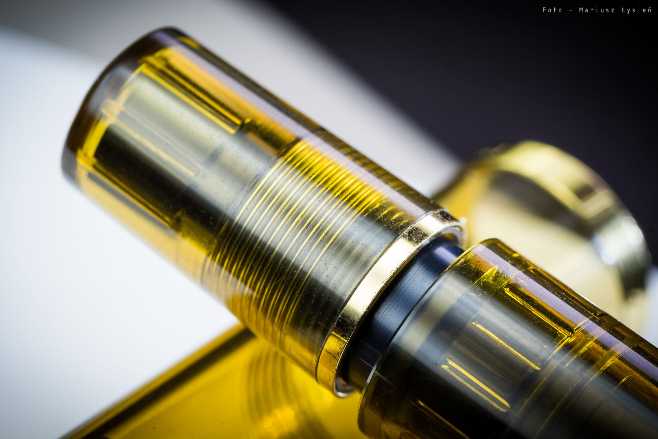 Oczywiście z uwagi na fakt, że żywica jest transparentna, widzimy nie tylko zbiorniczek z atramentem, ale wszystkie inne elementy znajdujące się wewnątrz pióra. Taki styl kojarzy się z piórami typu „demonstrator”, gdzie użytkownik może zajrzeć w głąb konstrukcji. Z uwagi na fakt, że pióro ma się kojarzyć z chwilami, kiedy rozsiadamy się w fotelu z lampką koniaku w jednej ręce a piórem w drugiej, tak by na spokojnie skreślić list bądź kilka wyrazów do kogoś znajomego, jest to trafiona koncepcja. Wszak koniak jest cieczą transparentną, która może dawać piękne refleksy np. za sprawą trzaskającego w głębi pomieszczenia kominka. Oczywiście wszystkie towarzyszące elementy metalowe zostały pozłocone i bardzo dobrze komponują się z kolorystyką pióra, które posiada trzy ringi dzielące je na sekcje podobnej długości – mowa o pierścieniu: