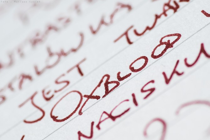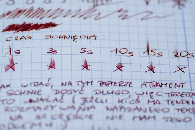 Schnięcie jest dosyć nietypowe, gdyż jak wspomniałem nie jest to inkaust, który można uznać za rzadki. Z drugiej strony nie schnie powalająco szybko – raczej należy powiedzieć, że wysycha umiarkowanie szybko, jednak nie w przypadku papieru Oxford 90g. Na tym papierze osoby mające problem z rozmazywaniem świeżo napisanego tekstu przeżyją traumę. Praktycznie do 15 sekund nie widać wielkiej różnicy i zdarza się że przy grubiej położonej warstwie dochodzi do tego że po np 15 sekundach możemy rozmazać litery tak samo jak po 1 sekundzie. Dopiero czas wynoszący około 20 sekund daje nam komfort nie martwienia się o możliwość rozmazania. Ja osobiście nie mam z tym problemu i na papierze Oxford’u piszę bez rozmazywania, ale jednak dla osoby np. piszącej lewą ręką może to być istotne. Na papierze biurowym (w tym przypadku Pol Lux 80g) sprawa jest prostsza. Papier ten jest znacznie miększy, a z uwagi na niższą gramaturę także bardziej nasiąkliwy, dzięki czemu na nim wysycha znacznie szybciej.