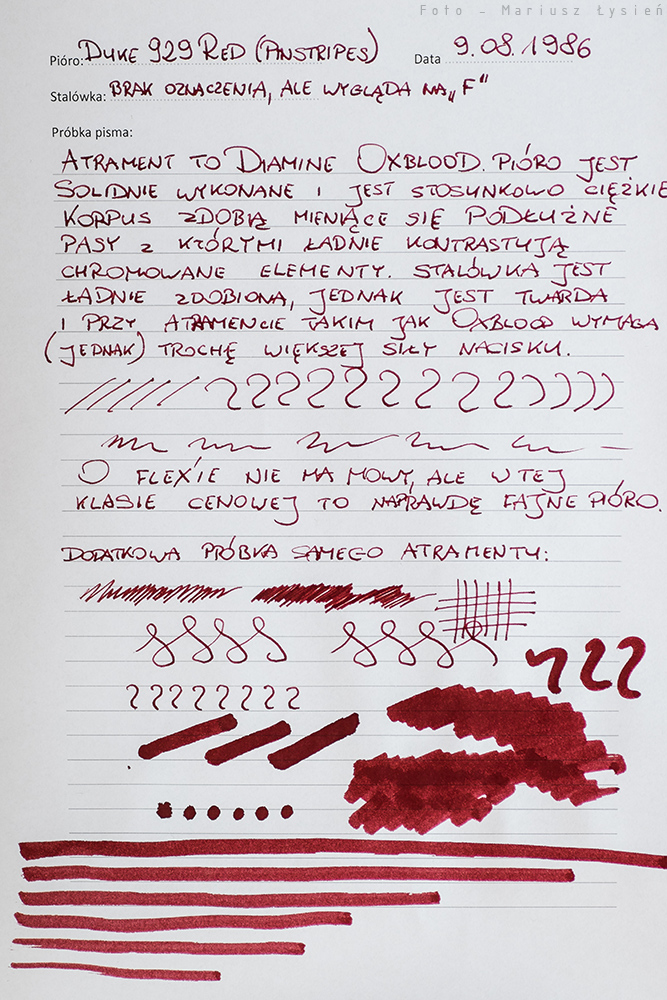 Po prostu nie spływa tak gładko, a ja lubię jednak gdy pióro piszę miękko, przy użyciu jedynie delikatnego nacisku – można to porównać do takiego „maślanego” sunięcia po papierze. W piórze Duke trzeba jednak trochę siły włożyć by coś napisać. Nie jest to jakieś uciążliwe, ale jednak objawy są podobne jak w innych piórach zatankowanych tym kolorem, tzn. atrament ten potęguje „suchość” stalówki. Dlatego polecam raczej do mokrych stalówek.