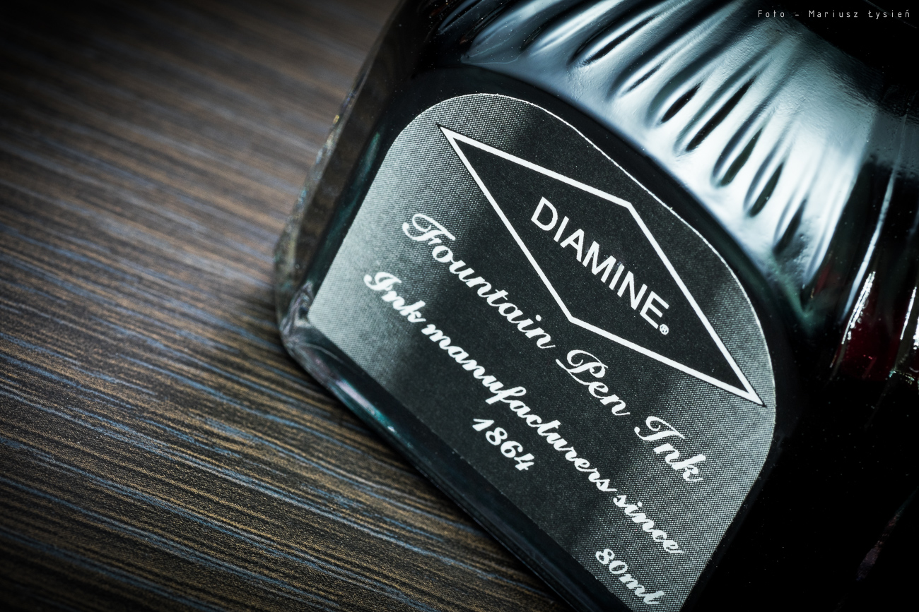 Atramenty Diamine uchodzą za takie, które nie tylko oferują dobrą jakość, ale i atrakcyjny stosunek zawartej objętości do ceny. Same w sobie wydają się niepozorne. Butelka ma stosunkowo proste linie a jej przysadzisty kształt nie zdradza stosunkowo dużej ilości zawartego w niej inkaustu. A jest go porządna porcja, która wynosi 80ml. W ofercie są także mniejsze opakowania. Sporym plusem takiego kształtu jest ich niesamowita stabilność. Żeby ją wywrócić to naprawdę trzeba się baaardzo postarać (a osobiście wydaje mi się to wręcz niemożliwe). Po odkręceniu korka, naszym oczom ukazuje się stosunkowo wąska szyjka, jednak jej średnica jest wystarczająca by zatankować pióro.