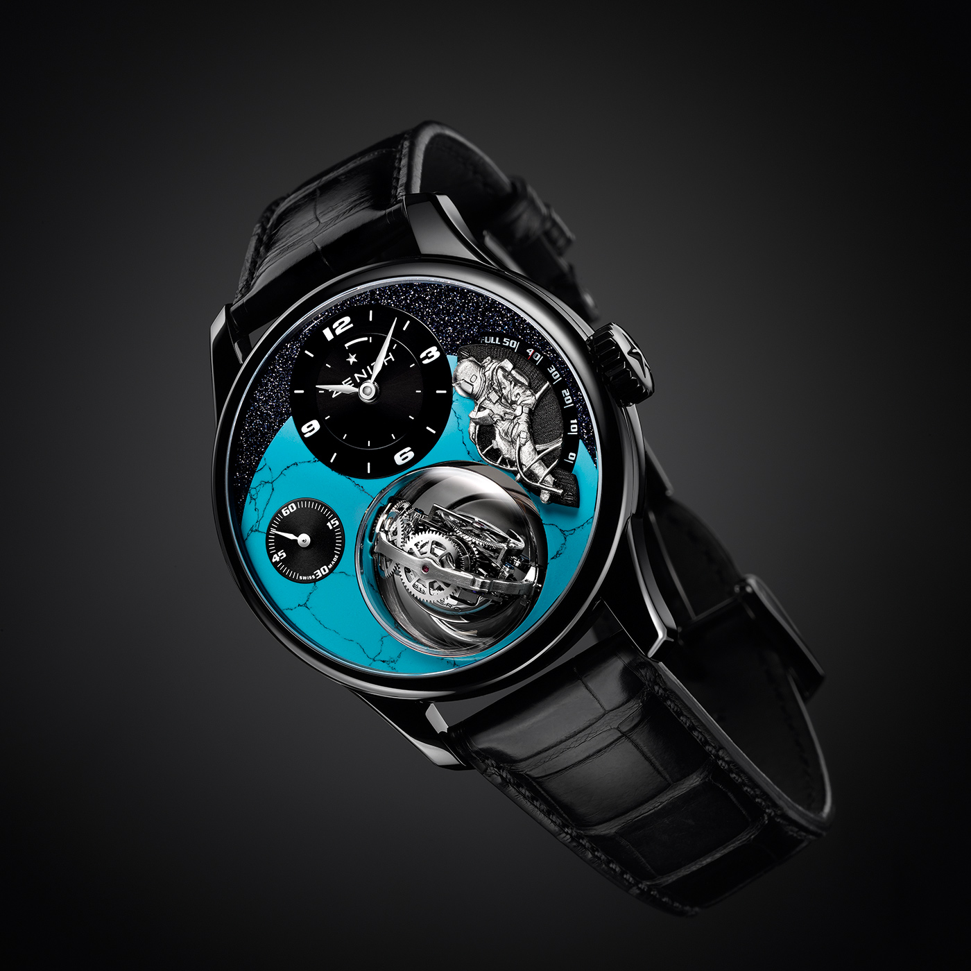 Tak wyjątkowym dokonaniom, zdecydowano się poświęcić równie wyjątkowy zegarek, czyli model Academy Christophe Colomb. Na łamach Zegarki i Pióra pisałem już o tym modelu w ujęciu serii poświeconej trzem przywódcom – „Zenith Academy Christophe Colomb – Hurricane Revolucion”. Został on wyposażony w moduł regulatora, którego zadaniem jest również niwelowanie wpływu grawitacji na dokładność chodu zegarka. Owy układ obiegowego wychwytu zajmuje sporą część cyferblatu.