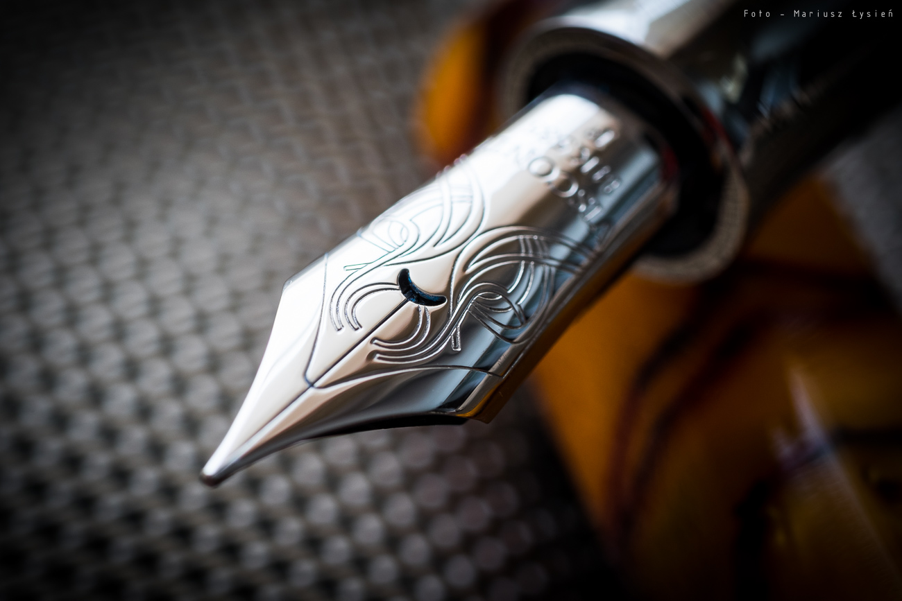 Jest to najszerzej rozpoznawalny model stosowany przez tego producenta. Została ona wykonana z 14 karatowego złota i jest stosunkowo dużych rozmiarów. W przypadku mojego egzemplarza, jest to szerokość F. Na pewno jest to jedna z tych stalówek, które zwracają uwagę. Pisze bardzo dobrze – atrament płynie bezproblemowo nawet przy energicznych ruchach nadgarstka. Muszę jednak uczciwie przyznać, że przez krótki moment po zakupie, stalówka wydała mi się lekko drapiąca. Być może kilkukrotne przepłukanie pióra czy też kontakt z powierzchnią papieru ostatecznie doprowadził do rozwiązania jakichkolwiek problemów. Bardzo, ale to bardzo cenię sobie w tym piórze sprężystość stalówki. Nie jest to „twardy gwóźdź” jaki często można spotkać nawet w produktach prezentowanych przez potentatów tego rynku. Naprawdę pod tym względem należy pióro pochwalić. W trakcie tego bądź co bądź już dosyć długiego okresu użytkowałem je z rożnymi atramentami i muszę przyznać, że z powodzeniem. Osobiście (nie wiem dlaczego) lubię go używać z atramentem Kon-Peki z serii Iroshizuku marki Pilot. Być może dlatego, że gro czasu to właśnie tego inkaustu używałem w Operze Club.