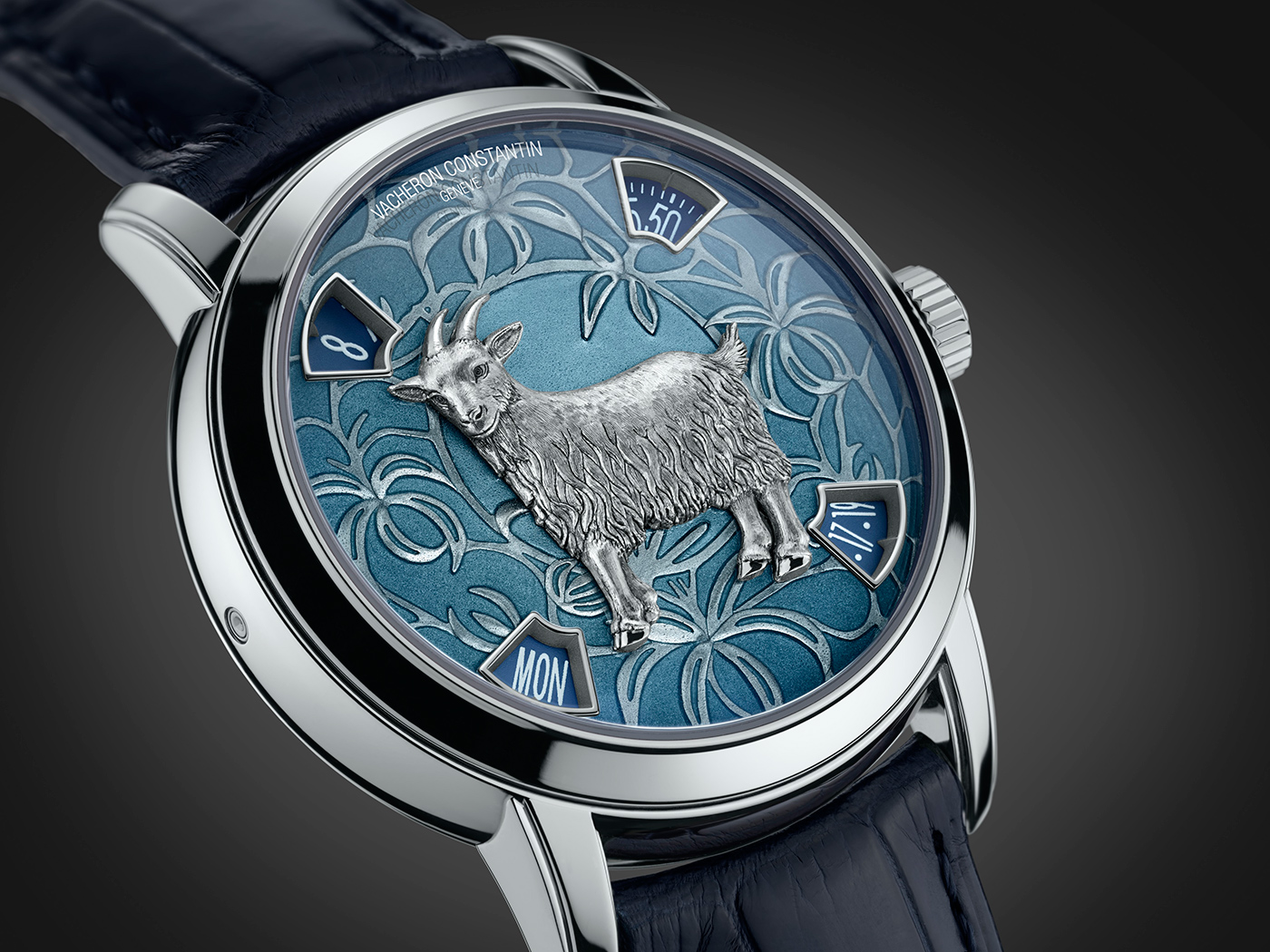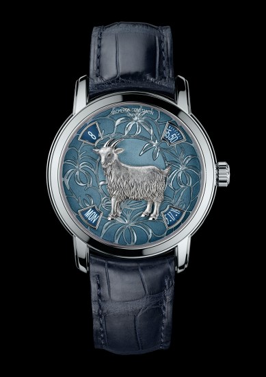 Cyferblat składa się z kilku elementów. Pierwszym z nich, jest ręcznie grawerowany motyw, przedstawiający kozła. Jest on wykonany ze złota (18K 5N). Drugim jest tło, które nawiązuje do środowiska naturalnego. Jest to doskonale wykonany przykład techniki emalierskiej, który łączy ręczne grawerowanie wraz z techniką Grand Feu. Została ona wykonana na podkładzie z 18 karatowego złota.