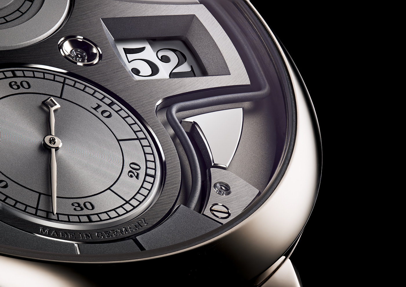 Jednak to nie jedyny element będący z pewnością nietypowym jak na produkty tej manufaktury. Te same spostrzeżenia można mieć właściwie do całego cyferblatu. Wskazanie godzin i minut jest tutaj realizowane poprzez obrotowe tarcze, których poszczególne wartości możemy odczytywać w oknach umieszczonych na godzinie 3 oraz 9. Wydatna metalowa wstawka właściwe organizuje rozkład cyferblatu oraz spaja wspomniane wskazanie godzin i minut oraz tarczę sekundnika umieszczonego na godzinie 6. Na godzinie 12 zlokalizowano wskazanie rezerwy chodu.