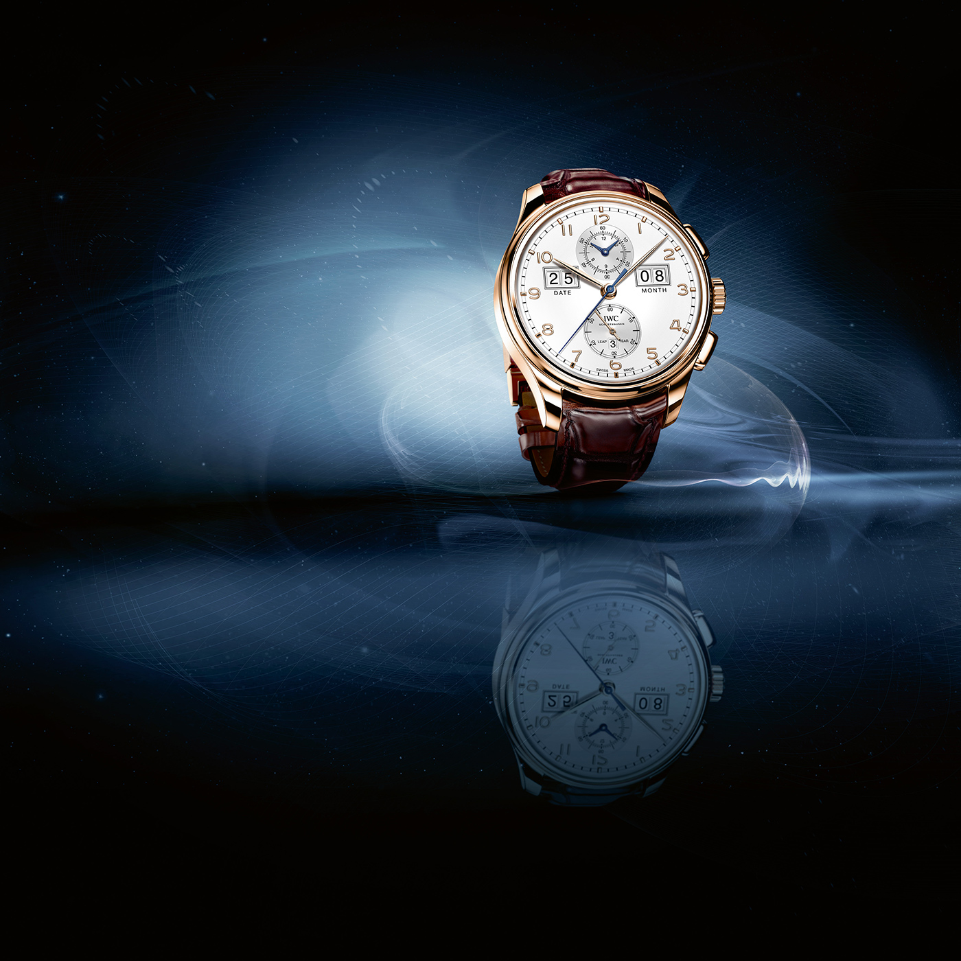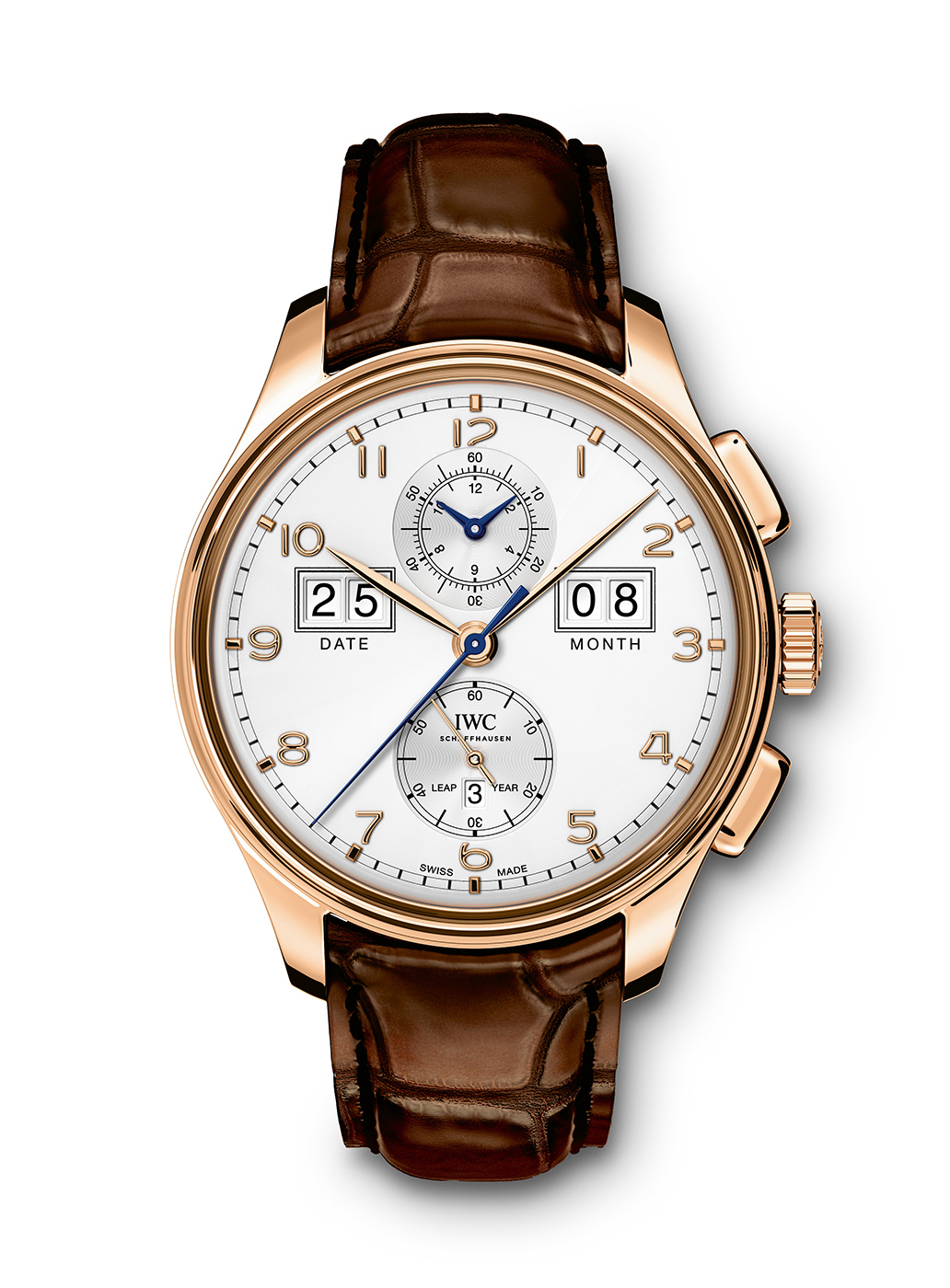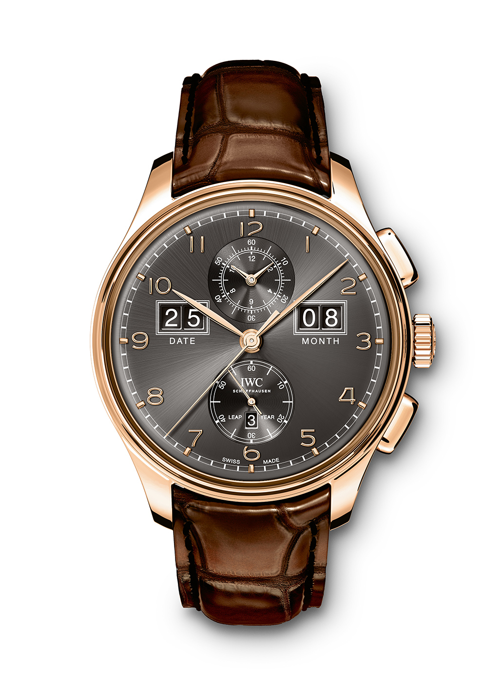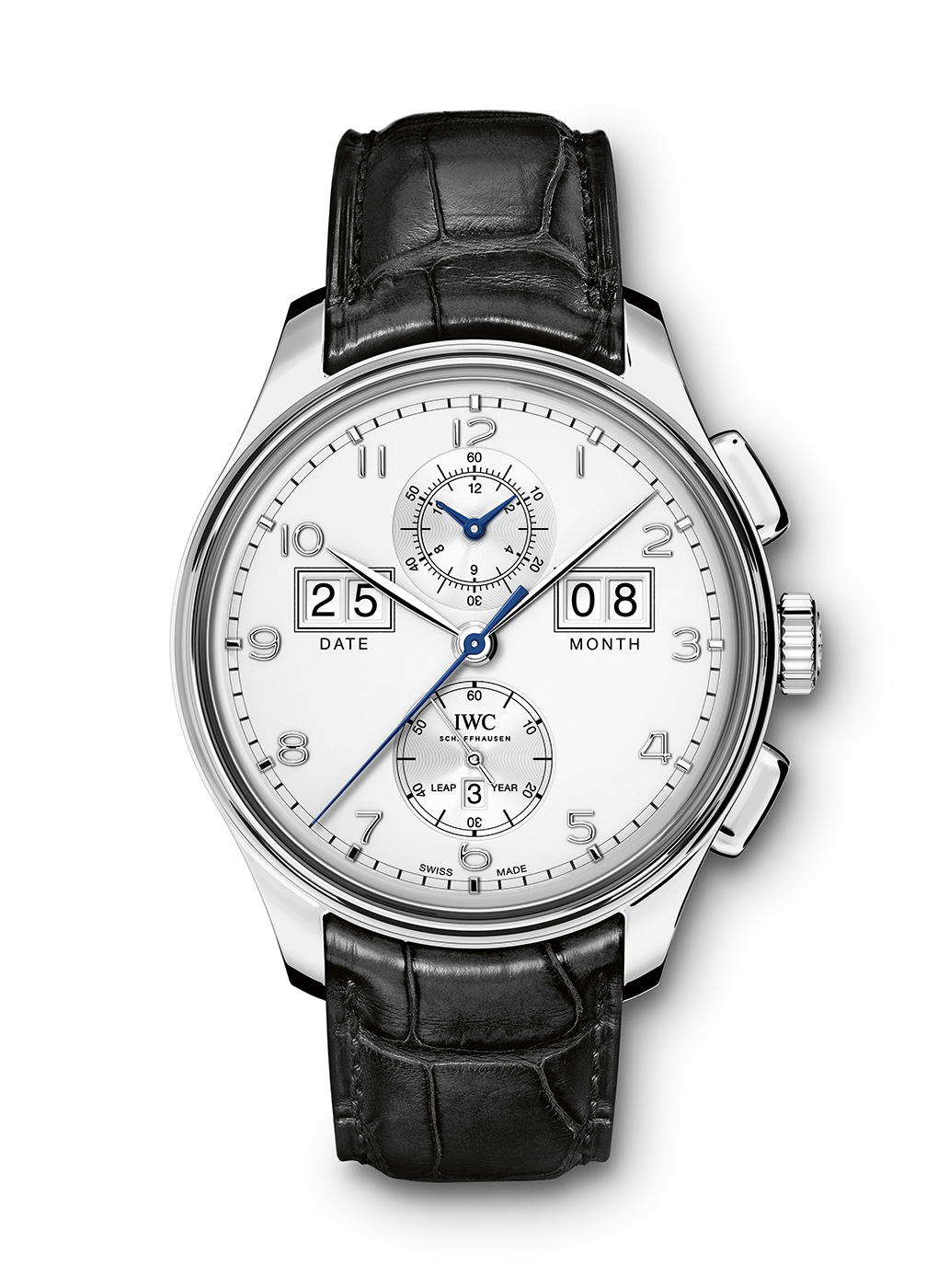 Jak wspomniano na początku, nabywcy mogą wybierać pomiędzy czarnym bądź srebrnym kolorem cyferblatu. Poza podziałką minutową typu „railtrack” oraz nakładanymi indeksami o kroju charakterystycznym dla kolekcji Portugieser, najlepiej widocznymi elementami są dwa duże okna datownika umieszczone na godzinie 2:30 oraz 9:30. Umożliwiają one odczyt danego miesiąca oraz jego aktualnego dnia. Na godzinie 12 umieszczono zintegrowany totalizator zliczający minuty oraz godziny podczas gdy uruchomiona jest funkcja stopera. Dla równowagi, na godzinie 6 znalazła się subtarcza sekundnika. Wewnątrz niej wycięto okno, w którym wyświetlane jest wskazanie informujące nas o tym, czy bieżący rok jest rokiem przestępnym czy też nie. To wszystko uzupełniają polerowane wskazówki o kształcie tak charakterystycznym dla linii Portugieser.