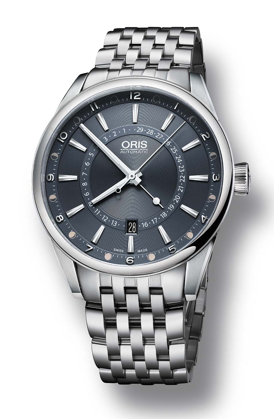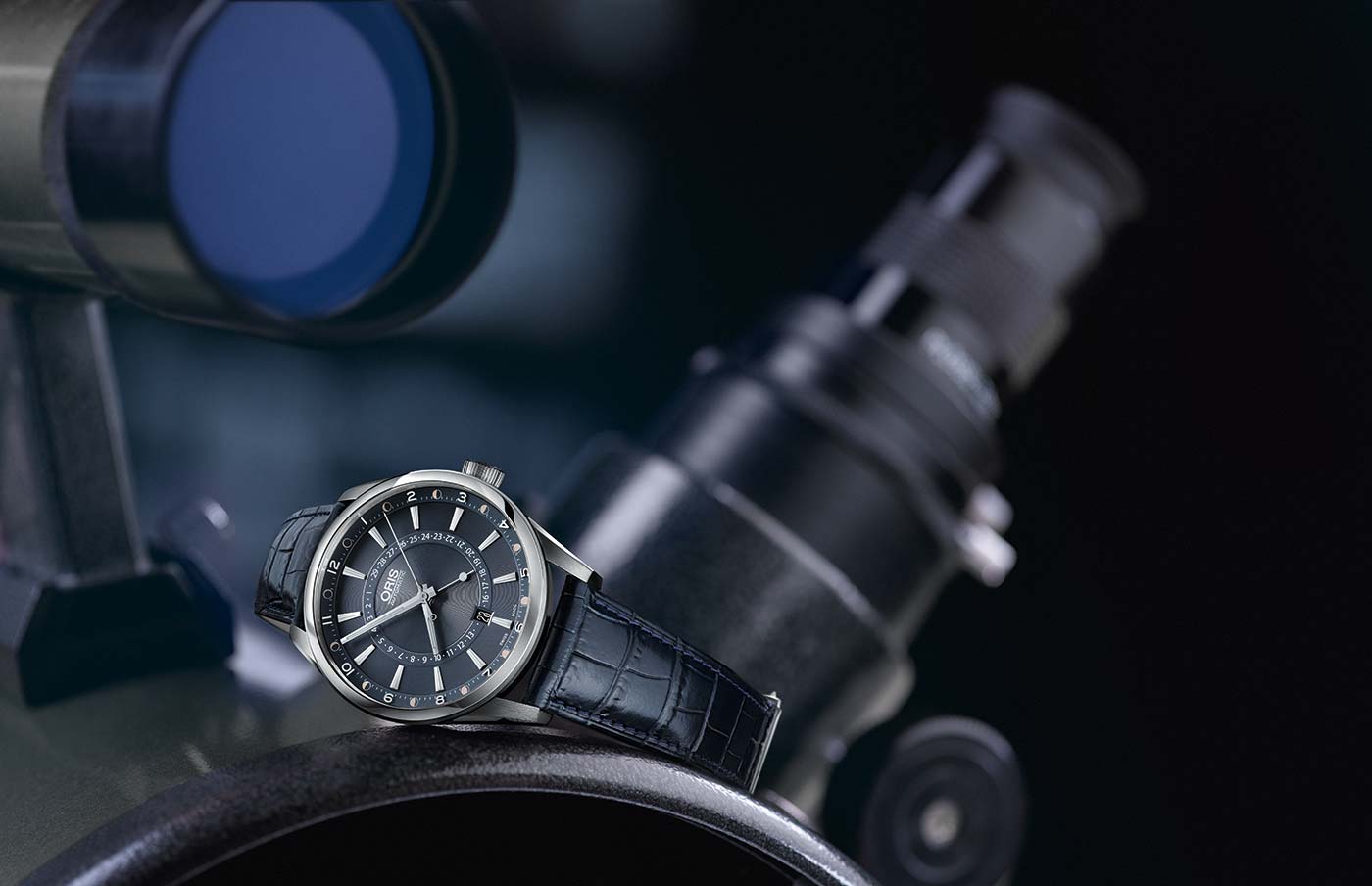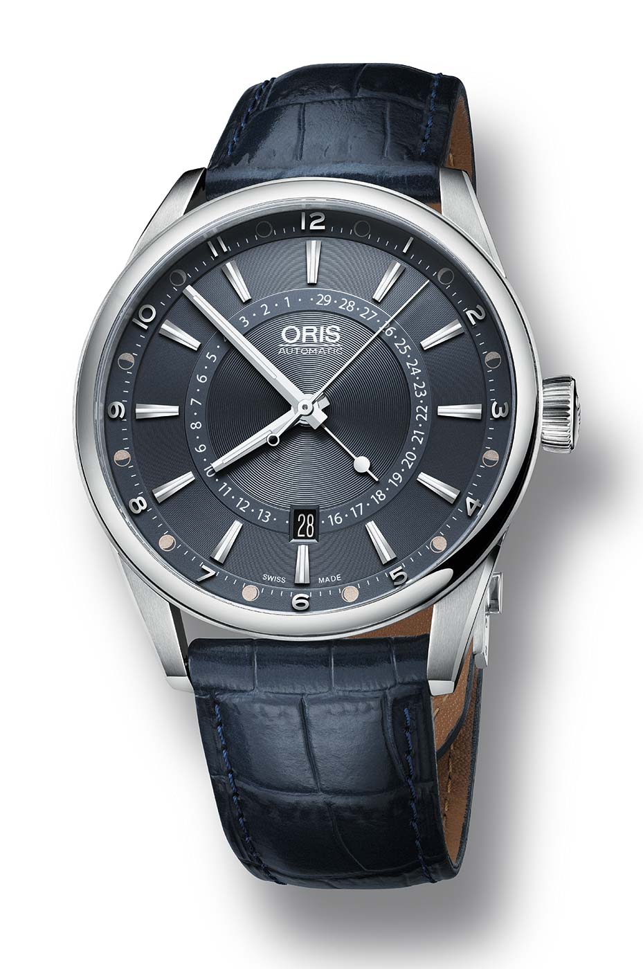 Z tego właśnie względu, czasomierz został wyposażony w komplikację opracowaną przez firmę Oris pod nazwą „Pointer Moon”. Oznacza to, że możemy odczytać dzień z 29,5 doby cyklu księżyca z wewnętrznej skali, której wartości wskazuje centralna wskazówka. Zaś na zewnętrznym okręgu cyferblatu odczytujemy graficzną reprezentację wskazania, czyli fazy księżyca. Aktualizacja wskazania następuje co pół dnia. Z tego też względu uznaje się, że ten sposób wskazania faz księżyca jest dokładniejszy aniżeli konwencjonalne sposoby. Pozostała powierzchnia niebieskiego cyferblatu została ozdobiona giloszowaniem, a na jej powierzchni umieszczono spore nakładane indeksy, których forma jest charakterystyczna dla firmy Oris. Zarówno indeksy jak i proste w formie niklowane wskazówki wypełnione zostały częściowo przy pomocy substancji luminescencyjnej. Na godzinie 6 umieszczono okienko datownika, które z pewnością przyda się w codziennym użytkowaniu.
