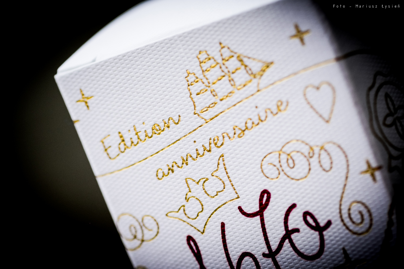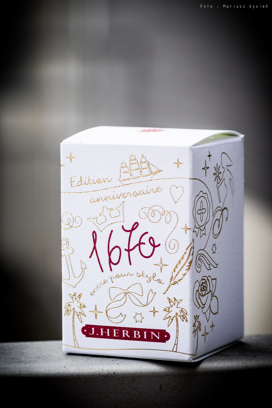 Prostopadłościenne pudełko wykonane z białego (trochę „łamanego” odcieniem ecru) kartonu, którego powierzchnia jest delikatnie przetłaczana. Dzięki temu papier sprawia wrażenie eleganckiego i dobrego jakościowo. Bordowe jak i złote napisy łączą się tutaj ze sporą ilością przeróżnych wzorów. Poza logo producenta jak i podkreśleniem daty 1670 – widnieje tutaj napis „Edition anniversaire”. Świadczy to o fakcie, że nie jest to atrament należący do kolekcji bazowej.