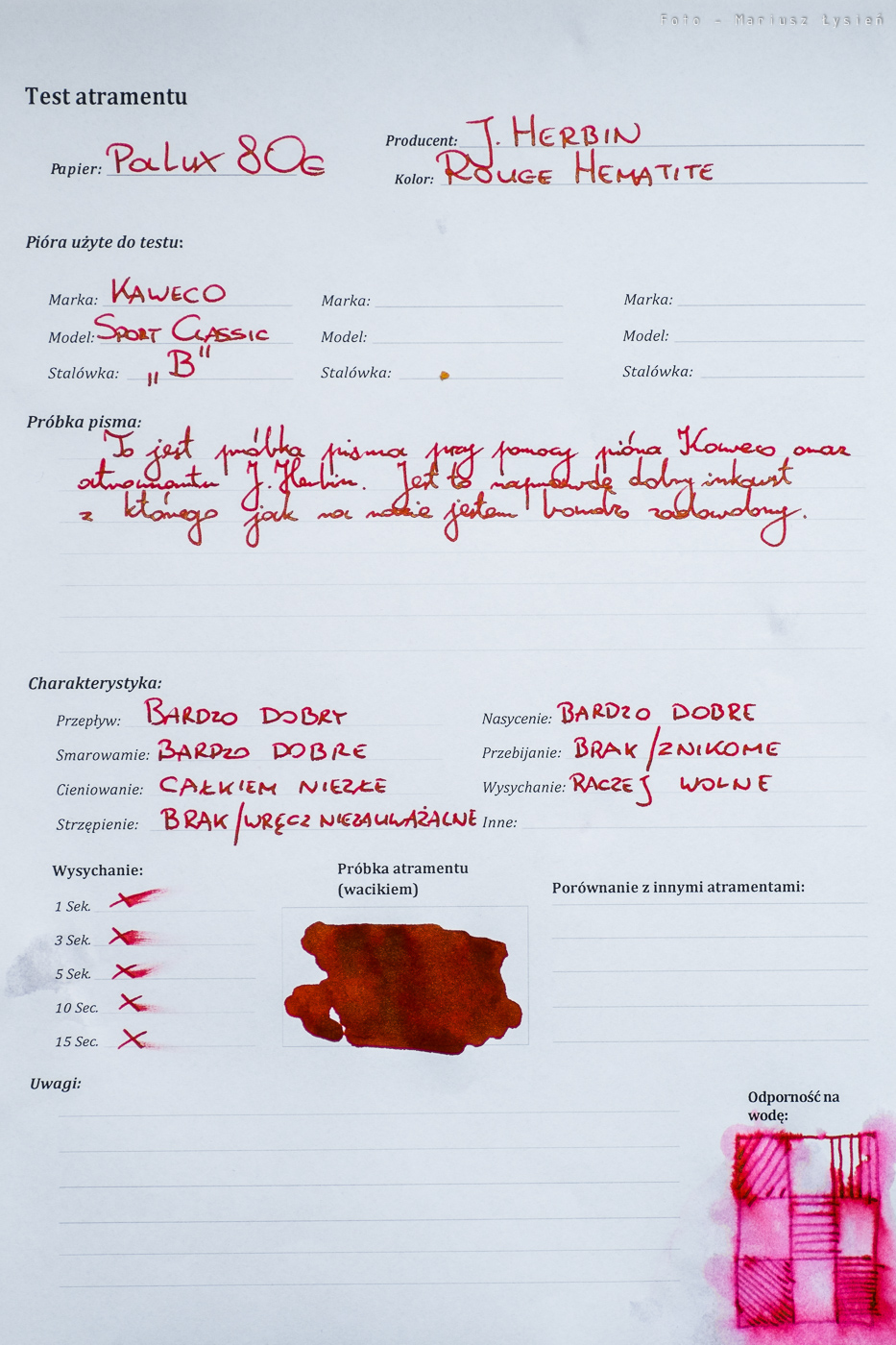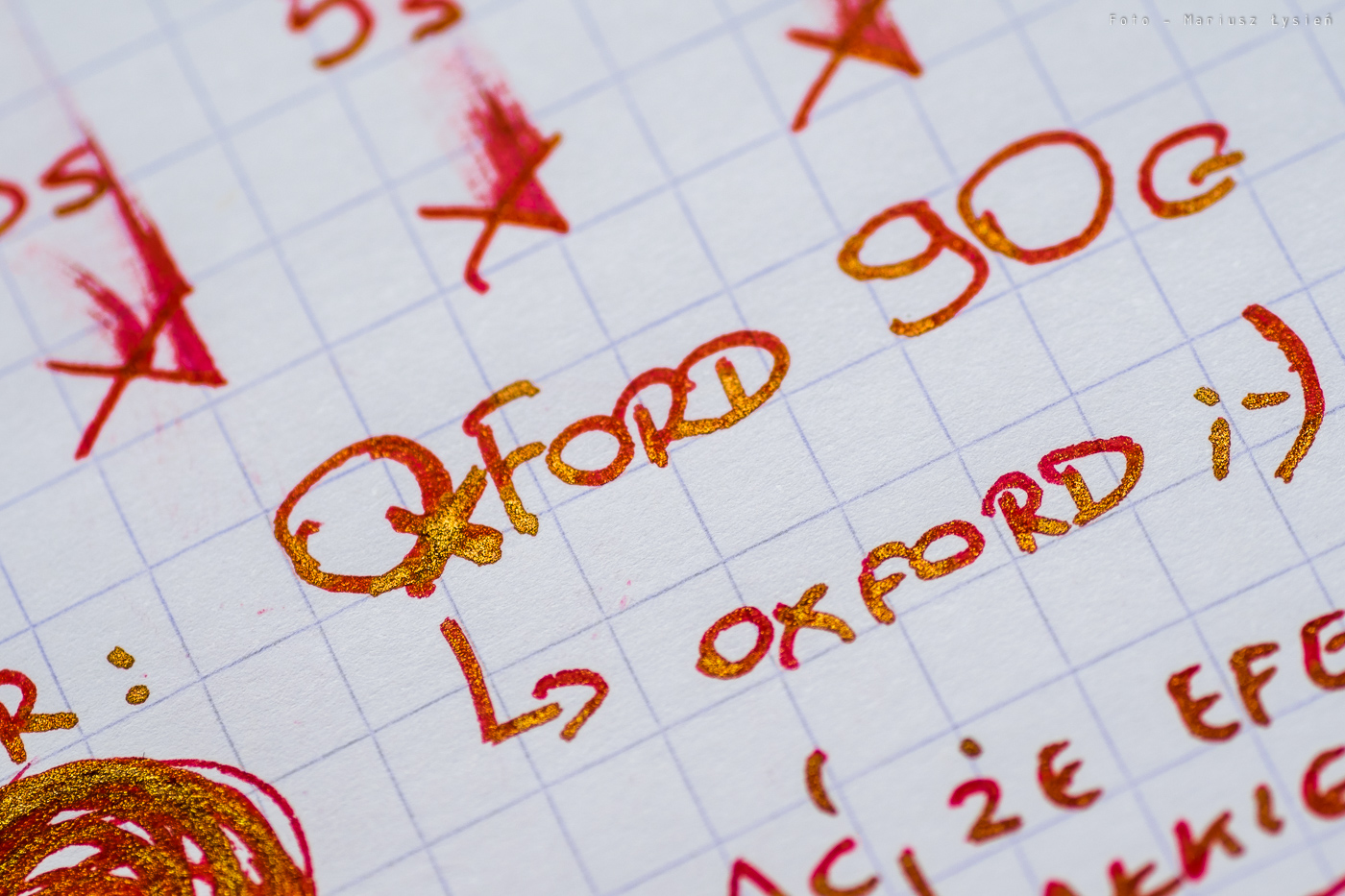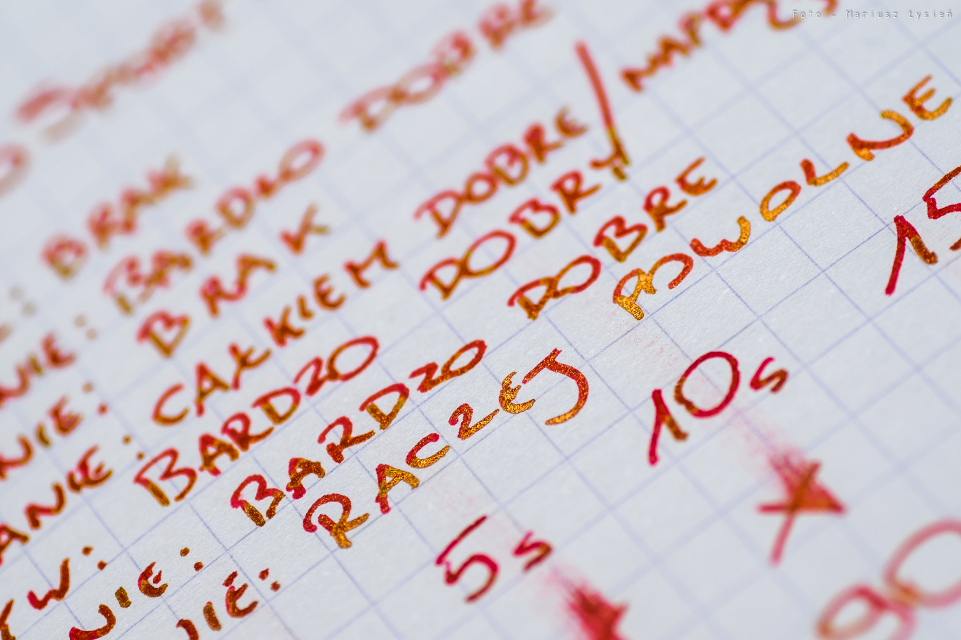 Na uwagę zasługują bardzo dobre parametry atramentu. Zarówno na lepszych, jak i ciut słabszych papierach nie tylko nie strzępi on, ale również nie przebija na drugą stronę. Byłem tym zaskoczony, gdyż czerwienie i inne pochodne potrafią na tym polu nie wypadać zbyt korzystnie. Tutaj przebicie na drugą stronę nastąpiło na papierze Oxford 90g jedynie w miejscu gdzie kreśliłem uporczywie wiele razy w tym samym miejscu, co przy mokrej stalówce B w Kaweco Sport musiało zaowocować sporą ilością cieczy na powierzchni papieru.