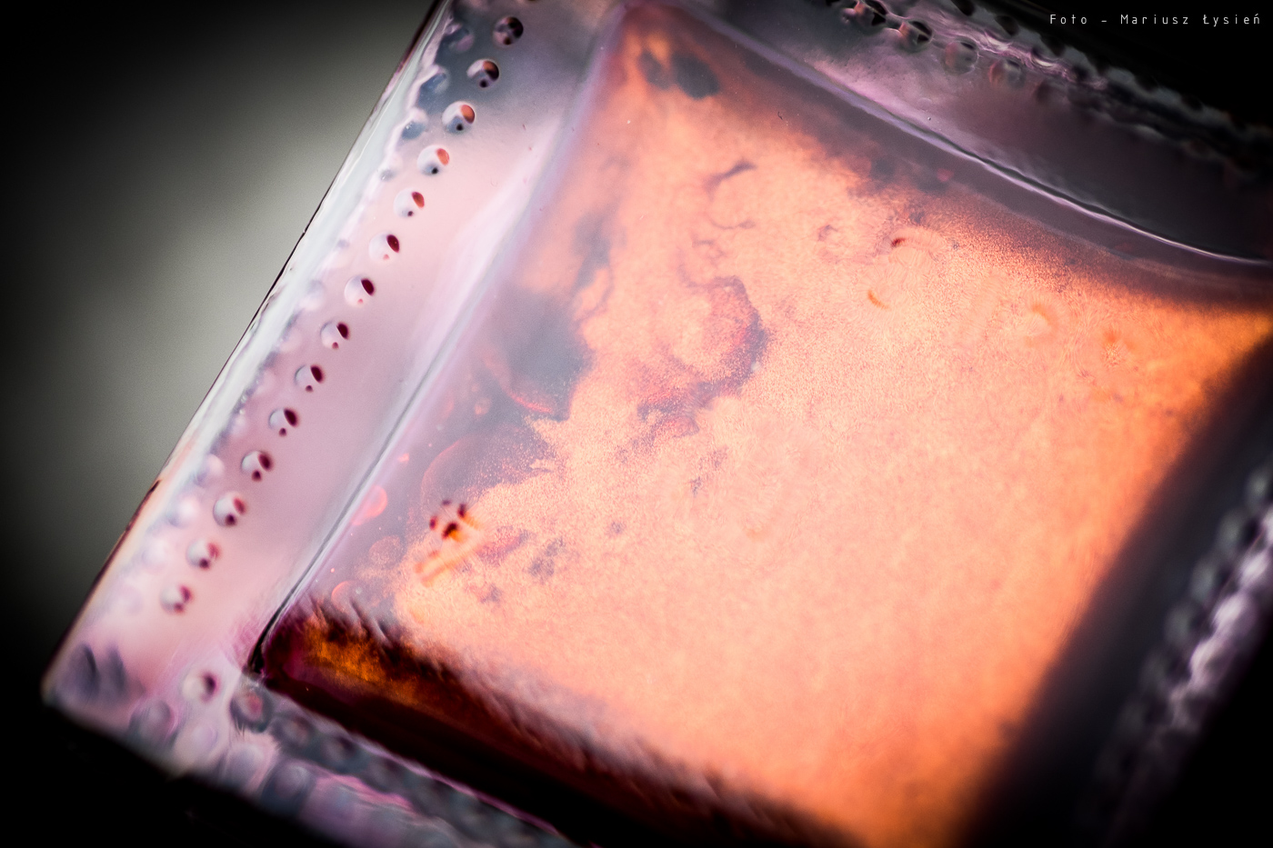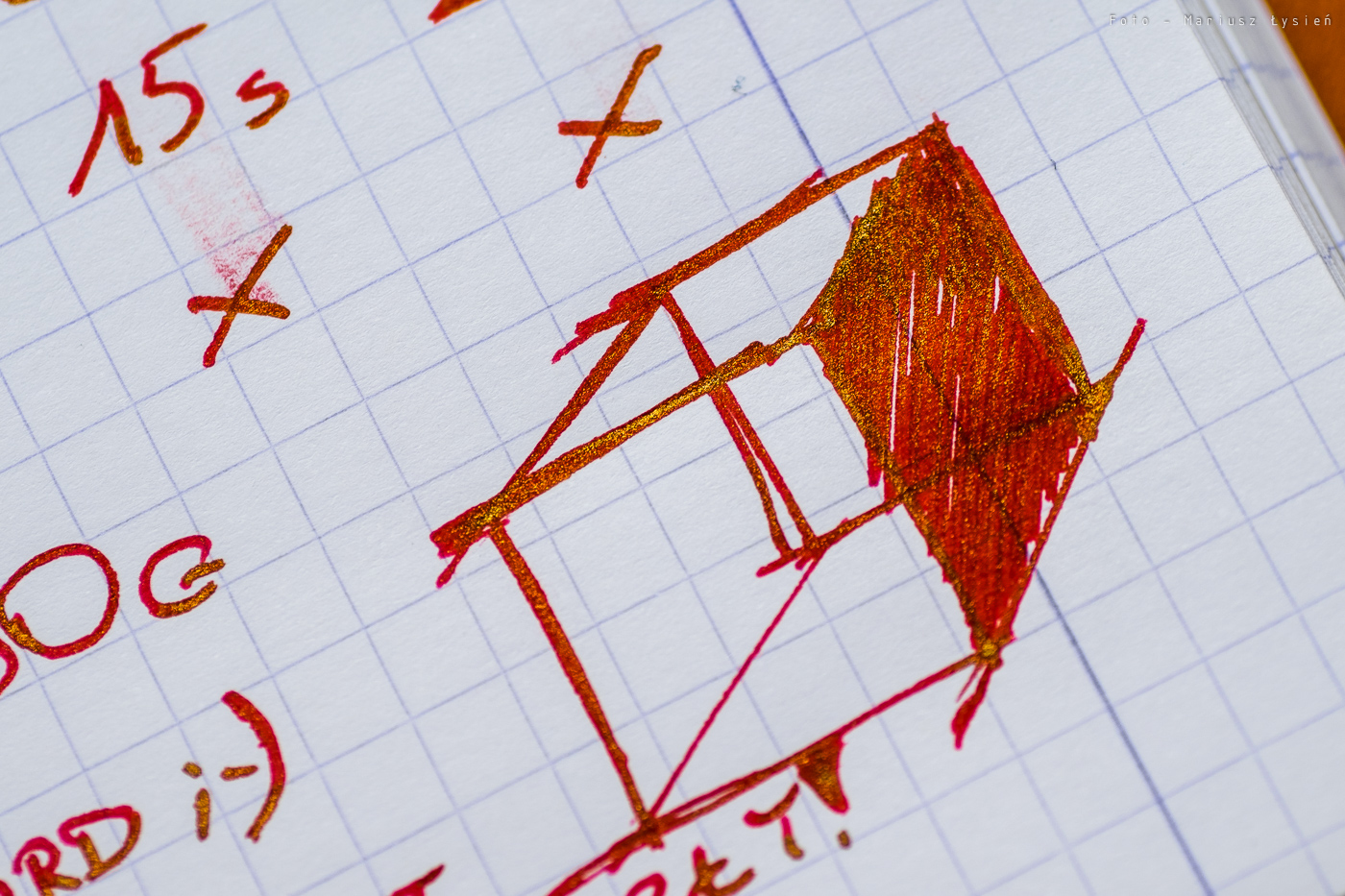 Na koniec zostawiłem sobie tzw. „gwóźdź programu”, a mianowicie to co czyni ten atrament w pewien sposób wyjątkowym (jeżeli oczywiście pominiemy i tak intrygujące przejścia czerwieni w zieleń). Chodzi oczywiście o niewielkie, połyskujące drobinki w kolorze złota. Skutkuje to dwoma efektami. Pierwszym jest błyszczenie się atramentu zwłaszcza w miejscach gdzie podano go więcej na papier (pod warunkiem, że do pióra udało się zaczerpnąć owe drobiny). Drugim, występującym gdy drobin jest mniej bądź zostały te o najmniejszej frakcji, a które utrzymują się w pełnej objętości atramentu bez osiadania na dnie, jest owe zielone zabarwienie (być może nie wynika ono jedynie z tego faktu, ale w pewien sposób wg mnie jest to powiązane). Aby owych drobin zaczerpnąć do pióra, należy wstrząsnąć kilka razy butelką, po czym szybko butelkę odkorkować oraz napełnić pióro. Istotny jest czas, gdyż drobiny szybko wracają na dno butelki. Po solidnym wstrząsaniu i szybkim napełnieniu tekst potrafi się nielicho błyszczeć. Efekt jest naprawdę niezły i robi spore wrażenie. Zauważyłem również, że błyszczących drobin ubywa nieproporcjonalnie szybciej aniżeli atramentu w piórze – moim zdaniem jest to efekt analogiczny do tego obserwowanego w butelce tj. cięższe drobiny opadają na dno naboju/ tłoczka wobec czego szybciej są podawane na papier gdy piszemy (czyli gdy pióro jest skierowane stalówką do dołu).