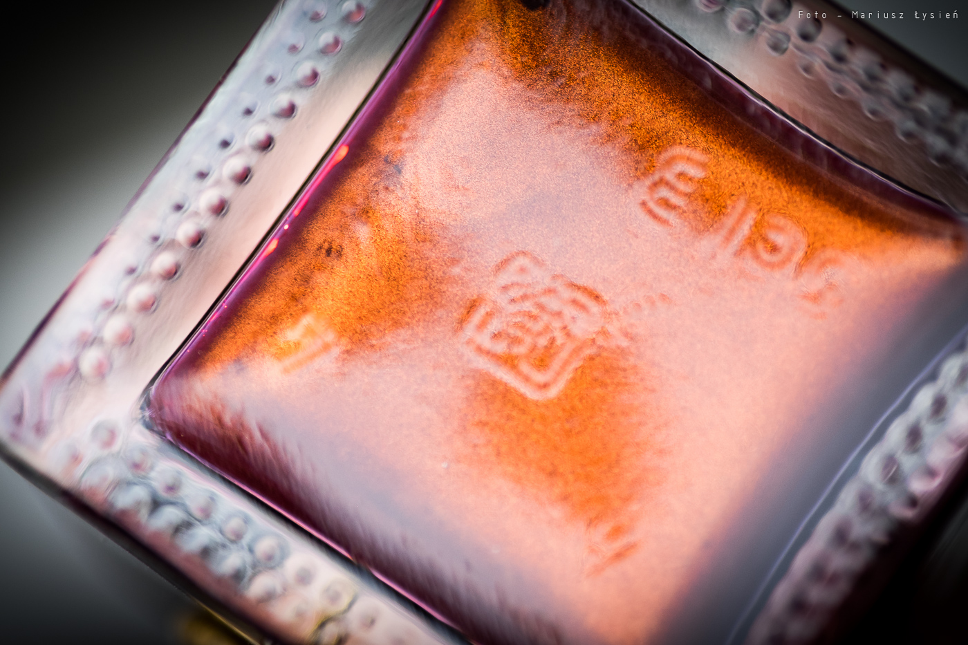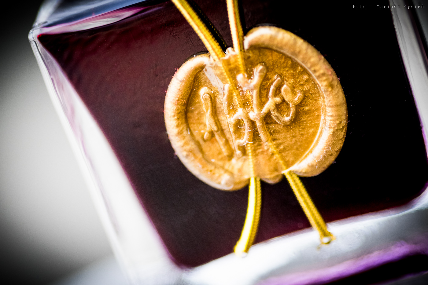 Butelka to tak naprawdę wykonany ze szkła sześcian (nie mierzyłem dokładnie, ale myślę, że wiele nie odbiega od takiego założenia). Metalowy korek pokryty czymś mającym imitować lakę robi dobre wrażenie, aczkolwiek moim zdaniem o ile butelka jest wykonana naprawdę bardzo dobrze, to korek mógłby być lepszy. Metalowa zakrętka jest jednak trochę lekka po odkręceniu i sprawia wrażenie ciut plastycznej. Pomimo pełnienia swojej roli bez zarzutów, widziałbym tutaj coś masywniejszego. Całość wieńczy złoty sznurek wraz z odciśniętym na zwór lakowej pieczęci logo seri czyli cyfry 1670. Ogólna prezencja tego elementu stoi na wysokim poziomie. Do wad butelki można zaliczyć jedną rzecz, a mianowicie średnicę szyjki butelki. Właściciele grubych piór mogą mieć problem z wetknięciem ich stalówek do wnętrza butelki. Także cała reszta nabywców będzie miała problem z wydobyciem ostatnich porcji atramentu, gdyż możliwości manewru są jedynie minimalne. Myślę, że w obu tych przypadkach może niezbędnym okazać się przelanie zawartości do innego kałamarza.