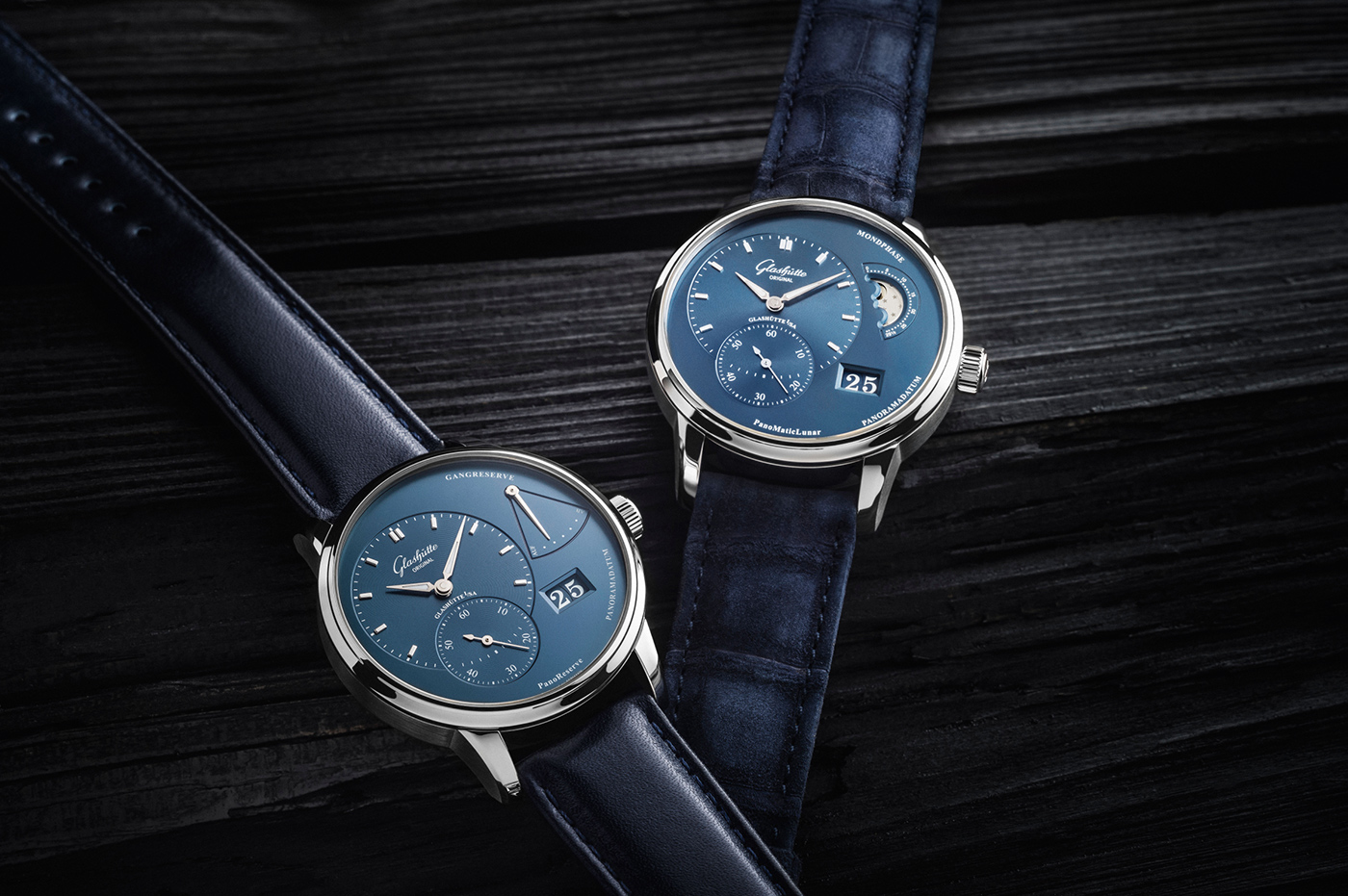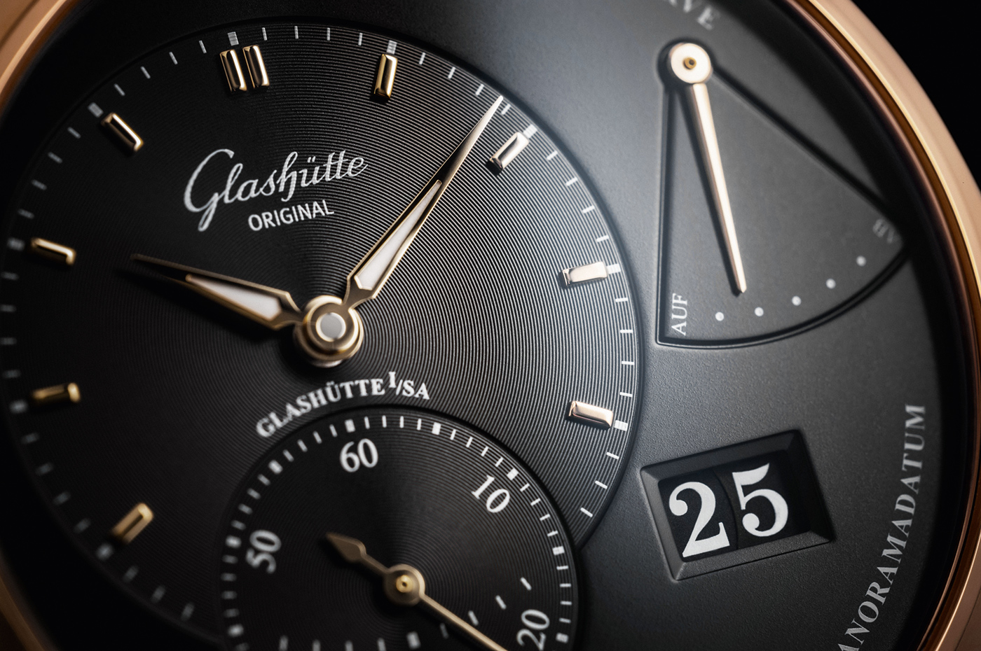Jak już wspomniałem powyżej, zmiany w obrębie cyferblatu są bardziej ewolucją, niż rewolucją i z pewnością należy je zaliczyć do poprawek tzw. kosmetycznych. Doskonale znany miłośnikom manufaktury GO rozkład elementów w zegarkach z kolekcji Pano, należy jednych z najbardziej charakterystycznych w historii zegarmistrzostwa. Z tego właśnie względu, projektanci wychodzą z założenia, „że nie zmienia się znacząco rzeczy dobrych i sprawdzonych”. Wskazanie aktualnej sekundy, minuty i godziny oraz okienko datownika znajdziemy praktycznie w niezmienionej formie w każdym z modeli należących do kolekcji Pano. Równie charakterystyczna jest forma nakładanych indeksów, czy też wskazówek. Tym, co stanowi największą różnicę tarcz obu opisywanych czasomierzy, jest fakt, że w modelu PanoMaticLunar odnajdziemy wskazanie faz księżyca, natomiast w PanoReserve umieszczono wskaźnik rezerwy chodu. Producent podkreśla, że wykonanie każdej z tarcz wymaga do 40 indywidualnych operacji.