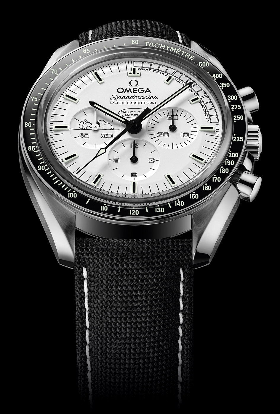 Stalowa koperta mierzy 42mm średnicy. Z prawej strony oczywiście odnajdziemy koronkę, a także przyciski służące do obsługi funkcji stopera, która jest w tym modelu nieodłączna. Kolorystyka jest utrzymana w biało-czarnej stylistyce. Na czarnym pierścieniu lunety naniesiono skalę tachymetru. Biała powierzchnia cyferblatu posiada charakterystyczny, poziomy układ totalizatorów stopera. W tym umieszczonym na godzinie 9 znalazła się podobizna leżącego Snoopy’iego, do którego dołączono „dymek” z napisem „Failure is not an option”. Tekst ten wypowiadał aktor Ed Harris, który zagrał w filmie z 1995 roku, którego tytuł brzmiał „Apollo 13”. Dodatkowo pierwsze 14 sekund zostało wyróżnione czarnymi kwadratami.