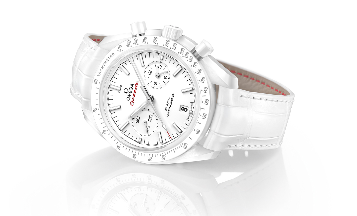 Rozkład elementów na powierzchni cyferblatu jest identyczny nie tylko z tym, co prezentuje regularnie produkowany model, ale i oba wcześniejsze warianty tej serii. Tarcza również została wykonana z ceramiki. Klasyczne dla modelu Speedmaster wskazówki zrobione zostały z 18 karatowego białego złota. Jasną kolorystykę zegarka przełamują jedynie nieliczne czerwone akcenty, takie jak zwieńczenie wskazówki sekundowej czy napis „Speedmaster” na cyferblacie. To wszystko chroni szkło szafirowe pokryte obustronnie powłoką antyrefleksyjną.