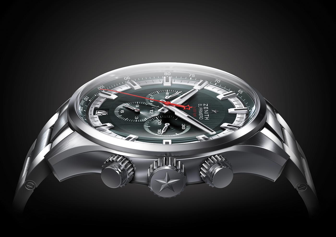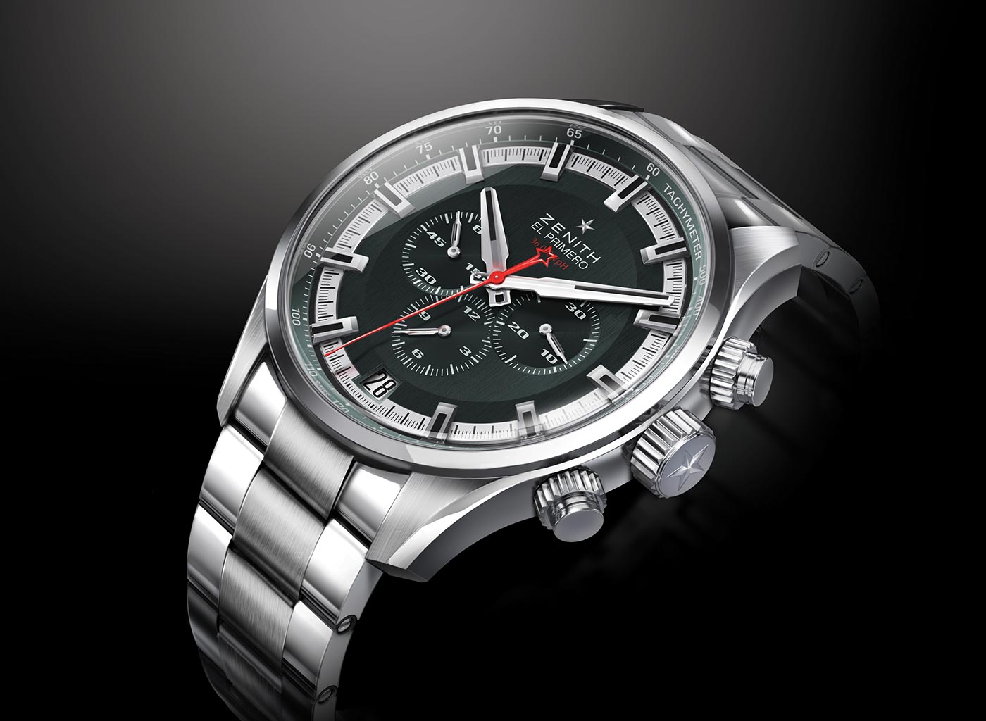 Tarcza oferowana jest w dwóch kolorach – srebrnym bądź ciemnoszarym (któremu nie tak daleko do czarnego). Rozpoczyna się ona skalą tachymetru. Duże nakładane indeksy spina podziałka centralnego sekundnika. Wspomniane indeksy oraz wskazówki wypełniono za pomocą Superluminovy SLN C1. Wypełnienie środka cyferblatu stanowią ustawione w układzie poziomym trzy totalizatory. Dwa z nich służą zliczaniu czasu dla funkcji stopera, natomiast ten umieszczony na godzinie 9 pełni rolę tzw. „małej sekundy”. Na godzinie 6 zlokalizowane zostało okno datownika. Całość uzupełnia zabarwiony na czerwono sekundnik, na którego końcu umieszczono charakterystyczną dla firmy Zenith gwiazdę.