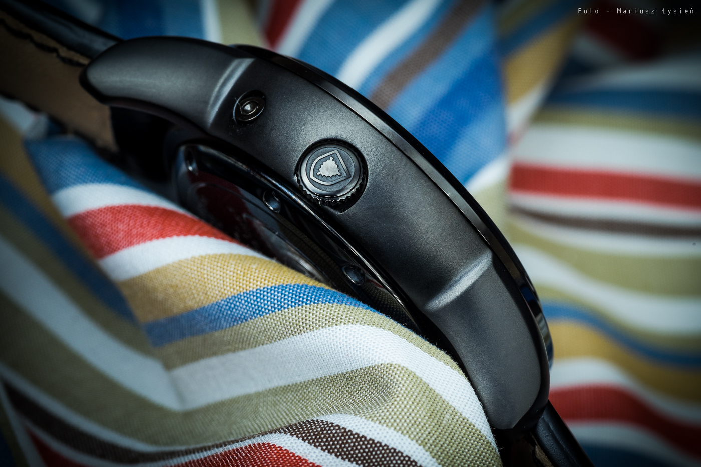 Z prawej strony zamontowano koronkę sygnowaną logo producenta. Co ciekawe – nie jest ona widoczna, gdy patrzymy na zegarek z góry. Dzieje się tak, ponieważ chowa się ona częściowo w wyfrezowany otwór w bocznej ściance koperty. Początkowo myślałem, że klasyczne podejście do tego elementu było by być może lepsze, jednak spoglądając raz za razem na czasomierz, szybko przyzwyczajamy się, że koronki po prostu nie widać gdy, np. odczytujemy czas. Jedyne zastrzeżenie jakie mam do tego elementu, to że po odciągnięciu koronki odstaje ona na niedużą odległość, przez co uchwycenie jej palcami jest dosyć trudne. Oczywiście, należy wziąć pod uwagę, że godzinę ustawia się na zegarku jedynie raz na pewien czas, wobec czego w codziennym użytkowaniu nie będzie to żaden problem. W dodatku moje wrażenie wynika najpewniej z przyzwyczajenia się do klasycznego umiejscowienia koronki.