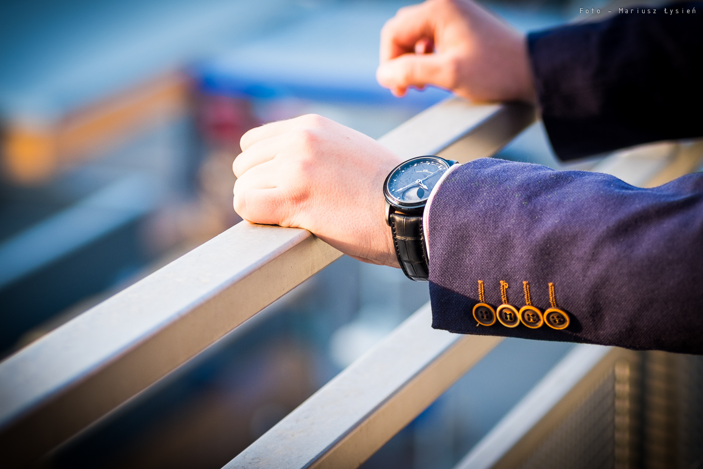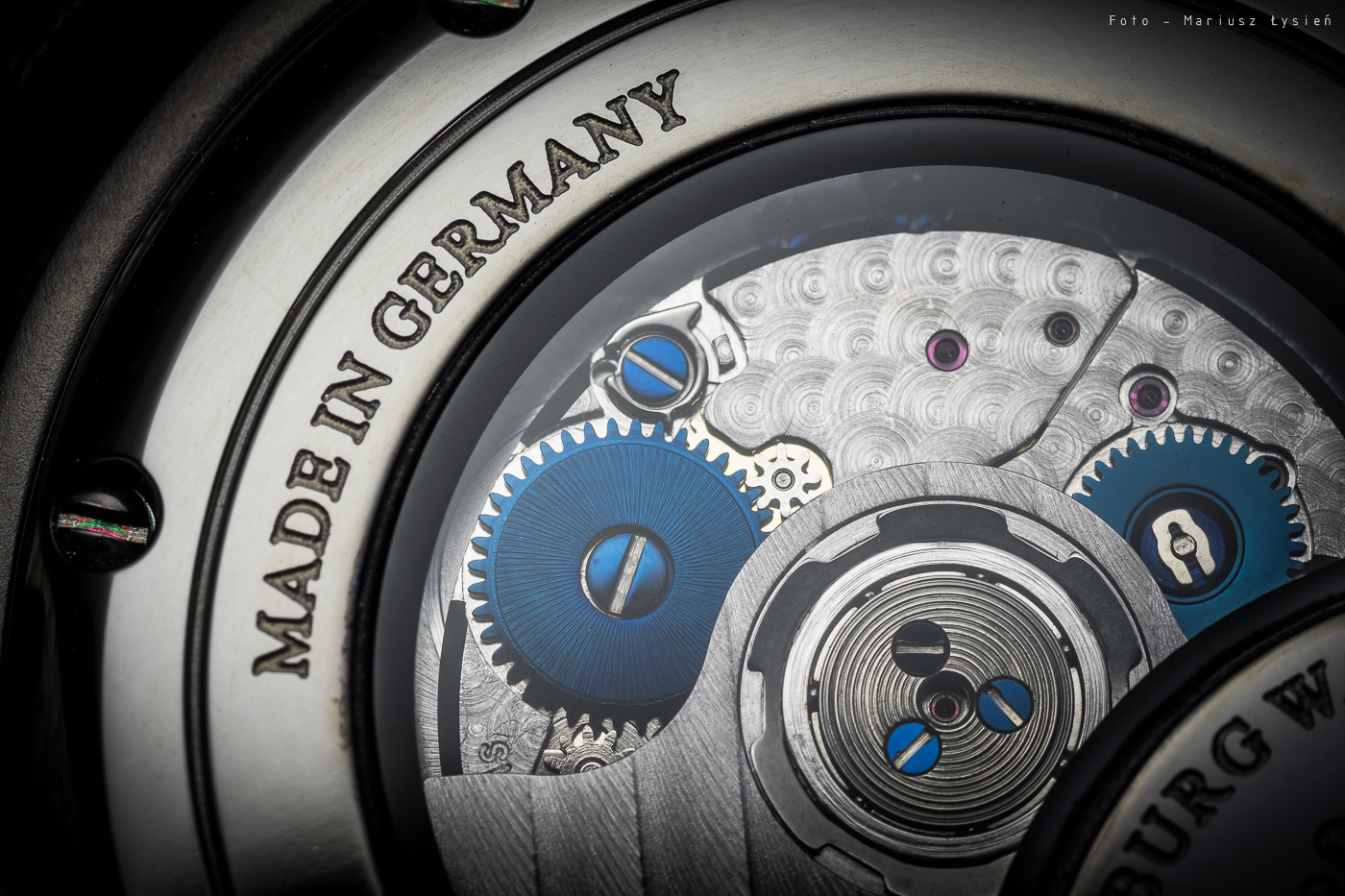 Przez szafirowe szkło możemy obserwować mechanizm SW-11 z automatycznym naciągiem sprężyny. Osobiście przyznam, że nie testowałem zbyt dociekliwie jego dokładności chodu. Wszak zegarek występował w roli materiału do zdjęć, aniżeli w roli produktu testowego. Trzeba przyznać, że mechanizm prezentuje się bardzo atrakcyjnie. Barwione na niebiesko śruby oraz niektóre koła zębate, łączą się tutaj z pasami genewskimi oraz groszkowaniem. Buduje to wrażenie naprawdę solidnie ozdobionego werku.