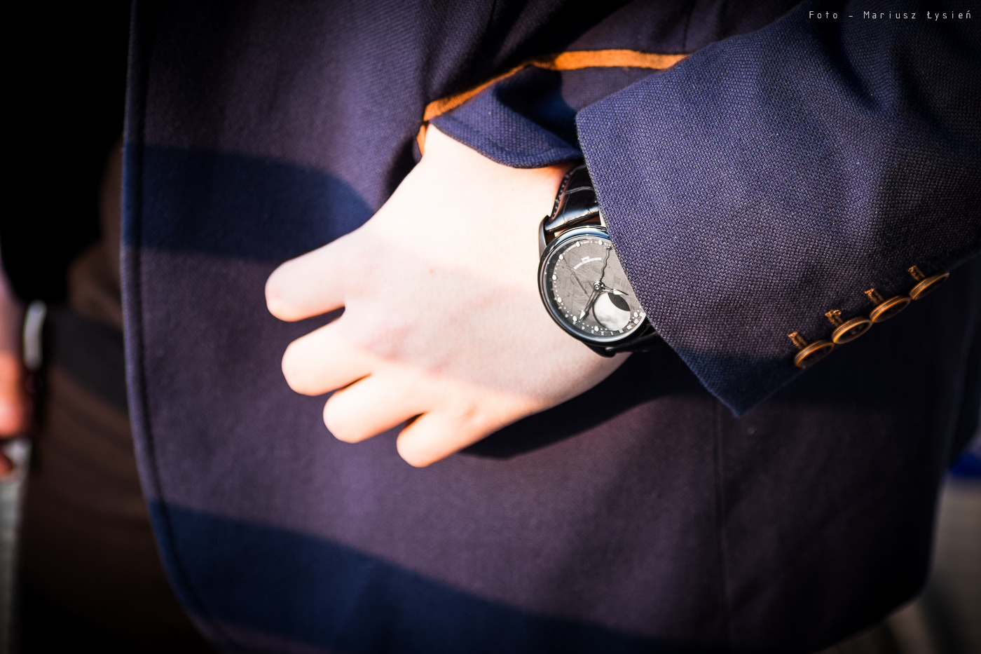 Z obu stron koperty, producent umieścił również dwa przyciski, dzięki którym możemy regulować wskazanie datownika oraz głównej komplikacji mechanizmu, jaką jest wskazanie faz księżyca. Jest to szybkie i dyskretne rozwiązanie powszechnie stosowane przez wielu producentów. Mimo wszystko cieszy jednak możliwość szybkiej korekty obu wskazań. Ciekawie prezentuje się także pierścień lunety, którego powierzchnia jest wklęsła (zamiast wypukłego kształtu, który możemy obserwować w większości produktów na rynku). Jego wypełnienie stanowi szkło szafirowe.\