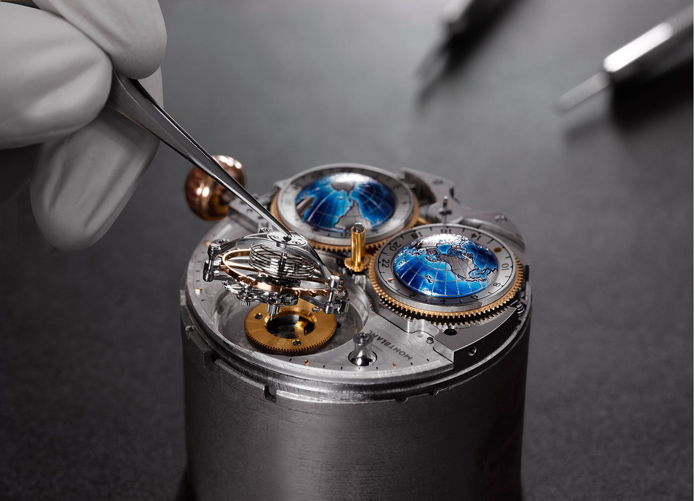 - wewnątrz musi się znaleźć wiele elementów składających się na budowę zamontowanego w zegarku werku. Chociażby w tym przypadku jest to sporej wysokości klatka tourbillona oraz dwie ręcznie malowane półkule mające przedstawiać północną oraz południową półkulę Ziemi.