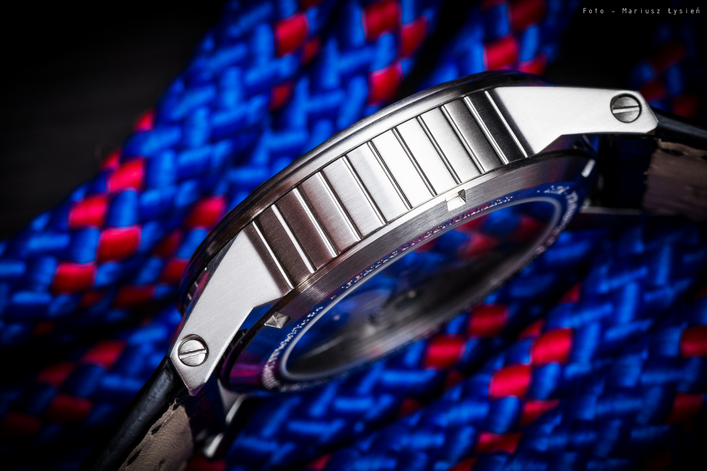Z pewnością koperta tworzy nietypowe zestawienie z klasyczną tarczą i wskazówkami. Została ona wykonana ze stali nierdzewnej i mierzy 42mm średnicy. Prezentuje ona dosyć mocno poprowadzone linie, charakteryzujące się dużą dozą nowoczesności. Proste w kształcie uszy mą z każdej strony praktycznie wyłącznie po jednej płaszczyźnie. W dodatku centralną cześć koperty zdobi pionowe żebrowanie. Jak to wygląda? Moim zdaniem więcej niż dobrze. Pomimo niezbyt wymyślnego kształtu koperty nie ma się wrażenie sztampowości tego elementu. Nawet powiedziałbym, że sprawia wrażenie intrygującego, a na pewno innego niż to, z czym zetknęliśmy się do tej pory w tego typu czasomierzach.