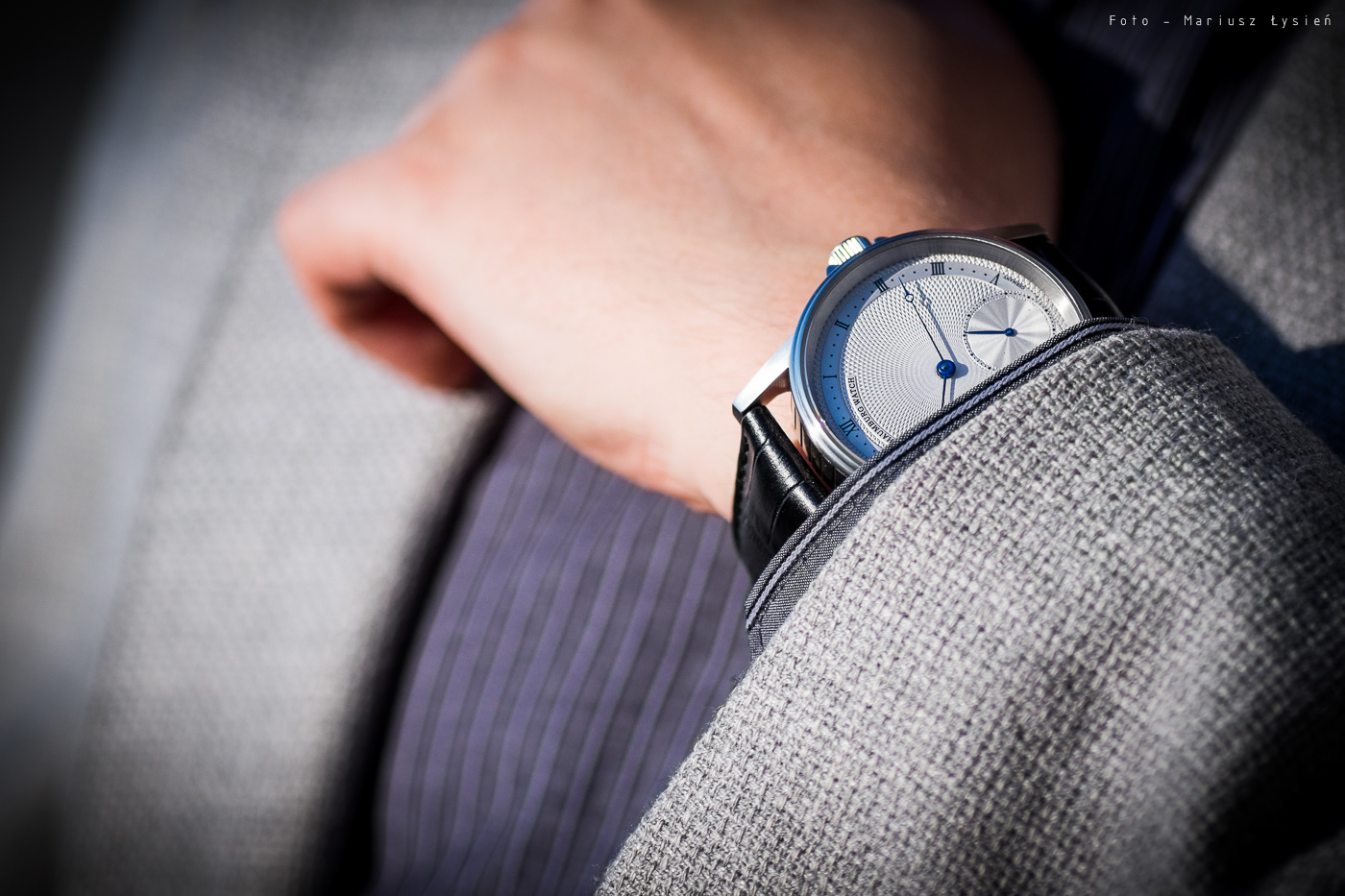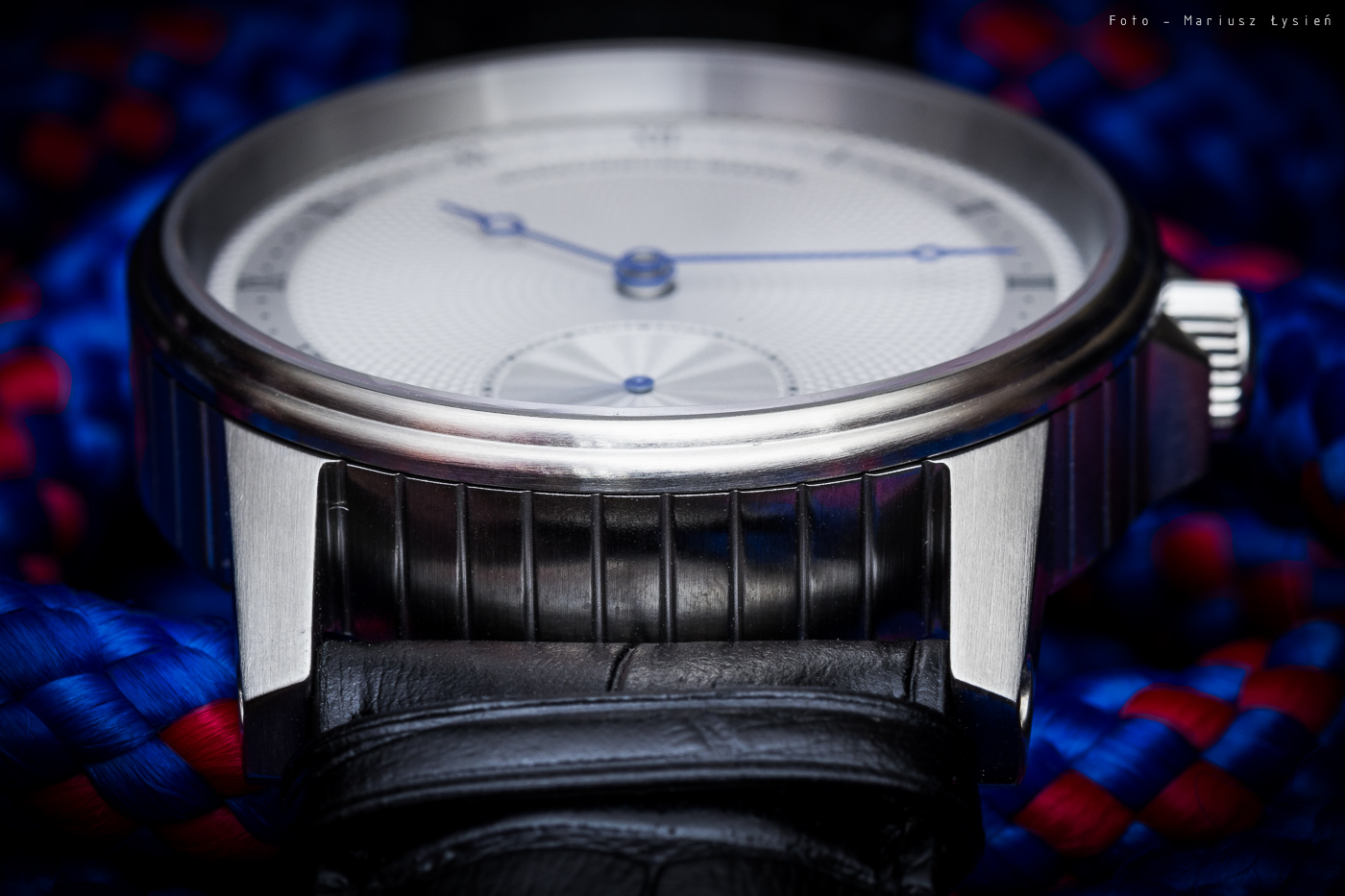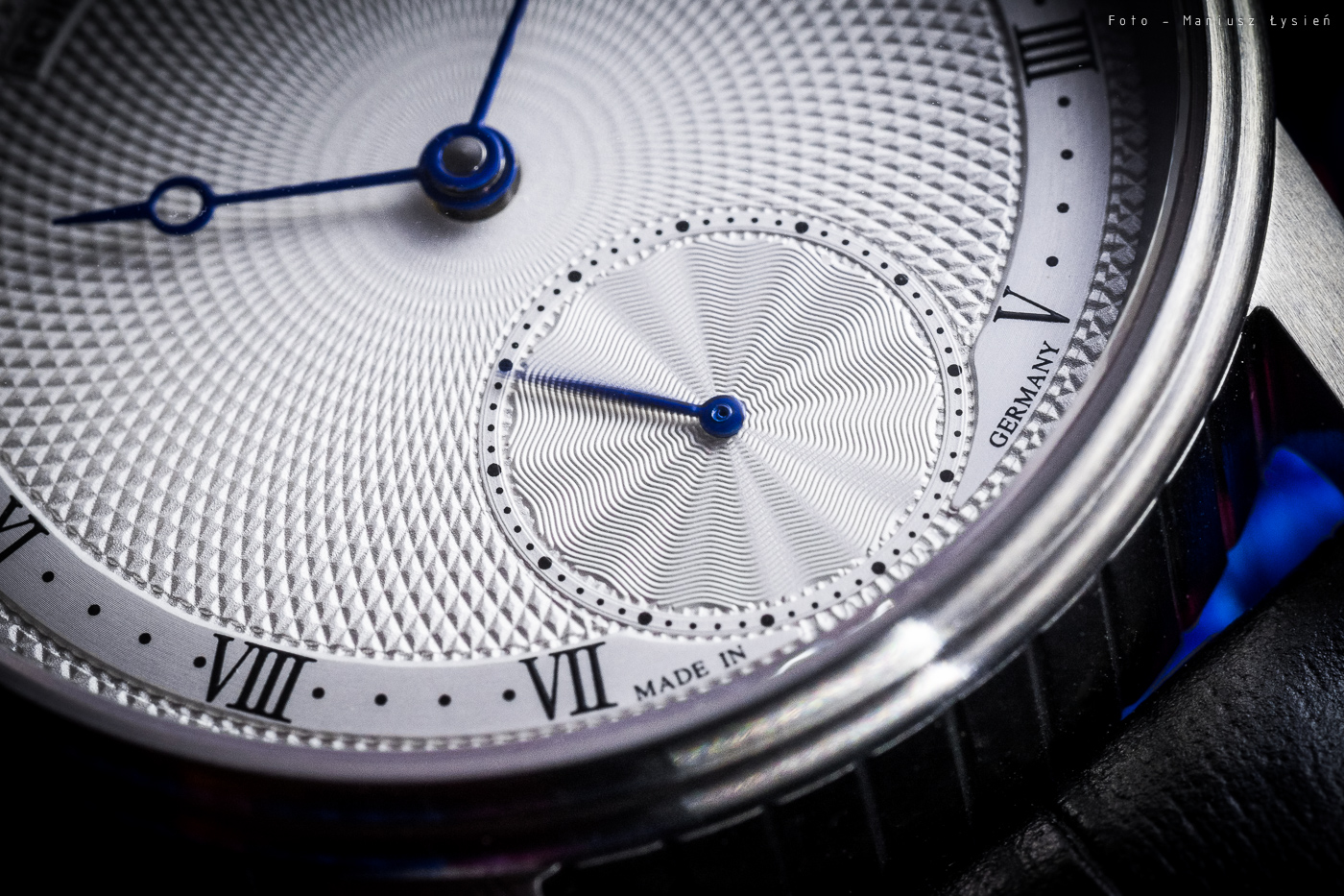Pierwszym jest giloszowana powierzchnia cyferblatu. Na jej powierzchni znajdziemy jedynie trzy elementy. Pierwszym z nich są indeksy godzinowe w formie cyfr rzymskich, które uzupełnia podziałka minutowa. Drugim jest logo producenta na godzinie 12, a całości dopełnia ostatni element, jakim jest umieszczona na godzinie 6 sub-tarcza sekundnika. Na tarczy panuje definitywny porządek, a wspomniany wzór giloszowania jest dzięki temu wyeksponowany. I bardzo słusznie, gdyż mimo, że klasyczny to robi naprawdę pozytywne wrażenie. W dodatku nawet oglądając go pod dużym powiększeniem, nie znajdziemy nic co można by mu zarzucić. W dodatku tego rodzaju zdobienie powierzchni cyferblatu pojawia się raczej nieczęsto w zegarkach wyposażonych we wspomniany na samym początku mechanizm.