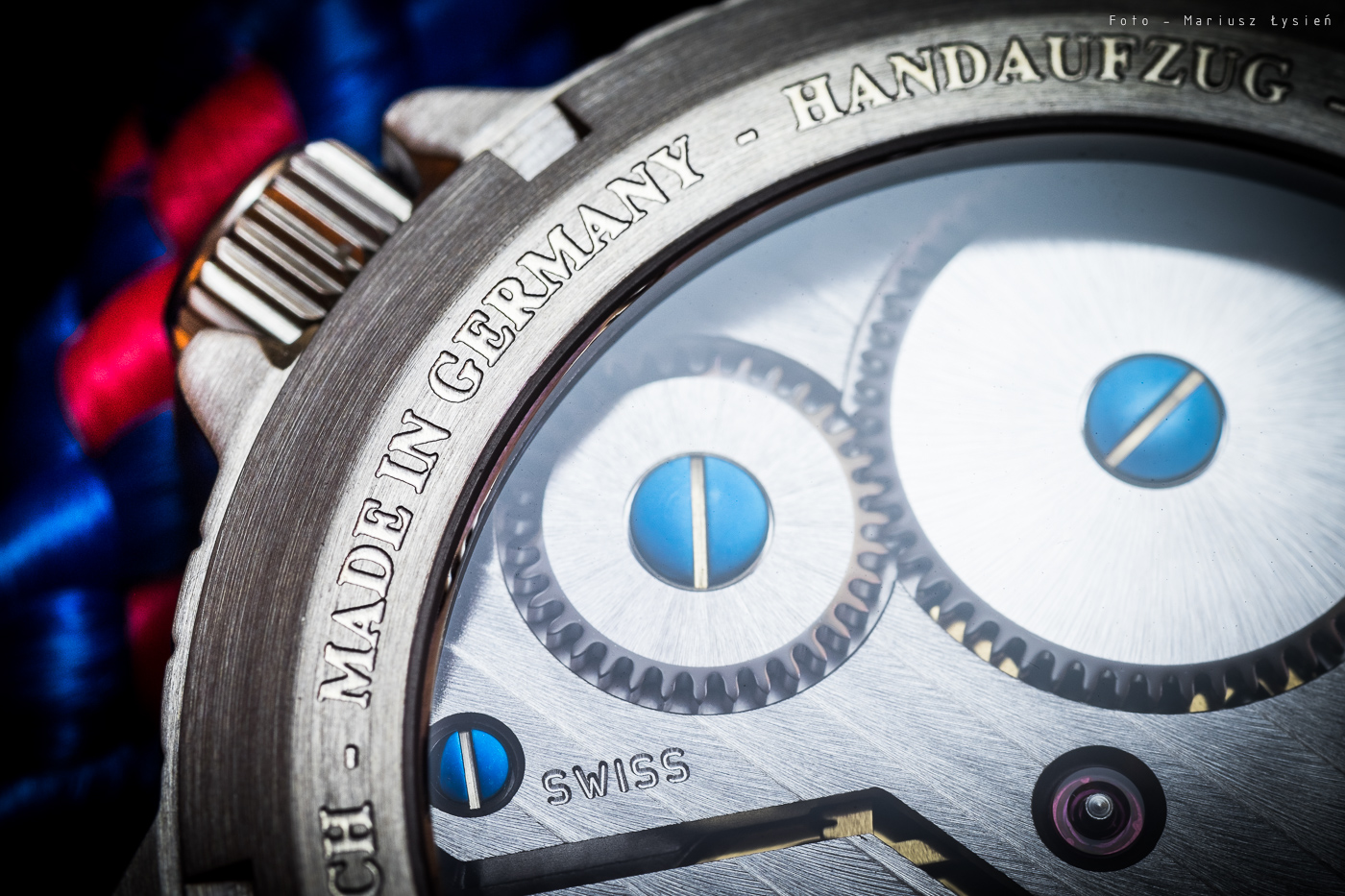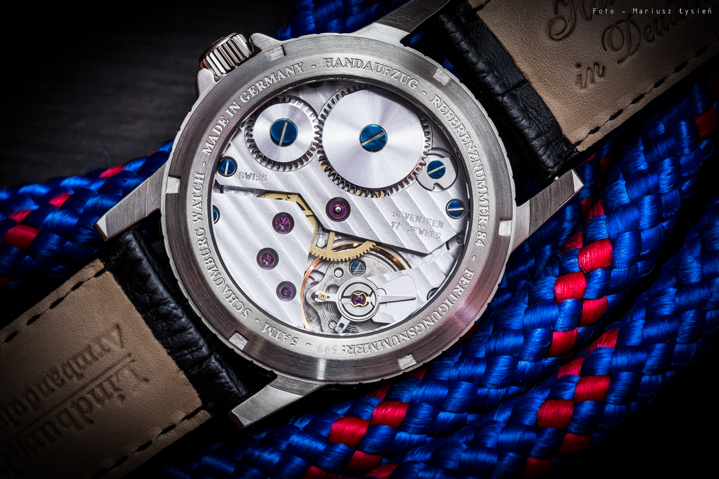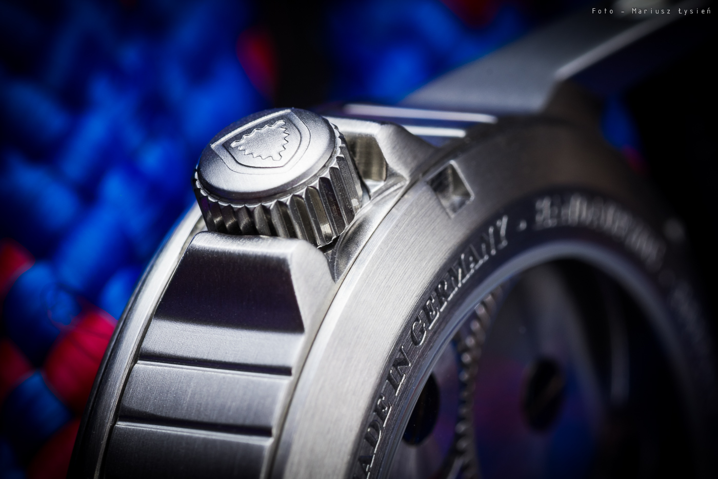 W komplecie z zegarkiem, nabywca otrzymuje skórzany pasek, który sprawia dobre wrażenie. Na jego odwrocie możemy odnaleźć informację, że został on ręcznie wykonany w Niemczech. W tym miejscu powinienem wspomnieć o sposobie montażu paska. Zamiast klasycznych teleskopów, mamy skręcane tuleje, dzięki czemu wymiana paska jest prosta, a przy tym istnieje mniejsze ryzyko porysowania koperty.