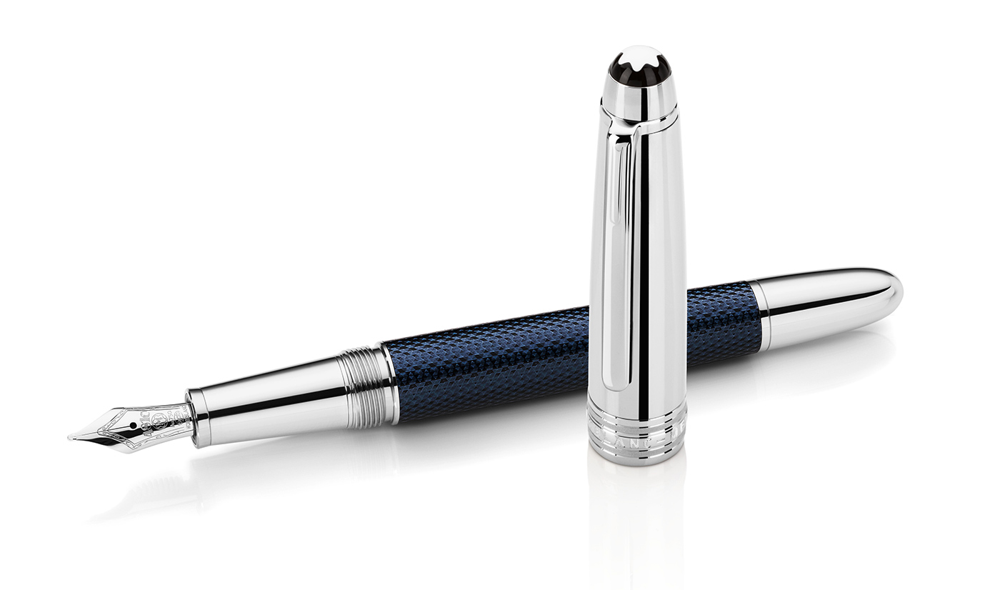 Pierwszym z piór wiecznych w nowej kolekcji jest Doué Classique, którego korpus ozdobiono mieniącym się, geometrycznym, sześciokątnym wzorem, który finalnie pokryto niebieskim lakierem. Platynowana skuwka, sekcja oraz zwieńczenie korpusu tworzą interesujący kontrast. Wykonana z 18 karatowego złota stalówka, posiada wzór charakterystyczny dla piór produkowanych przez firmę Montblanc. Dla ujednolicenia kolorystyki, element ten jest rodowany. Pióro to jest zresztą najmniejszym modelem z tej serii.