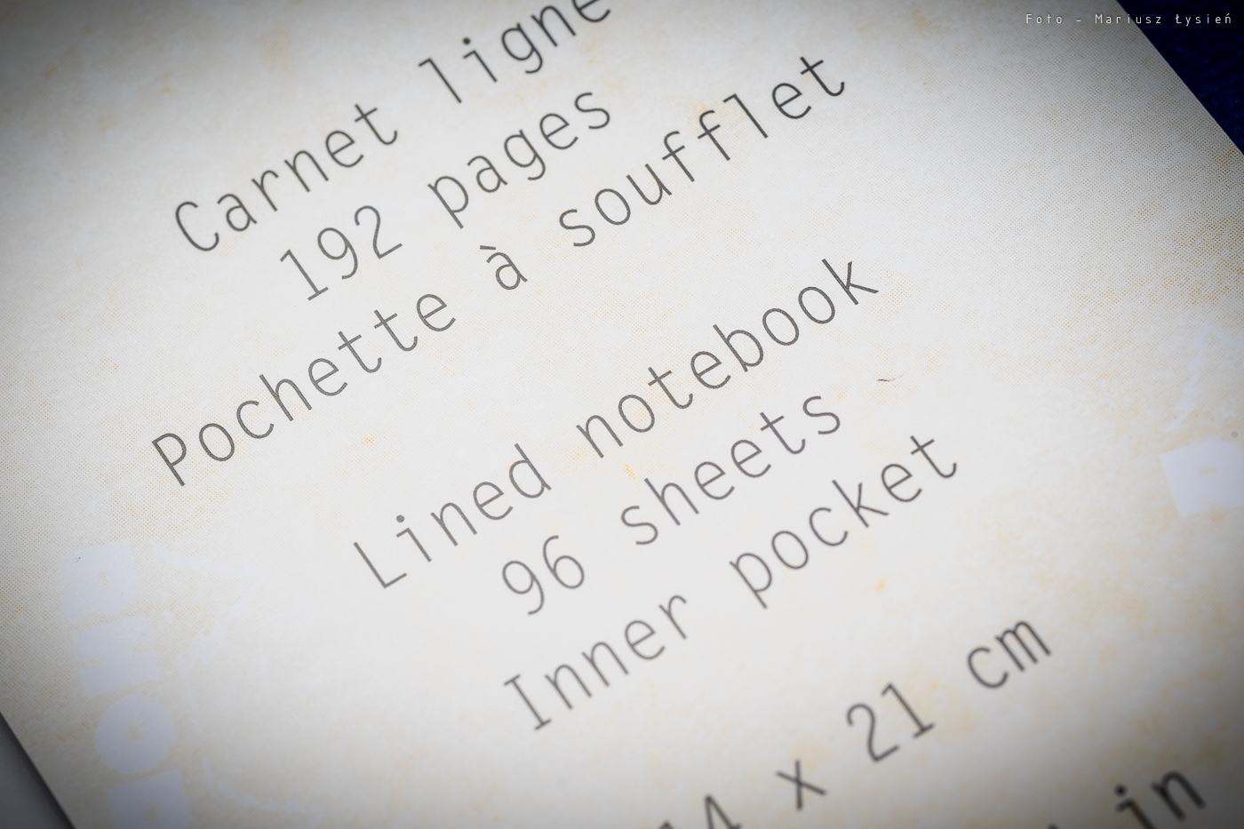 Wszystkich niezbędnych informacji o produkcie dostarcza papierowa opaska, na której znajdziemy także informację o papierze. Jest on produktem firmy Clairefontaine i charakteryzuje się gramaturą wynoszącą 90g. Na stronie internetowej znajdziemy także informację o jego neutralnym pH i bezkwasowości. Informację tę znajdziemy także na pierwszej ze 192 stron liniowanego papieru. Tym, czym firma chwali się w przypadku każdego swojego produktu, jest informacja, że wykonano go we Francji.
