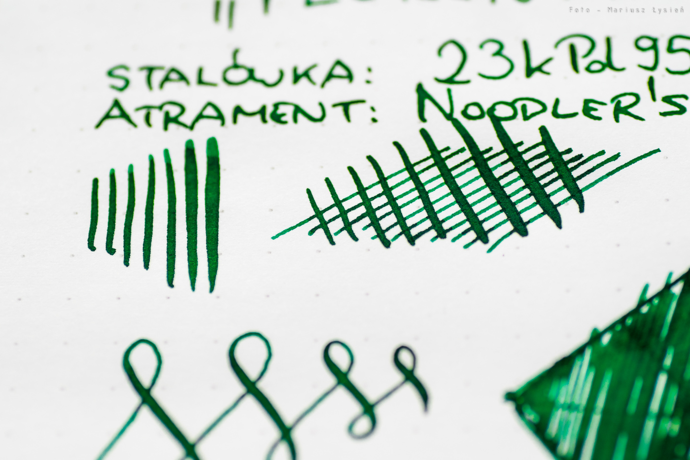 Palladowa stalówka Dreamtouch w tym przypadku była o szerokości „F”. Pisze ona doskonale, a przy tym umożliwia spore możliwości jeżeli chodzi o zmianę grubości linii. Przyznam w tym miejscu, że prywatnie wolałbym „M”, gdyż one jeszcze lepiej trafiają w moje preferencje, jednak niezależnie od szerokości, muszę przyznać, że stalówki Dreamtouch są doskonałe. Sposób w jaki suną po papierze, a także ich podatność nawet na niewielki nacisk jest tym, co uważam za doskonałe. W dodatku podają one umiarkowanie dużo atramentu, co również trafia w moje preferencje idealnie. Tzn. nie są to stalówki tzw. „lejące”, ale na pewno ilość atramentu na papierze jest bardziej obfita aniżeli to co znamy z większości innych produkowanych obecnie stalówek.