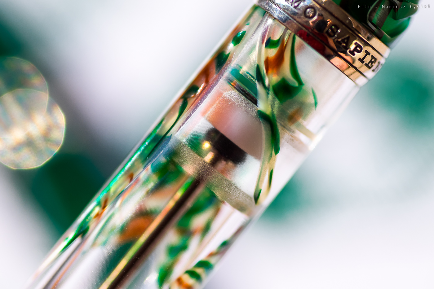 Samo w sobie pióro jest bardzo dobrze wyważone, oraz jest niezwykle przyjemne w dotyku. Zastosowane materiały sprawiają wrażenie gładkich i wręcz aksamitnych”. Z pewnością żywica jest wysokiej jakości. Z uwagi na rozmiary pióra raczej niewiele osób będzie próbowało pisać piórem z założoną na tył skuwką, jednak takie rozwiązanie odradzam, gdyż wtedy pióro dosyć mocno przeważa się w tył. Zamknięte pióro mierzy 14,5cm, natomiast waga wynosi 36g.