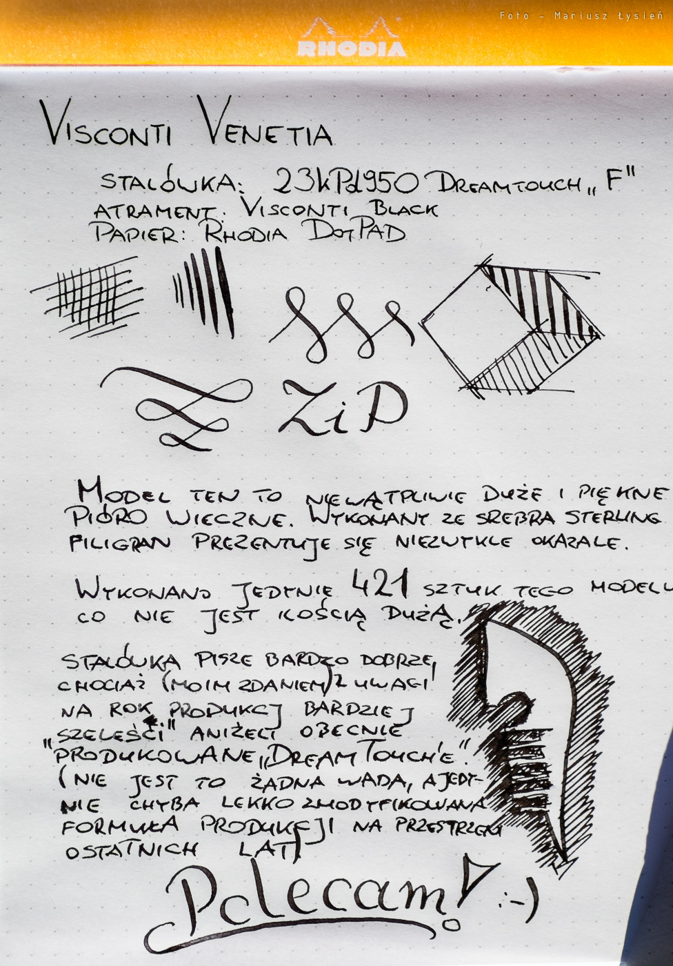 Visconti Venetia to piękne i doskonale wykonane pióro, które w dodatku wykonano w stosunkowo niewielkiej ilości egzemplarzy, co przy jego cenie wydaje się ciekawą propozycją zarówno dla osób planujących używać go na codzień, jak i dla kolekcjonerów. Cena ta jeszcze niedawno wynosiła w polskich sklepach około 5900zł (niedawno – bo pióro staje się coraz trudniej dostępne). Nie jest to oczywiście pióro tanie, ale jeżeli weźmiemy pod uwagę prestiż producenta, srebrny filigran, palladową stalówkę oraz wielkość limitacji, to okaże się, że cena ta jest całkiem atrakcyjna, gdyż często pióra wyprodukowane w dwukrotnie większej ilości egzemplarzy potrafią być dwukrotnie droższe. Ja model Venetia mogę zdecydowanie polecić.