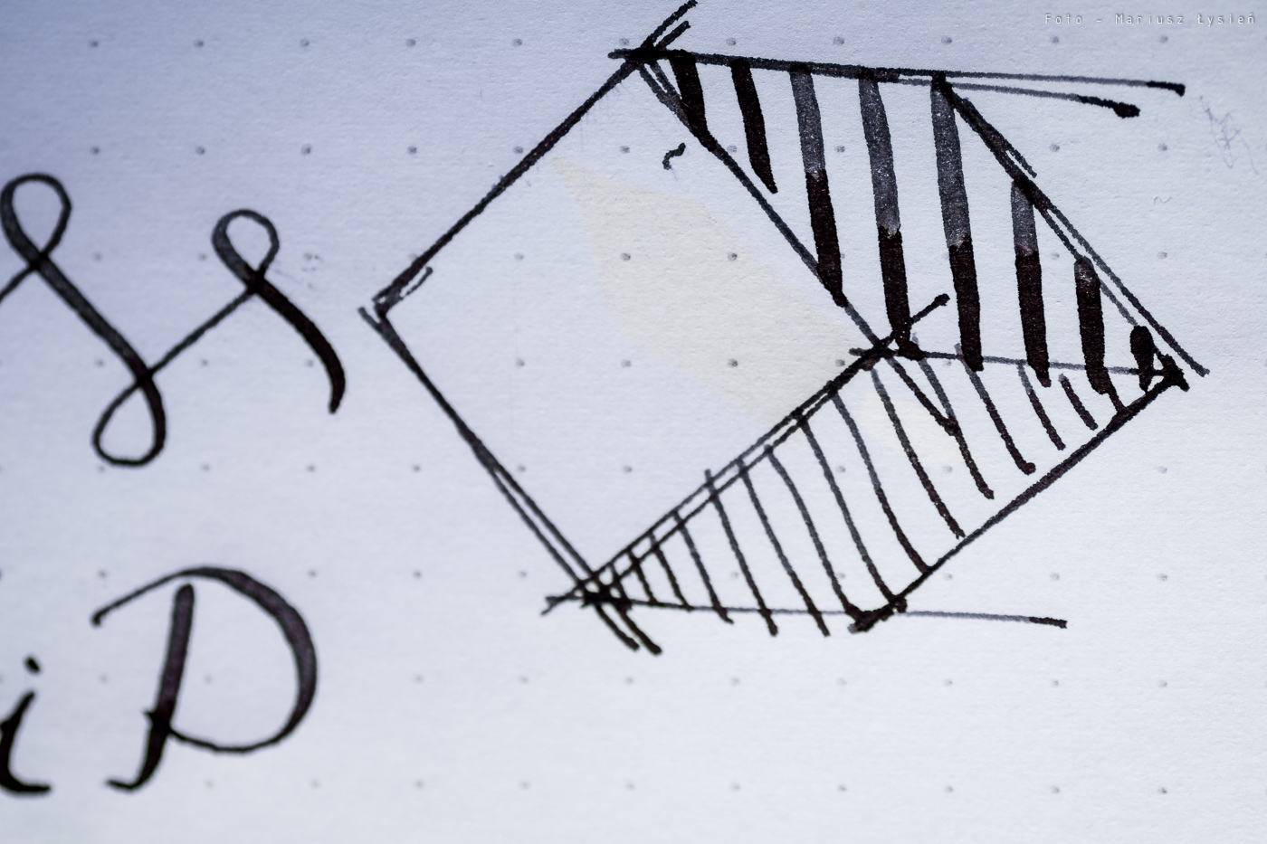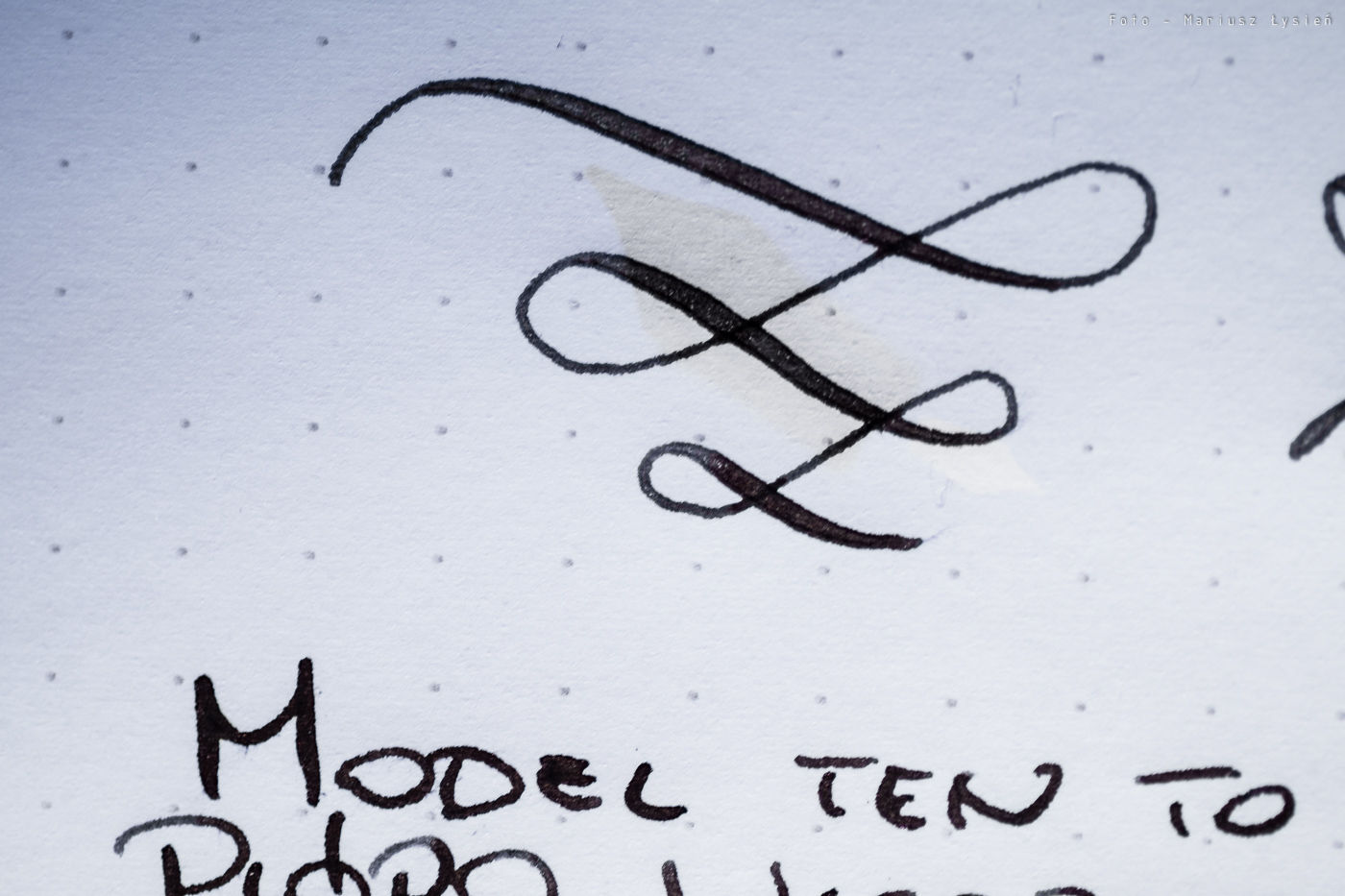 W piórze zamontowano palladową stalówkę (23k Pd 950) Dreamtouch. Osobiście muszę przyznać, że uwielbiam to, jak piszą te stalówki. Ciekawą zaobserwowaną cechą jest, że starsze rocznikowo stalówki mają trochę inną charakterystykę, aniżeli te produkowane obecnie. O ile ich elastyczność jest na podobnym poziomie, to te sprzed kilku lat są minimalnie głośniejsze w kontakcie z papierem. Nie chciałbym absolutnie użyć słowa, że drapią, gdyż jedne jak i drugie pięknie suną po papierze, jednak te nowe są praktycznie bezgłośne, podczas gdy te sprzed kilku lat wydają delikatny odgłos (i minimalnie inaczej się prowadzą). Są to różnice tak subtelne, że być może kto inny nie zwróci nawet na to uwagi. Niemniej stalówka spisuje się świetnie. Dzięki niej możemy uzyskać linie od 0,5 do 1mm, a możliwe jest osiągnięcie nawet szerokiej na 1,5mm linii (jednak w tym przypadku konieczny jest już mocniejszy nacisk). Trzeba przyznać, że w świetle tego co obserwujemy obecnie na rynku jest to wynik doskonały. Co istotne – ze stalówką nie musimy się siłować, gdyż jest ona bardzo miękka i elastyczna.