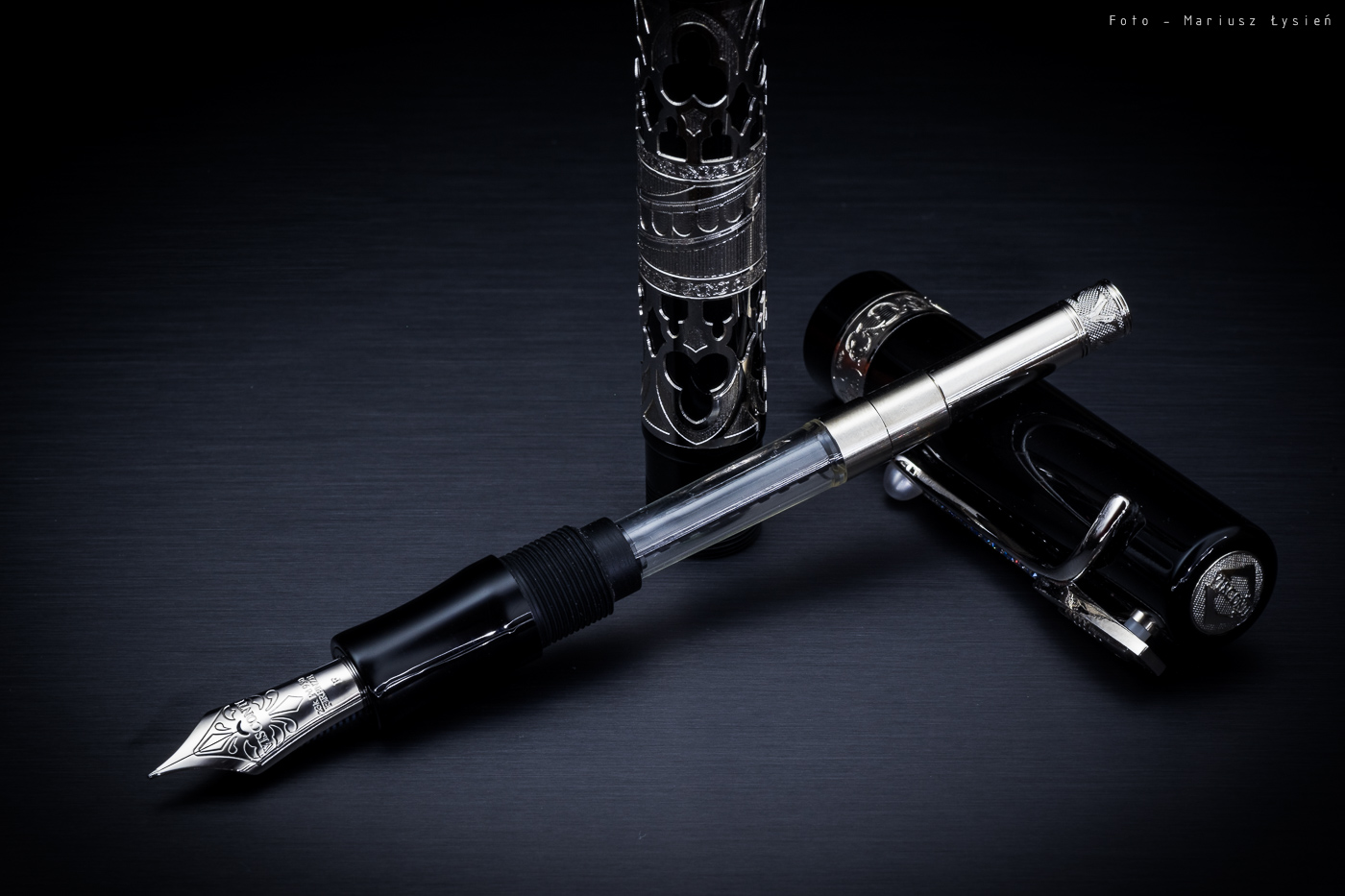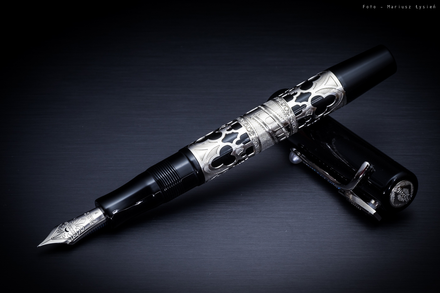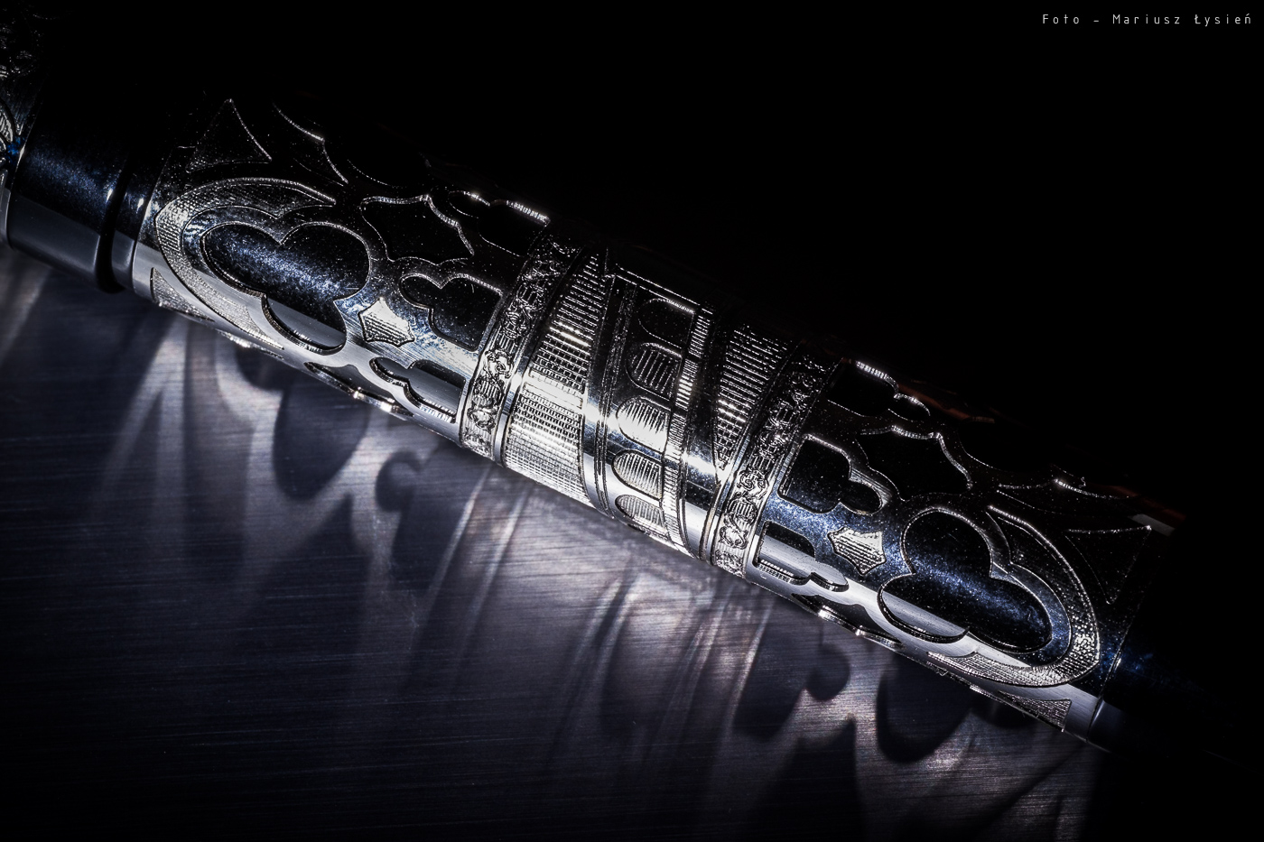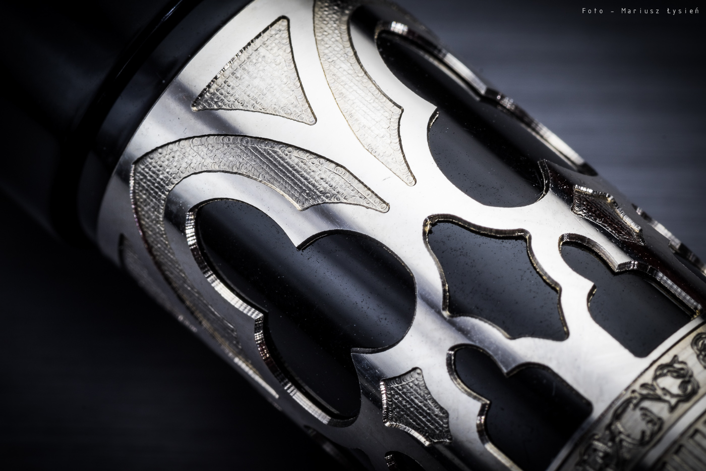 Srebrny element zresztą najmocniej rzuca się w oczy. Na korpusie wykonanym z czarnej żywicy widoczny jest filigran wykonany ze srebra sterling. Z tego samego metalu zrobiono także pierścień zdobiący skuwkę, na którym wybito próbę (AG925). Wspomniany filigran nawiązuje swoją tematyką do architektury typowej dla Wenecji, a w jego centralnej części znajdziemy podobiznę znanego mostu – Rialto. Jakość wykonanych ręcznie zdobień jest bardzo wysoka. Wszelkie krawędzie są doskonale równe i nawet pod dużym powiększeniem widoczna jest dbałość o detal jaką wykazał się producent. Sama skuwka jak i sekcja, zostały wykonane z tego samego materiału co korpus, czyli z żywicy w kolorze czarnym.