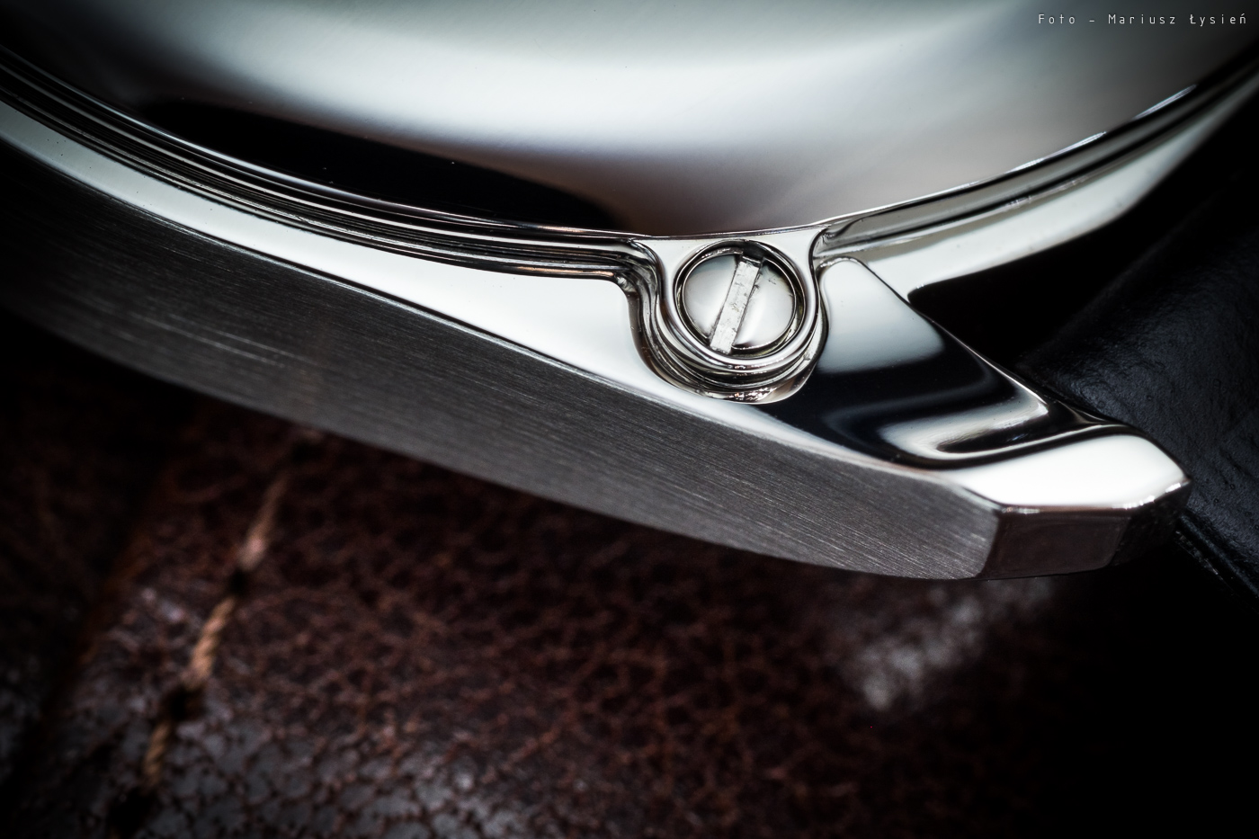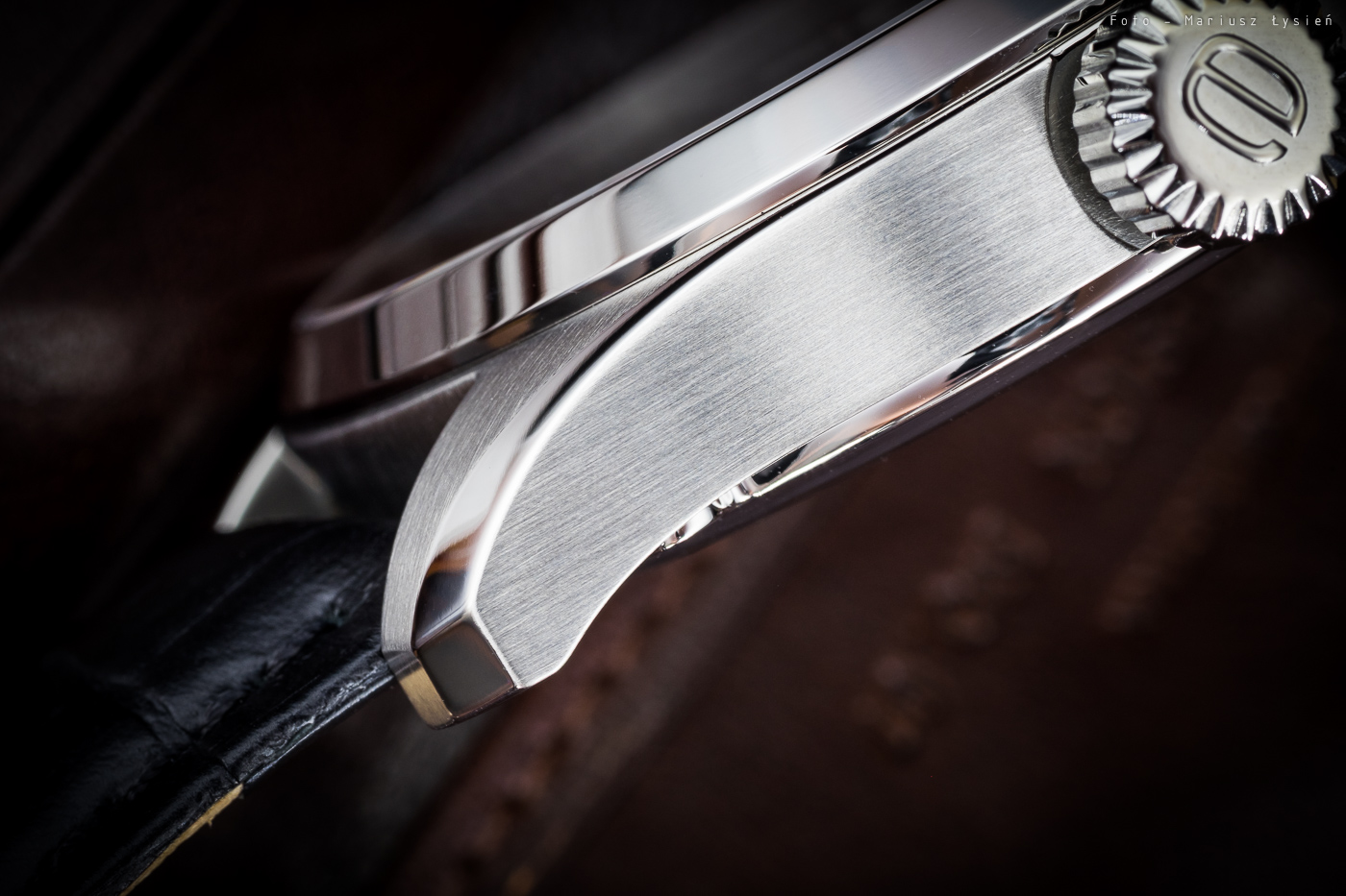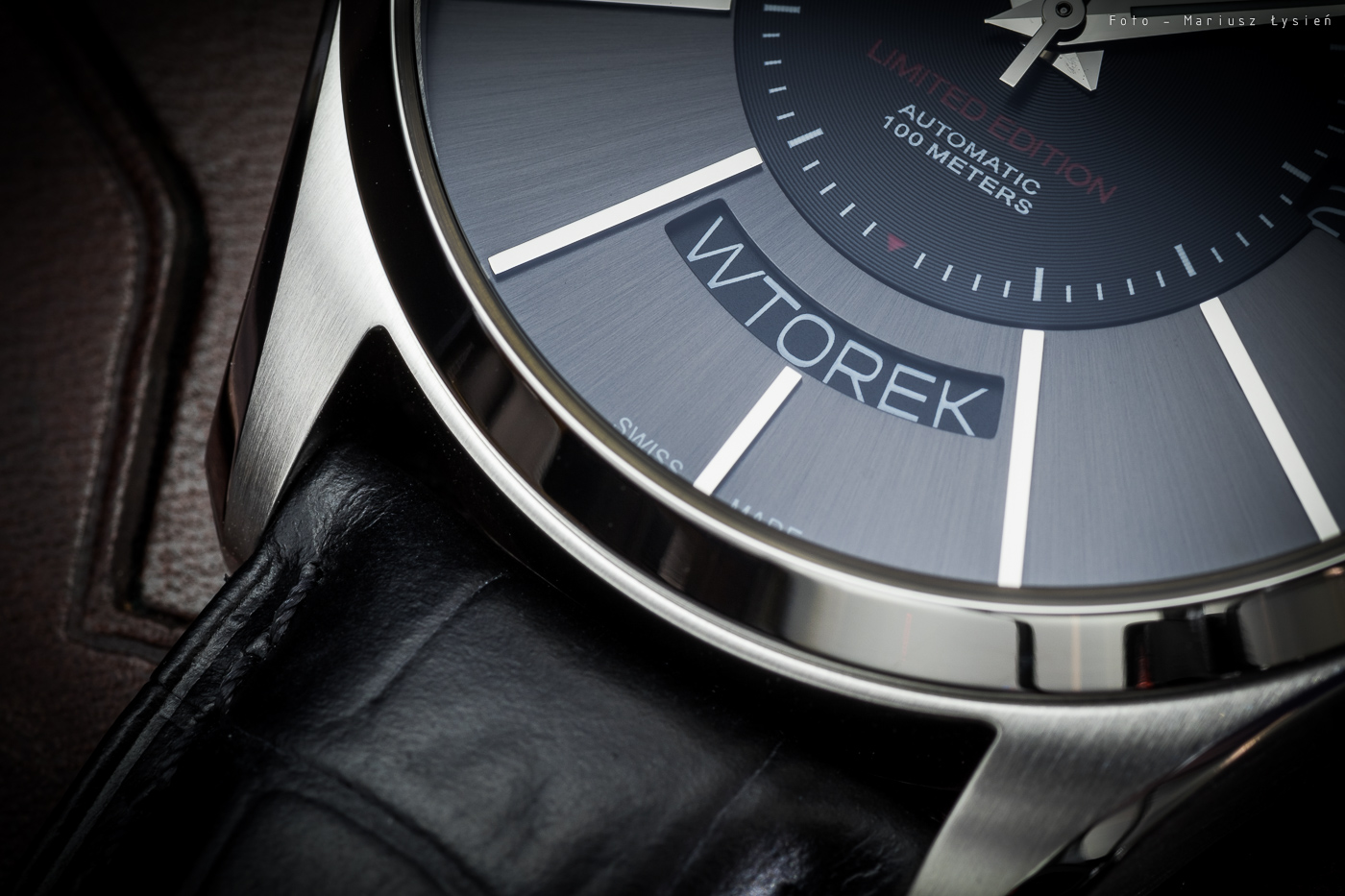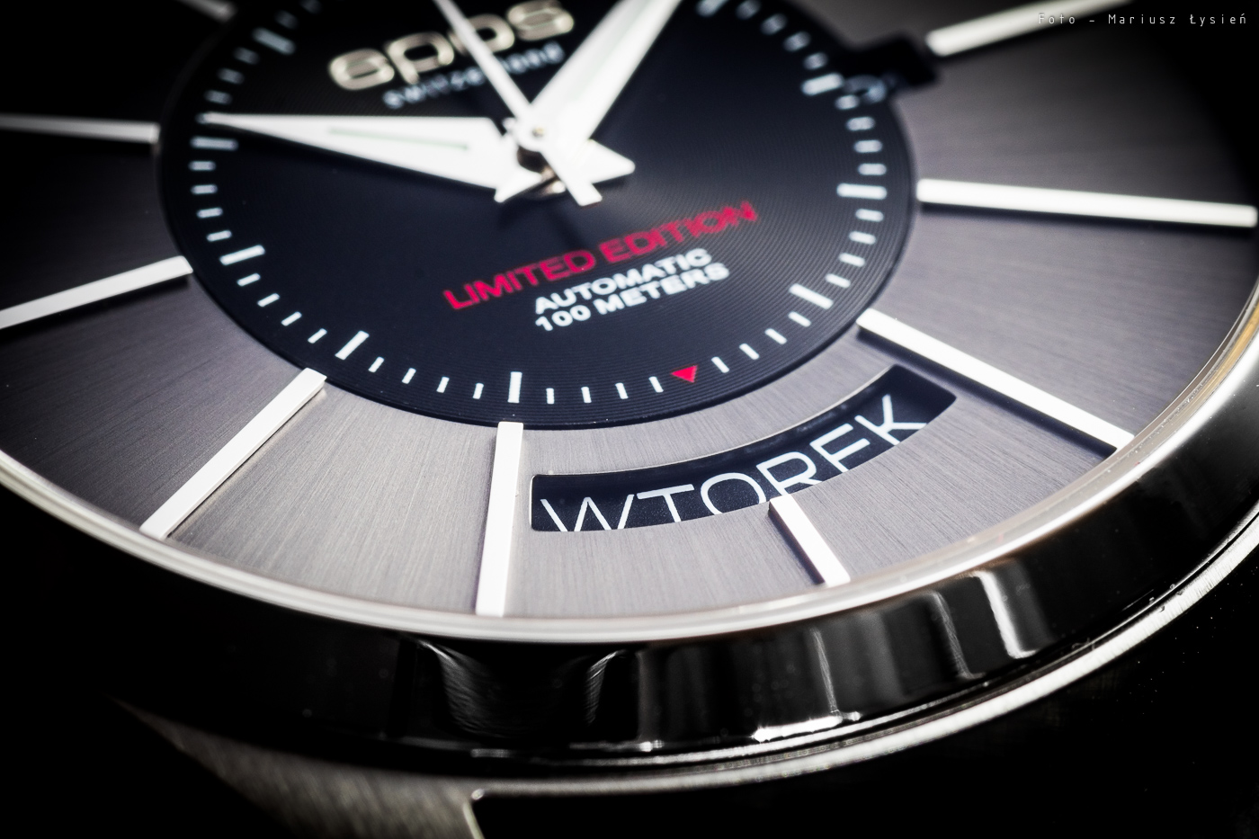 Na godzinie 3 znajdziemy jedno z dwóch okienek datownika – pokazuje ono aktualny dzień miesiąca. Na godzinie 6 umieszczono najbardziej charakterystyczny element tego modelu. Mowa o okienku wskazującym dzień tygodnia – co więcej… w języku polskim. Napisy ładnie wypełniają wycięcie w tarczy. Całość chroni szkło szafirowe.