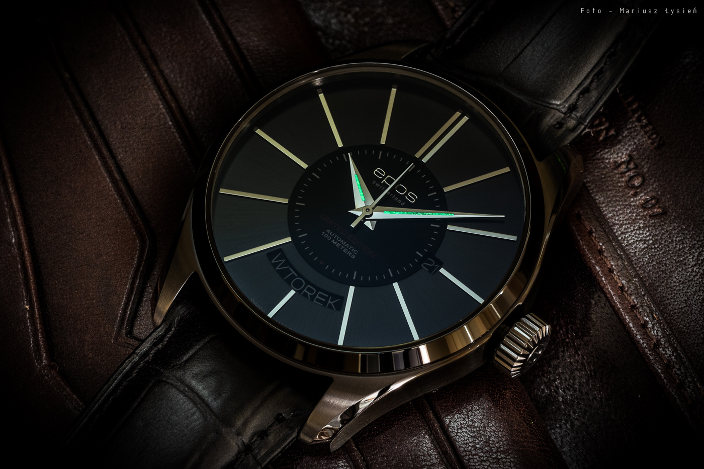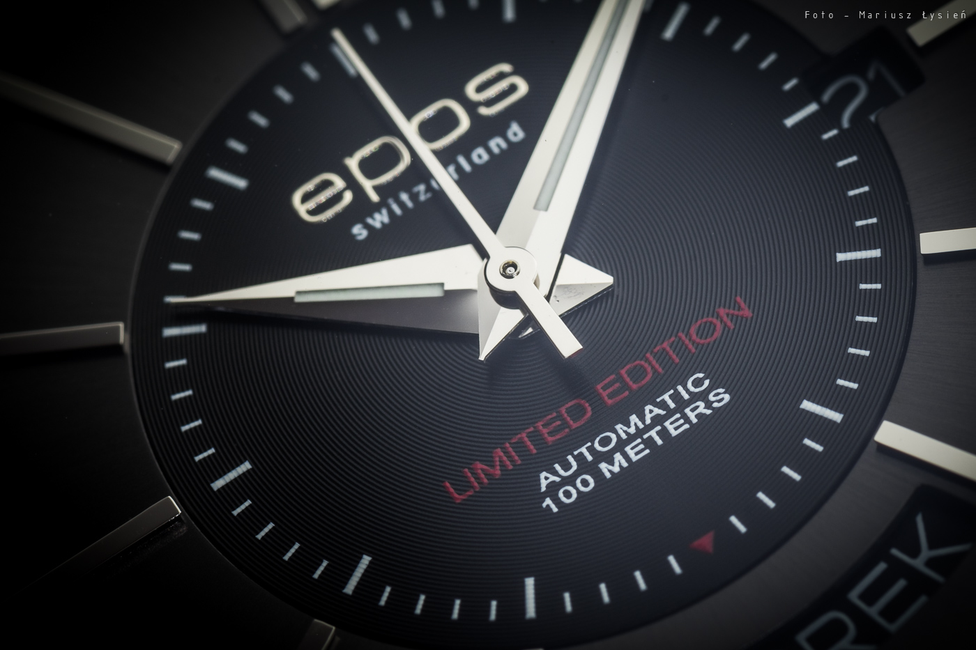 To właśnie cyferblat jest jednym z elementów, który jest w tym zegarku wyjątkowy. Zewnętrzny pierścień ma kolor będący na pograniczu szarości i brązu. Co więcej – jego powierzchnia została ozdobiona szlifem słonecznym, co dodaje mu dodatkowego uroku. Umieszczono na nim proste, prostokątne indeksy godzinowe, wraz ze zdublowanym indeksem na godzinie 12. W centrum znajdziemy czarny (choć kolor ten nie jest zbyt ciemny – raczej stara się nawiązać do zewnętrznego okręgu) dysk, którego powierzchnię pokrywają drobne okręgi. Na tym tle odnajdziemy nakładane logo producenta, informacje o tym, że jest to edycja limitowana, wzmiankę o wodoodporności czy też rodzaju zastosowanego naciągu. W tym miejscu znalazła się także podziałka centralnego sekundnika, którego ramię skrócono właśnie do promienia wewnętrznego dysku. Jest to bardzo ciekawy zabieg, przywołujący u mnie skojarzenia z modelem 3386 z kolekcji Sophistiquée, a który swego czasu był jednym z najchętniej wybieranych czasomierzy firmy Epos. Moim zdaniem to bardzo ciekawe odwołanie, które w dodatku w tym przypadku wygląda naprawdę dobrze. Krótka wskazówka sekundnika nie zaburza niepotrzebnie przestrzeni zewnętrznego pierścienia, a w dodatku podziałka jak i wskazówka, ciekawie ożywiają wewnętrzną część tarczy.