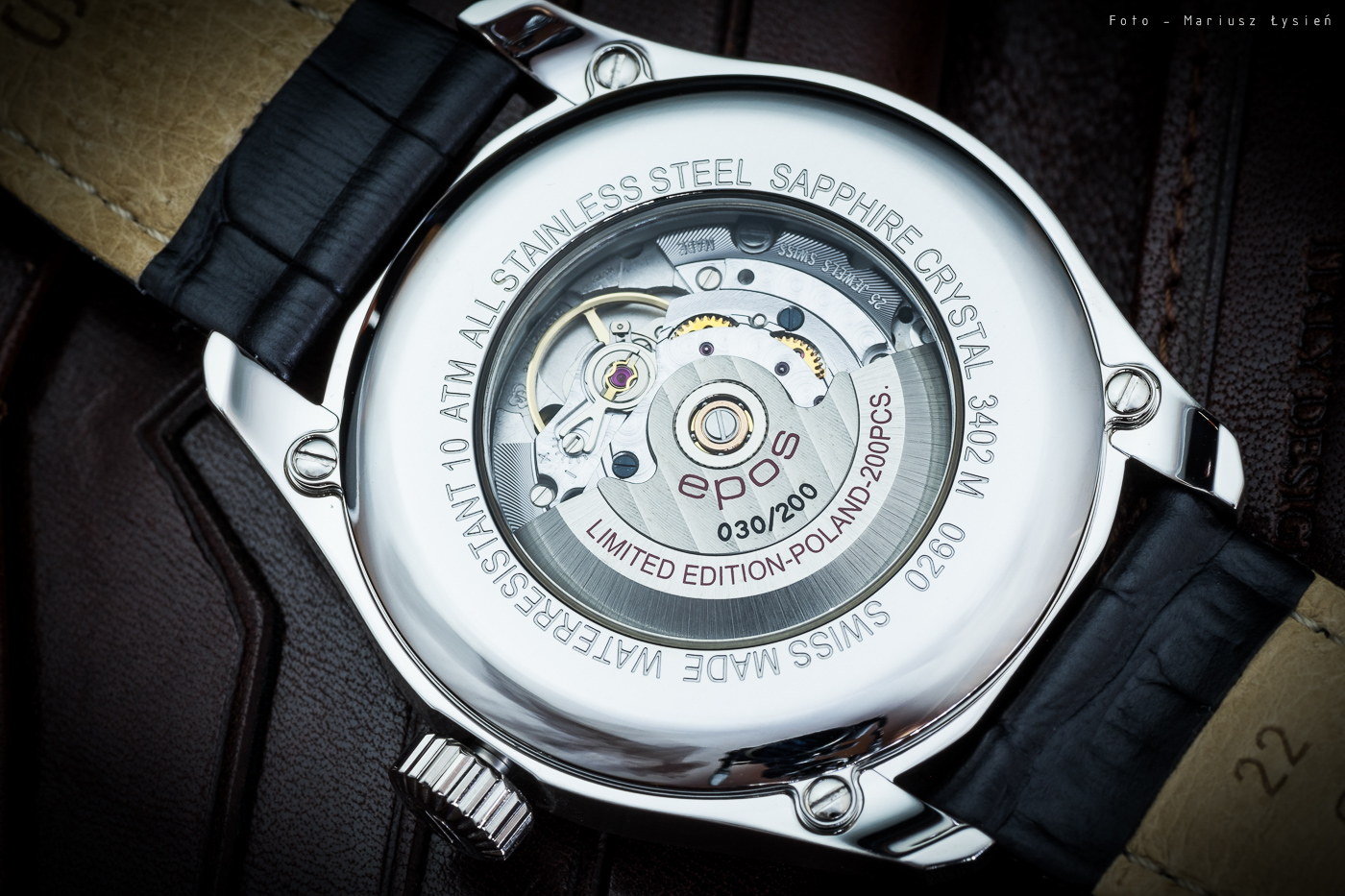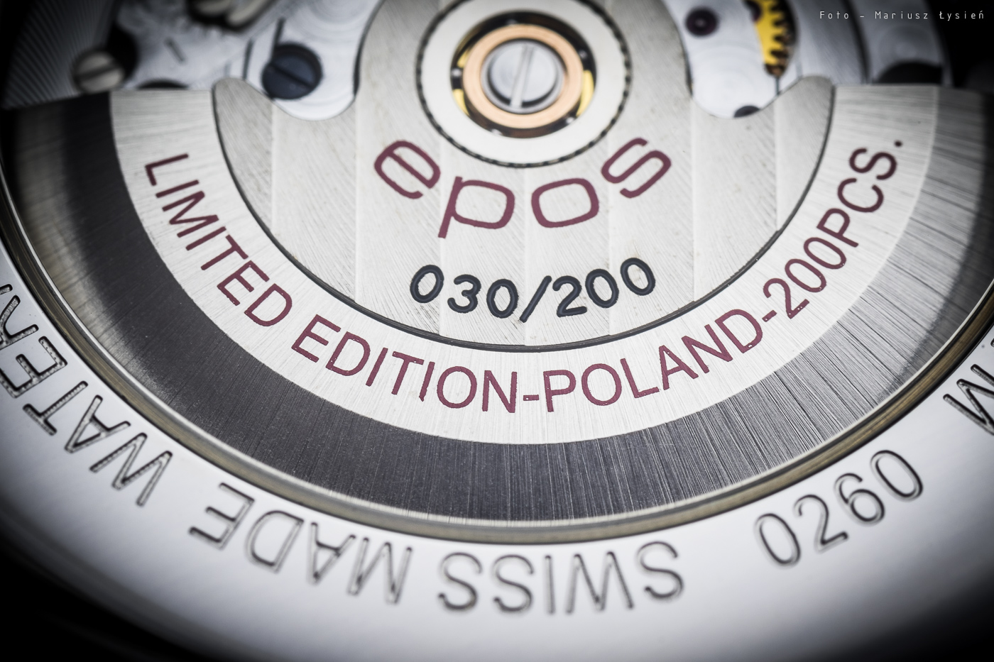 Z tyłu zegarka odnajdziemy przeszklony dekiel, który zamocowano za pomocą czterech śrub. Wokół transparentnego wypełnienia naniesiono podstawowe informacje o zegarku. Na wahniku umieszczono czerwone napisy „EPOS” oraz „LIMITED EDITION FOR POLAND-200PCS.”, jak również indywidualny numer czasomierza.