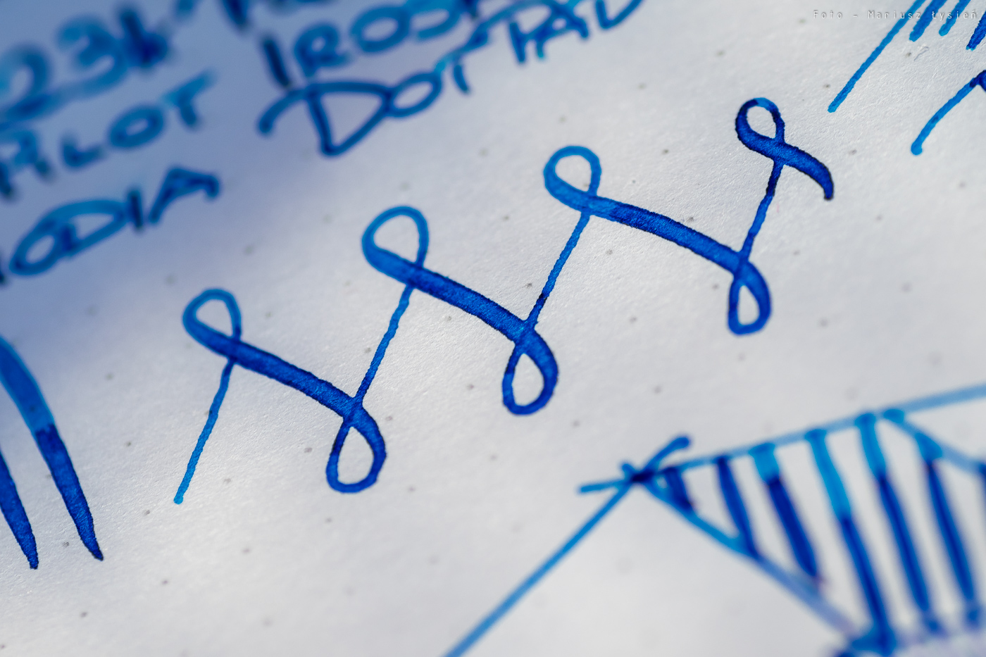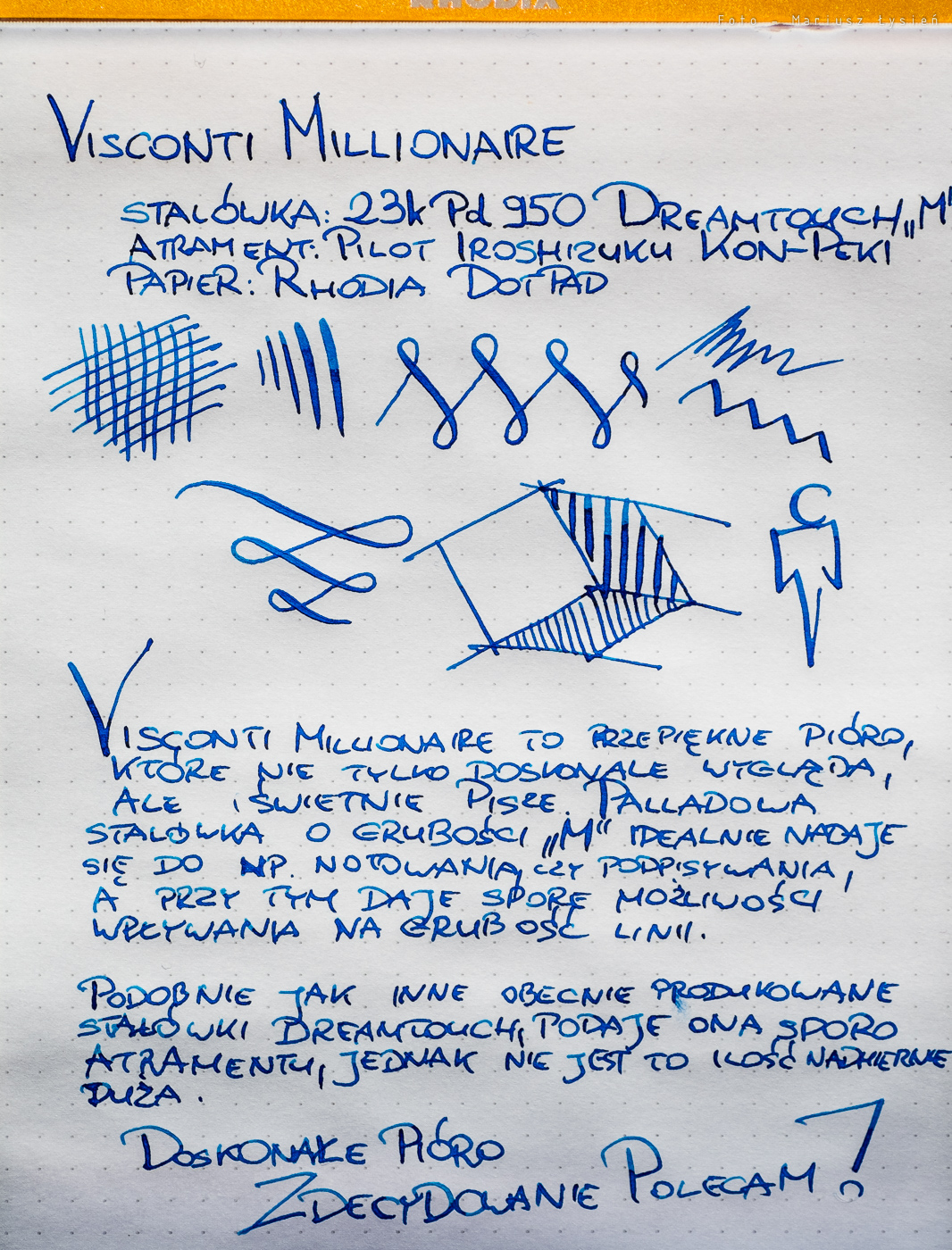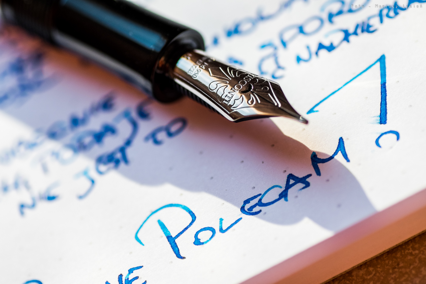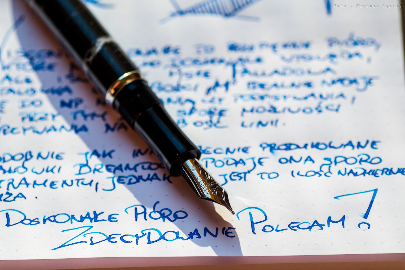 Zastosowana stalówka Dreamtouch została wykonana z 23 karatowego palladu. W testowanym egzemplarzu znalazła się grubość „M”, która muszę przyznać, że jest niezwykle uniwersalna. Daje ona na tyle cienką linię, że bez problemu można używać jej do notowania nawet za pomocą stosunkowo drobnego pisma, jak i nie „znika” przy podpisywaniu dokumentów. W dodatku daje ona spore możliwości zmiany grubości linii pod wypływem nacisku – bez trudu uzyskamy gradację od ok. 0,6 do 1,2mm. Przepływ jest wzorowy, natomiast jeżeli chodzi o ilość podawanego atramentu to jest ona umiarkowanie duża – jest to zresztą charakterystyczne dla tych stalówek. Z pewnością ma to również związek z samą elastycznością stalówki, oraz koniecznością nadążenia podawania atramentu w zależności od stosowanego w danym momencie docisku stalówki do papieru. Przyznam, że zastosowany w teście atrament Pilot Iroshizuku Kon-Peki miałem zatankowany już w wielu piórach, ale moim zdaniem, podczas pisania nim za pomocą tej stalówki efekt był najbardziej spektakularny. Osobiście nie mogę pisać o tej stalówce inaczej niż w samych superlatywach.