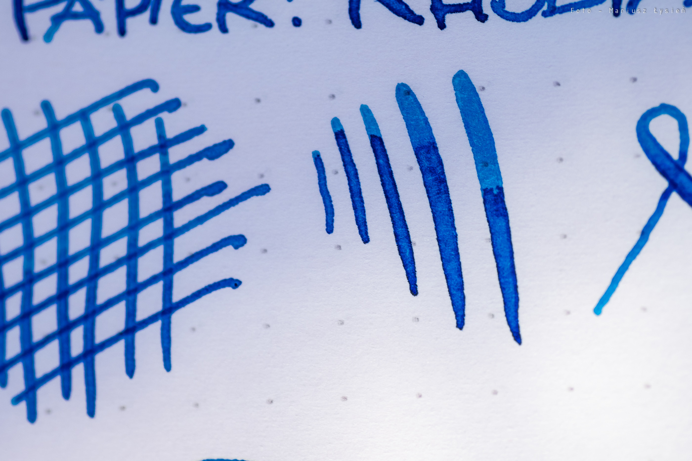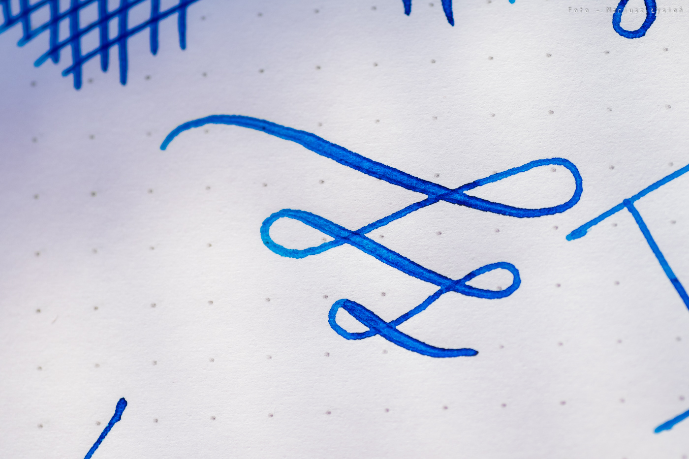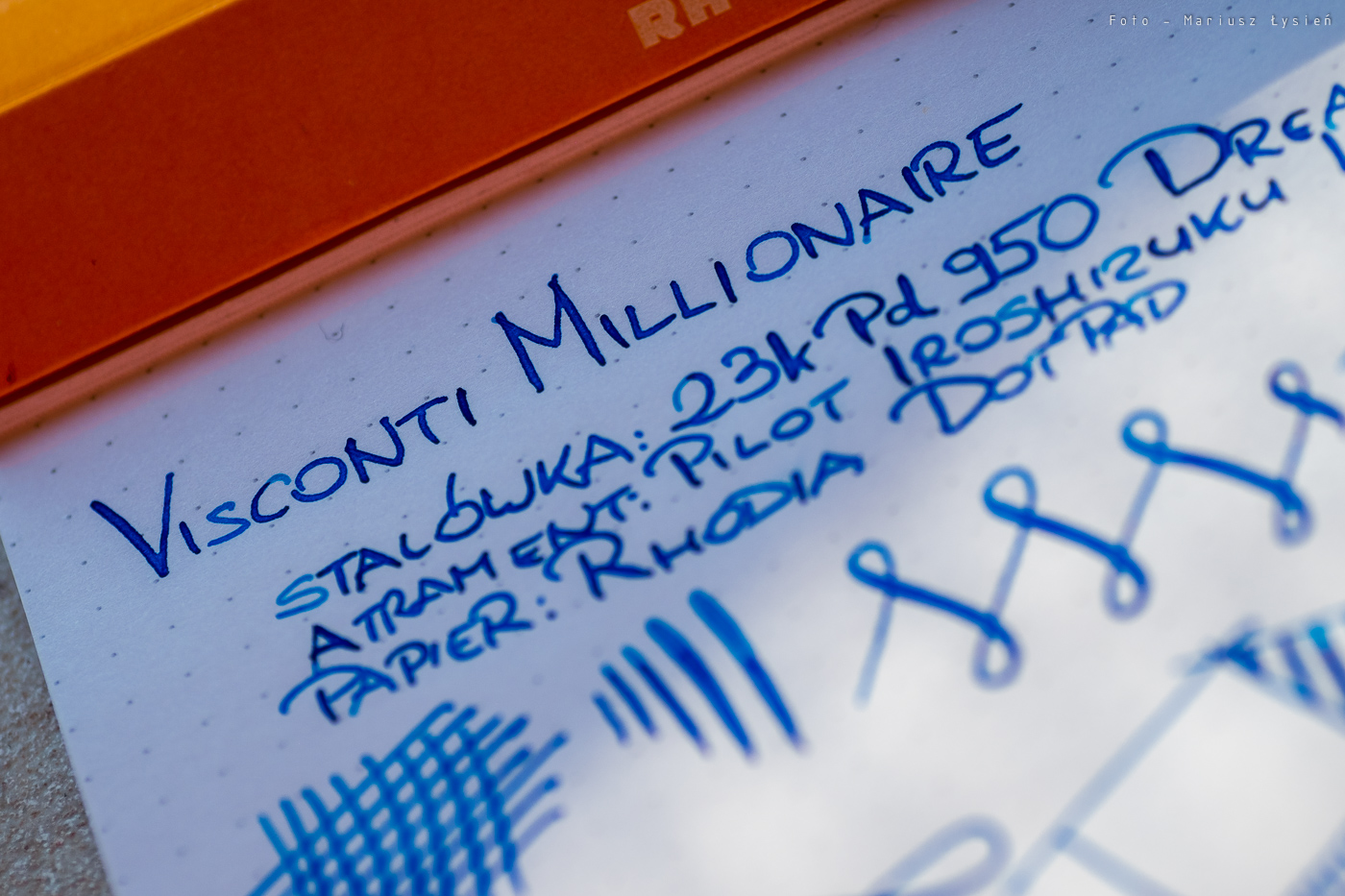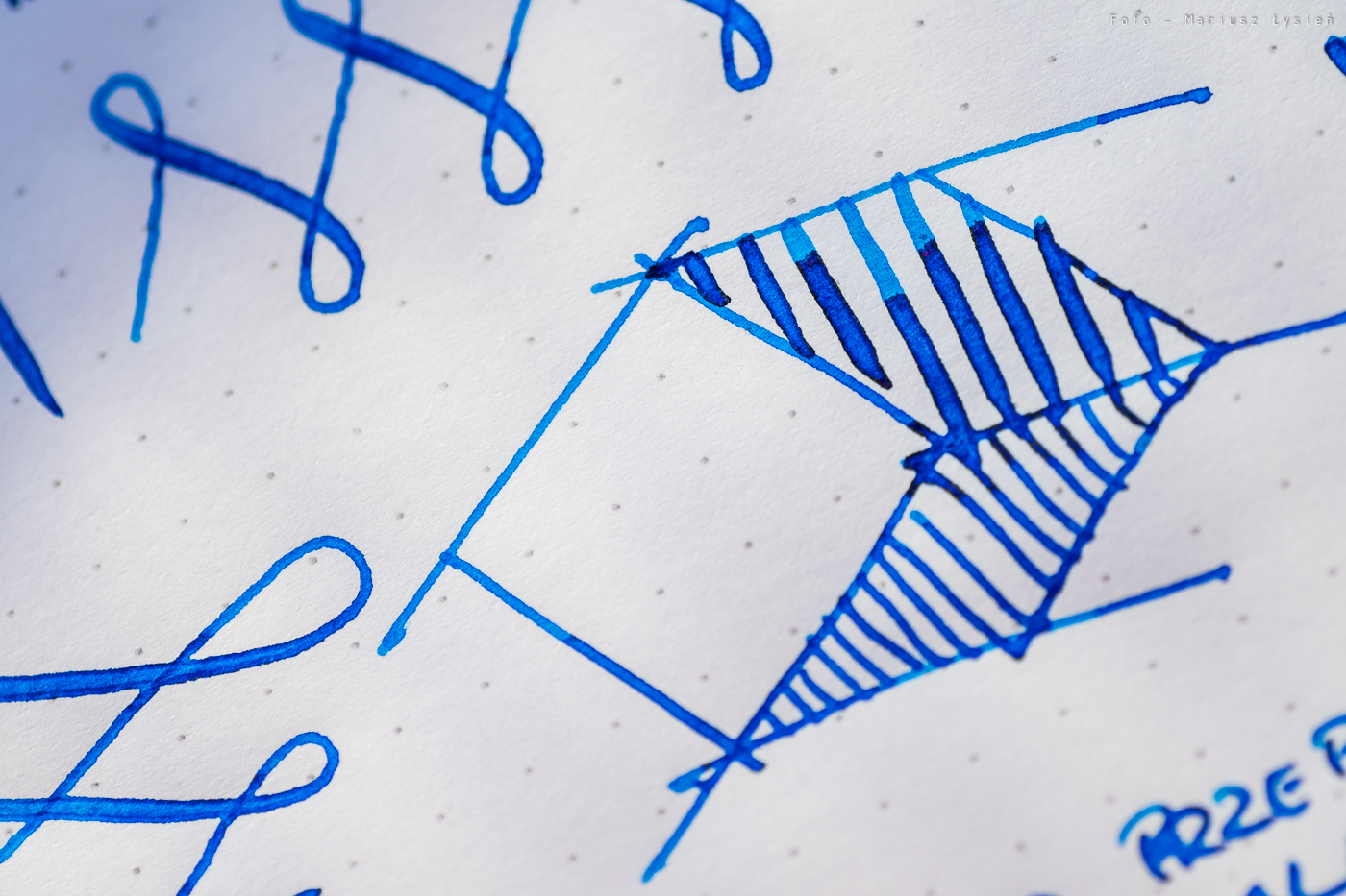 Zastosowana stalówka Dreamtouch została wykonana z 23 karatowego palladu. W testowanym egzemplarzu znalazła się grubość „M”, która muszę przyznać, że jest niezwykle uniwersalna. Daje ona na tyle cienką linię, że bez problemu można używać jej do notowania nawet za pomocą stosunkowo drobnego pisma, jak i nie „znika” przy podpisywaniu dokumentów. W dodatku daje ona spore możliwości zmiany grubości linii pod wypływem nacisku – bez trudu uzyskamy gradację od ok. 0,6 do 1,2mm. Przepływ jest wzorowy, natomiast jeżeli chodzi o ilość podawanego atramentu to jest ona umiarkowanie duża – jest to zresztą charakterystyczne dla tych stalówek. Z pewnością ma to również związek z samą elastycznością stalówki, oraz koniecznością nadążenia podawania atramentu w zależności od stosowanego w danym momencie docisku stalówki do papieru. Przyznam, że zastosowany w teście atrament Pilot Iroshizuku Kon-Peki miałem zatankowany już w wielu piórach, ale moim zdaniem, podczas pisania nim za pomocą tej stalówki efekt był najbardziej spektakularny. Osobiście nie mogę pisać o tej stalówce inaczej niż w samych superlatywach.