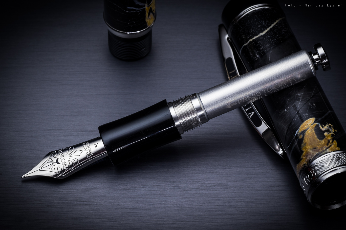 Ciekawy jest natomiast sposób napełniania pióra. Po odkręceniu korpusu (co czynimy dokładnie tak samo jak w każdym piórze napełnianym za pomocą naboi bądź konwertera), naszym oczom ukazuje się wykonany z metalu element odpowiedzialny właśnie za napełnianie pióra. Na jego boku znajdziemy również instrukcje mówiące o tym w którą stronę należy przesunąć tłok, aby napełnić bądź opróżnić zbiornik atramentu.