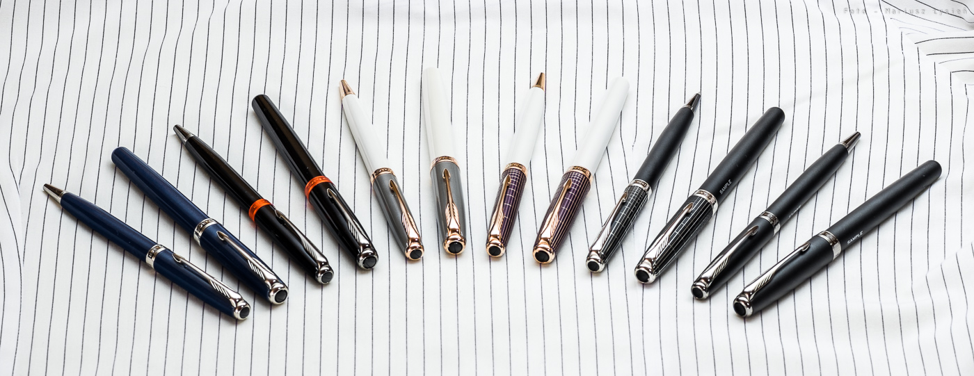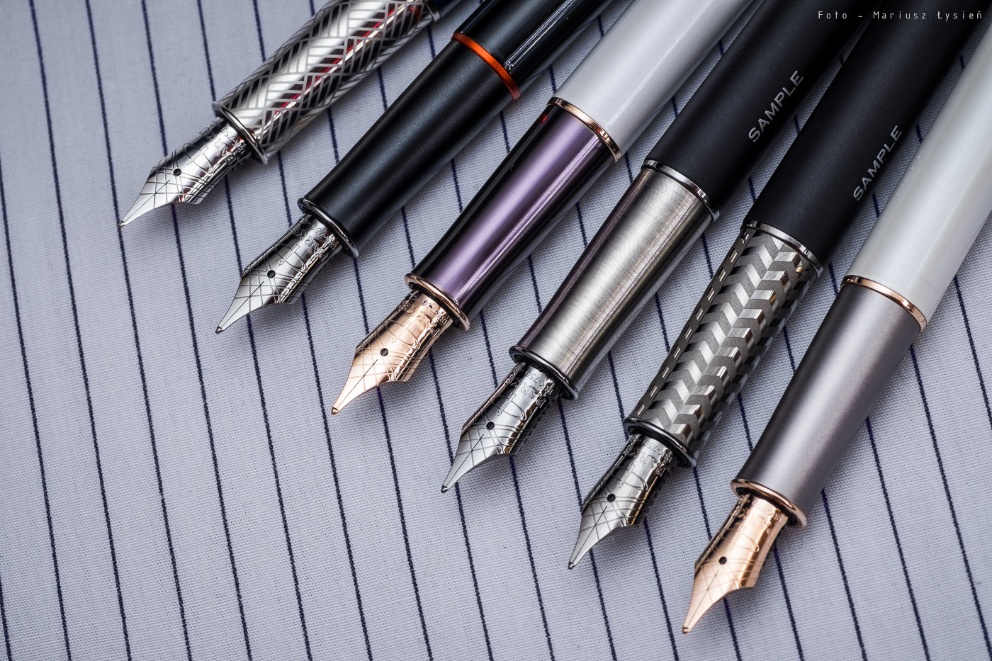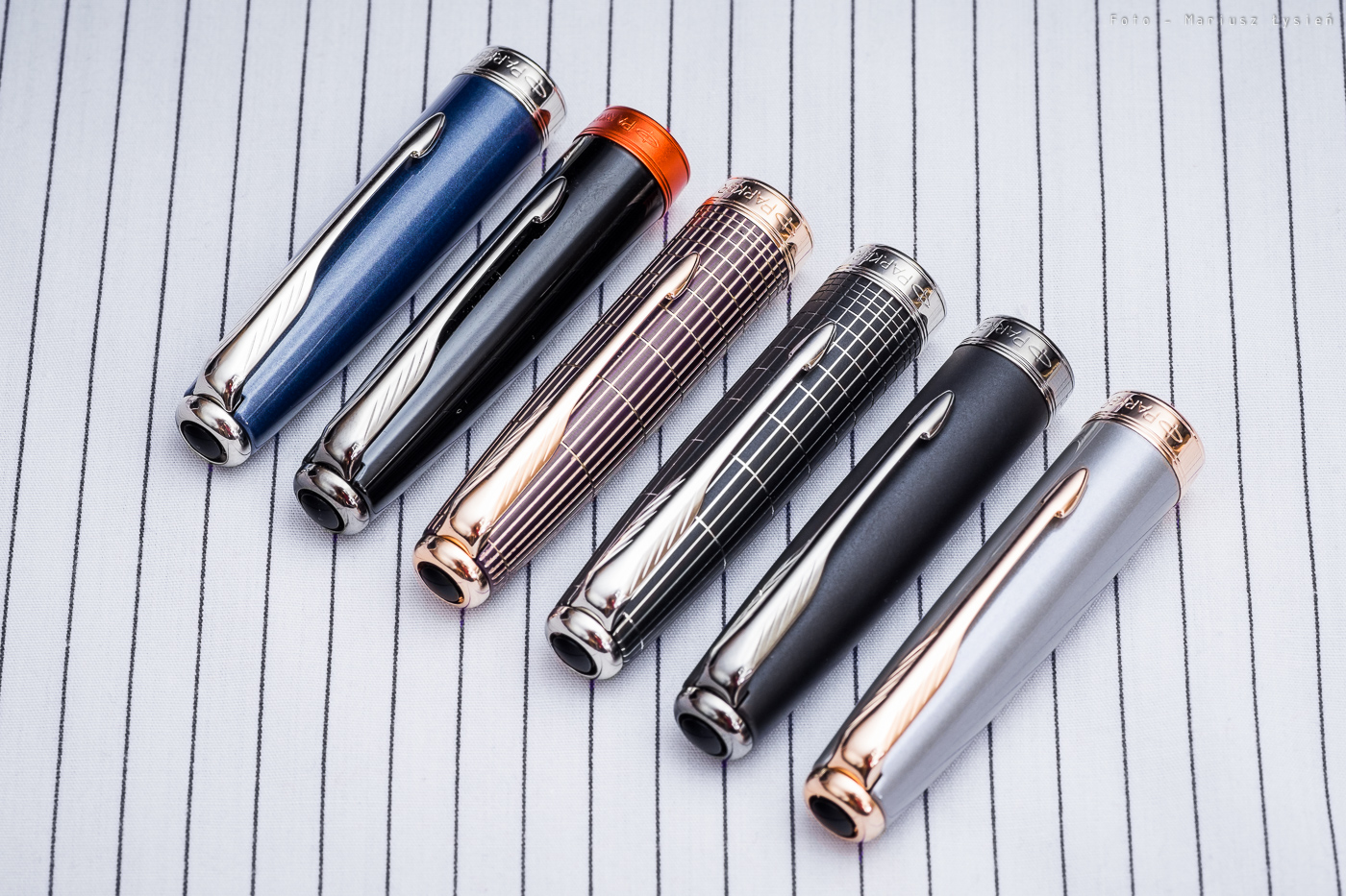 Jak widać na poniższych fotografiach, klient ma do wyboru wiele wariantów kolorystycznych. Co więcej – produkowane są jeszcze inne, których na zdjęciach brak, lecz jak wspomniałem – sprawa dotyczy wariantów najnowszych. Na poniższej fotografii widać również zestawienie piór wiecznych wraz z długopisami w danym kolorze, jednak z uwagi na specyfikę strony skupię się przede wszystkim na piórach wiecznych.