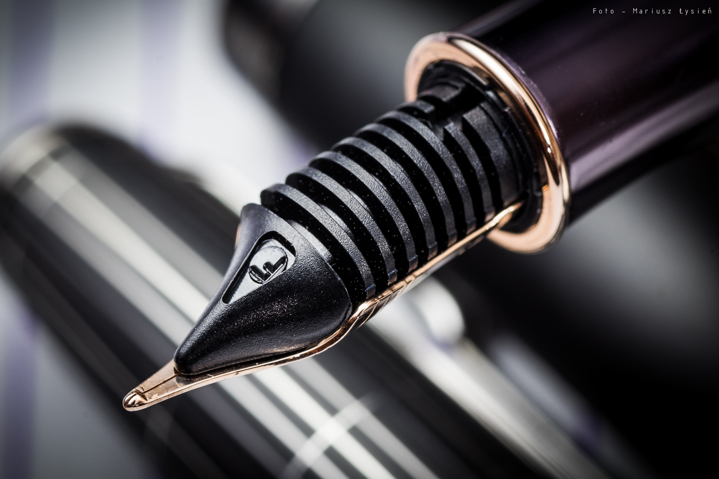 Pióra zasilane są za pomocą naboi (firmowych) bądź konwertera. Jeżeli chodzi o dokładniejszy test, to wybrałem wariant „Secret Black Shell”. Jego czarny, matowy korpus ciekawie współgra z rutenowanymi elementami metalowymi, takimi jak grawerowana laserowo sekcja, czy też wykonana z 18 karatowego złota stalówka. Uczciwie jednak muszę przyznać, że wszystkie warianty wyglądają ciekawie i gdybym miał „tu i teraz” zadecydować, który miałbym kupić, to byłaby to bardzo trudna decyzja. Bardzo fajnie prezentują się moim zdaniem również Secret Blue Shell oraz w pewien sposób minimalistyczny Subtle Big Red.