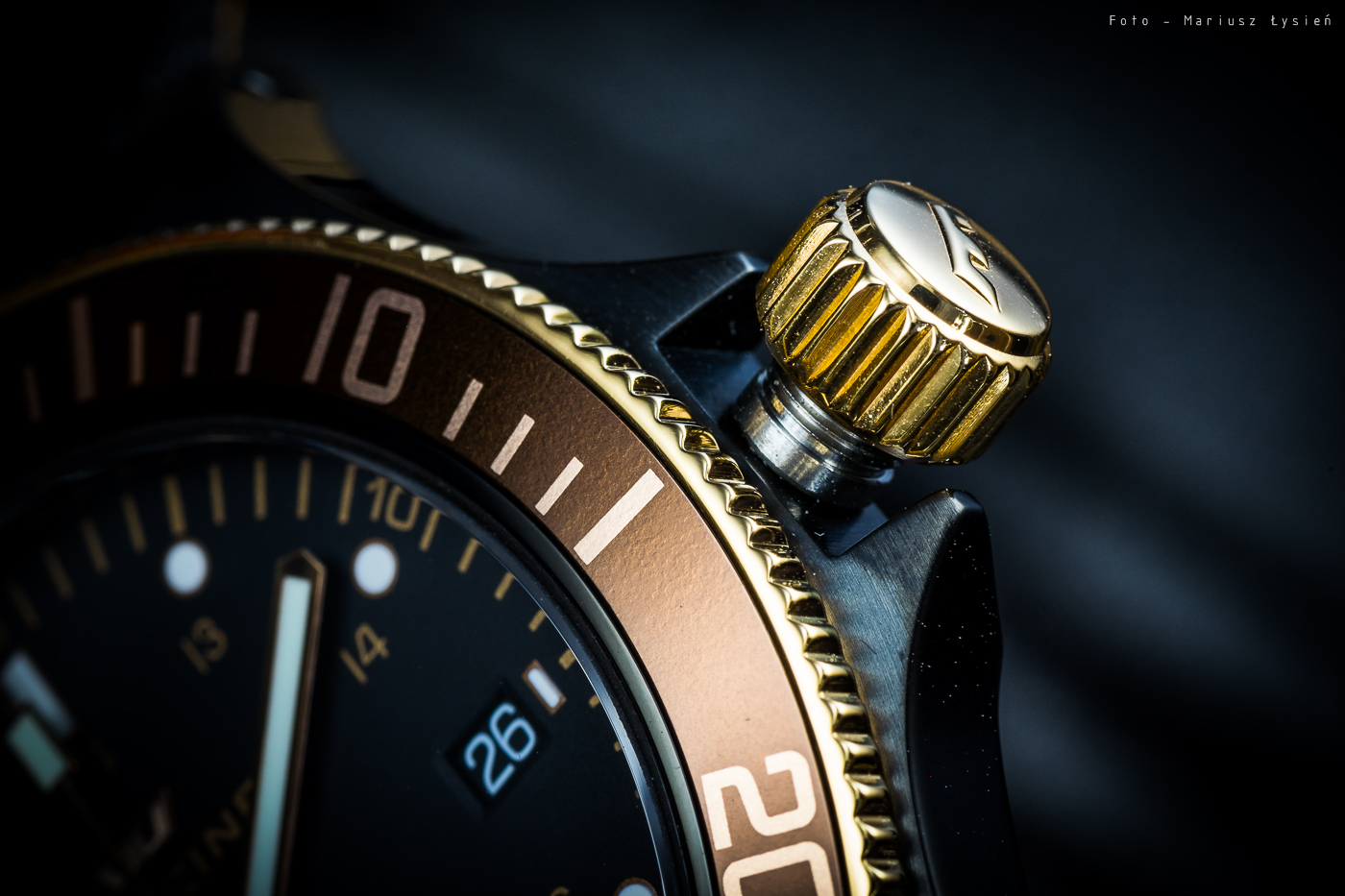 Co zatem wyróżnia model o tajemniczej nazwie Golden Eye? Z pewnością jest to ciekawa kolorystyka. Na rynku rzadko widujemy, można by rzec, totalne połączenie koloru czarnego oraz złotego (a dokładniej barwy elementów pokrytych różowym złotem za pomocą PVD). Czarna jest tarcza, jak i koperta, której stalowy rdzeń pokryto również powłoką. Z tego zestawienia delikatnie wyłamuje się barwa pierścienia lunety. Jego ciemnoczekoladowy kolor stanowi ciekawy element spajający czerń oraz wykończenia w kolorze różowego złota. Całość prezentuje się świetnie. Z pewnością jest to bardzo udany wariant modelu SUB.