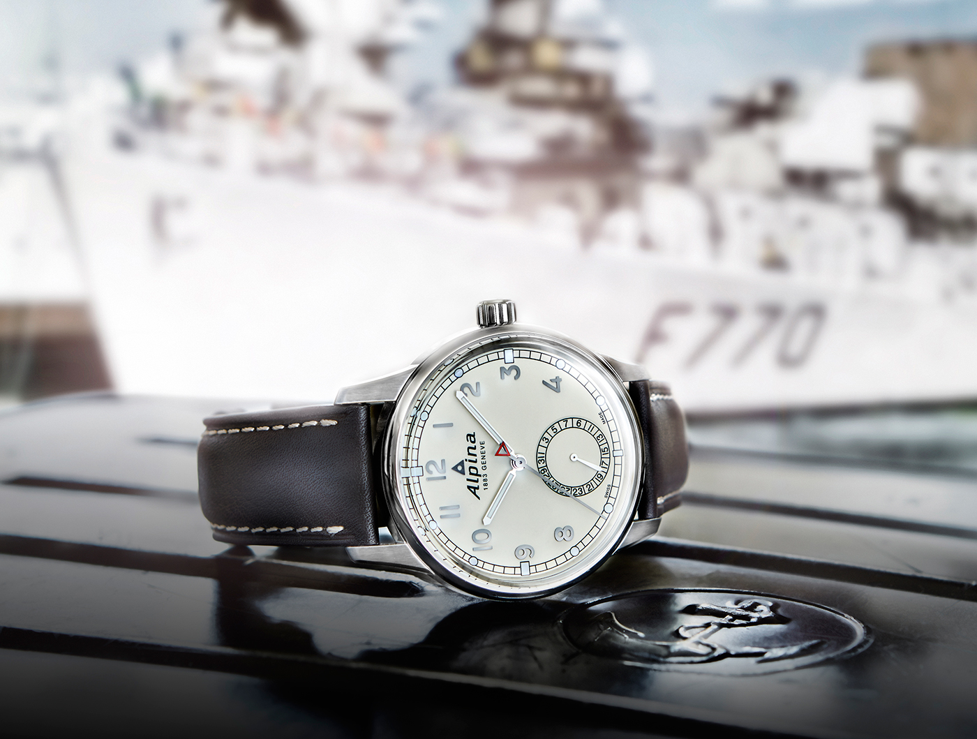 Tarcza może być kolory białego bądź kremowego. W obu przypadkach, na jej skraju odnajdziemy podziałkę minutową typu „railtrack”. Całość uzupełniają nakładane indeksy godzinowe oraz sub-tarcza datownika zlokalizowana na godzinie 6. Proste w kształcie wskazówki otrzymały wypełnienie z materiału luminescencyjnego. Charakterystyczne dla zegarków firmy Alpina jest także zwieńczenie sekundnika w formie zabarwionego na czerwono trójkąta. Cyferblat jest chroniony przez szkło szafirowe.