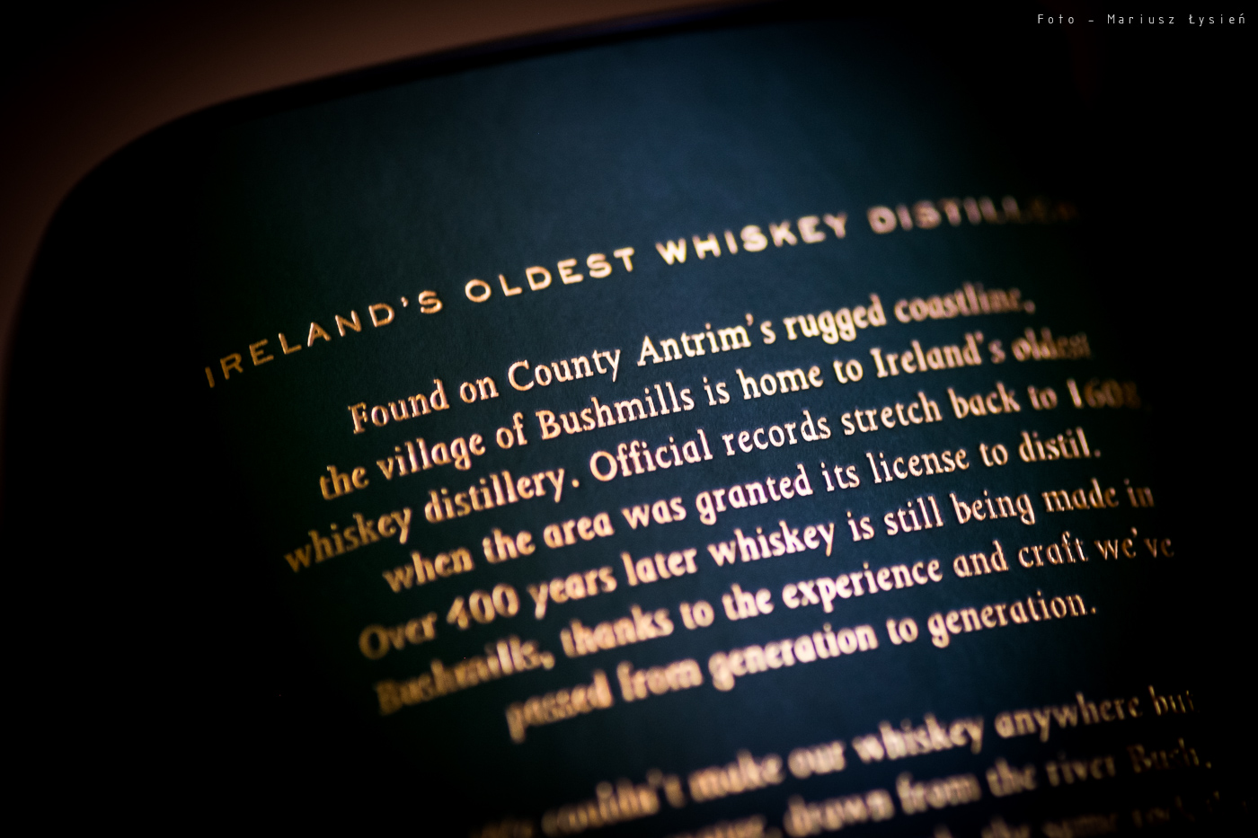 Jeżeli ktoś chce zacząć przygodę z whisky single malt, to jedną z najczęstszą propozycji jest właśnie tytułowy trunek. Charakterystyczna dla Bushmillsa butelka posiada równie rozpoznawalną etykietę. Producent od razu informuje za jej pomocą, że alkohol leżakuje w dwóch rodzajach beczek tj. w beczkach po bourbonie oraz po oloroso sheryy, dla nadania trunkowi bogatszego aromatu. Potrójna destylacja również podkreślona na opakowaniu oraz etykiecie to można powiedzieć „znak rozpoznawczy” whisky irlandzkiej.