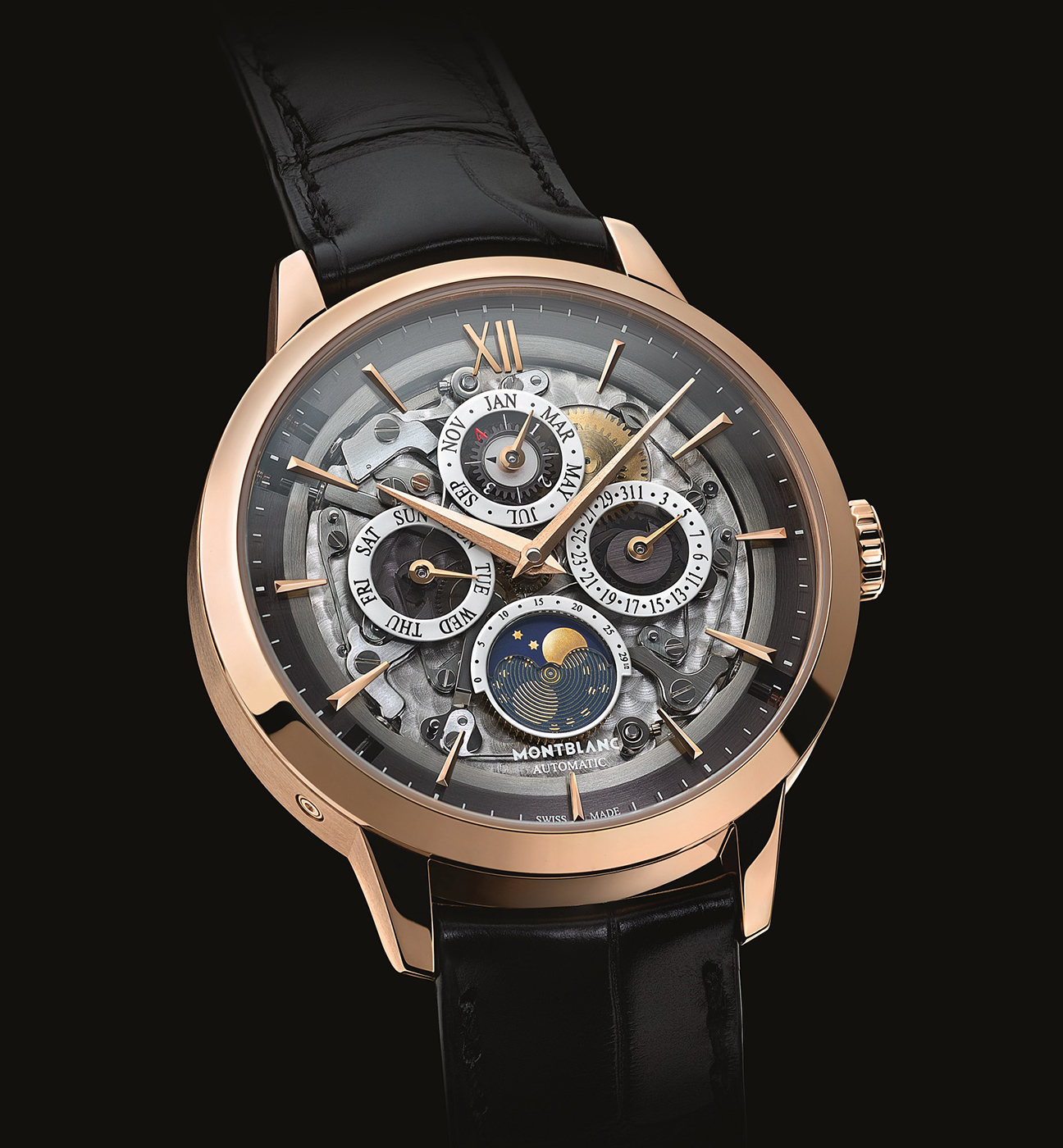 Poza centralnie osadzonymi wskazówkami pokrytymi 18K różowym złotem (których powierzchnia łączy płaszczyzny szczotkowane oraz polerowane), rozmieszczono na tarczy również elementy odpowiedzialne za wskazania wiecznego kalendarza. Dzięki nim możemy odczytać aktualny dzień miesiąca, miesiąc, bądź rok (oraz sprawdzić czy jest on przestępny). Oczywiście nie obyło się bez wskazania faz księżyca, które umieszczono na godzinie 6. Na uwagę zasługuje niezwykle dyskretne umieszczone logo producenta wraz z równie subtelnym napisem „AUTOMATIC”. Całość chroni szkło szafirowe, które pokryto warstwą antyrefleksyjną. Ten sam rodzaj szkła został użyty w roli wypełnienia dekla.