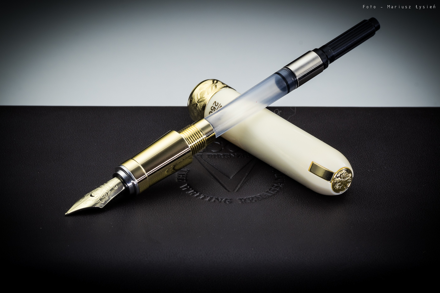 Wszystkie elementy metalowe są pozłacane. W tym samym kolorze utrzymano także wykonaną ze stali nierdzewnej stalówkę. Dostępna jest również wersja (tym razem limitowana do 500 egzemplarzy) z wykończeniami w kolorze stali. Szerokość stalówki w opisywanym egzemplarzu to „F”. Jest to ta sama stalówka, którą testowałem niedawno w modelu Van Gogh „Room in Arles”. Stalówki te nie należą do najmiększych i nie oferują większej palety możliwych do osiągnięcia grubości linii, ale piszą naprawdę przyjemnie i gładko. Pióro możemy zasilać za pomocą naboi, bądź dołączanego w zestawie konwertera.